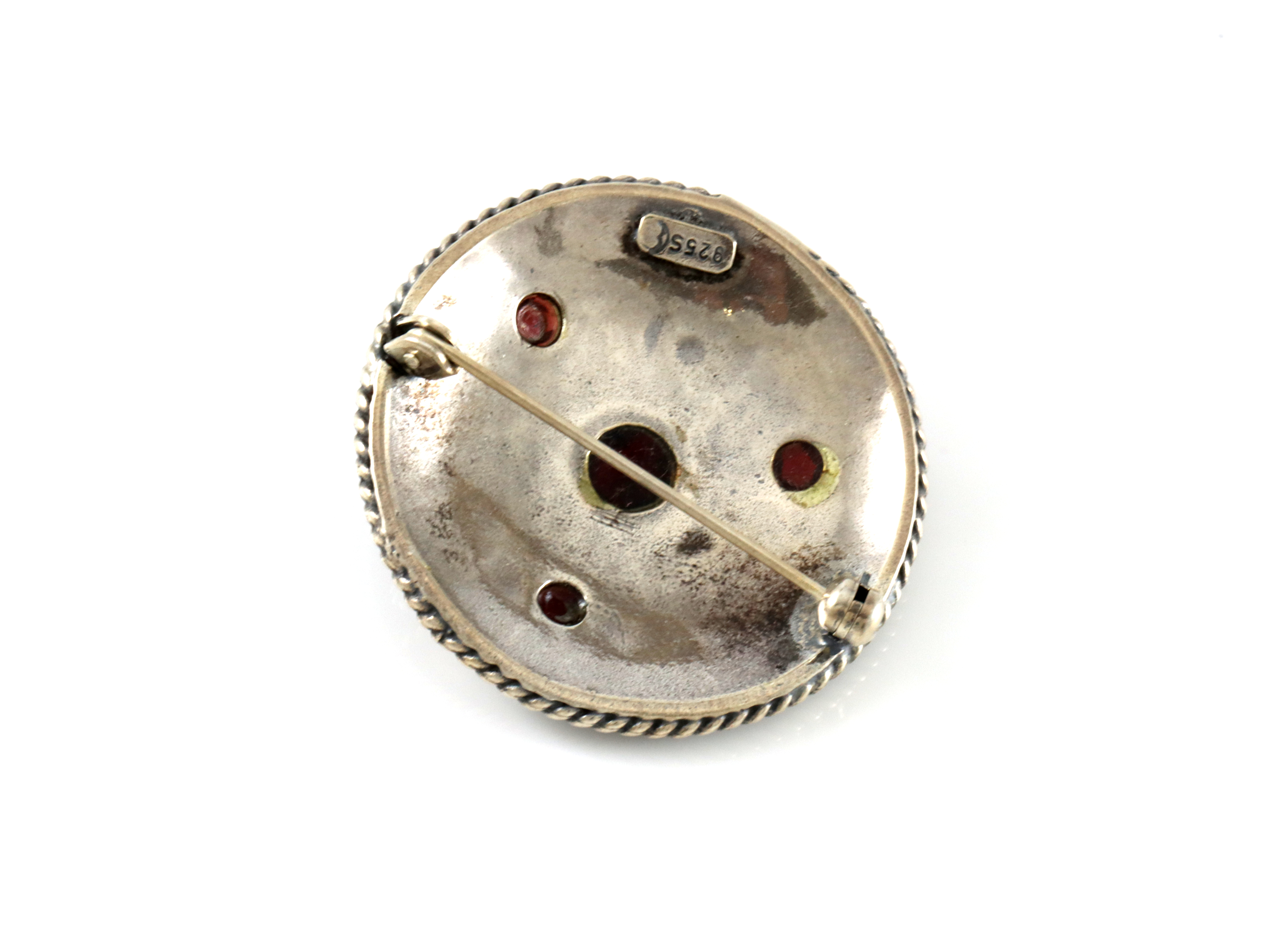 Sølje i oksidert sølv med fire rød steiner. Produsert av Huldresølv (Huldreverket) 3,7 x 3,7 cm Nåla er noe løs men har ingenting å si for bruken. Ørlite hakk i en stein.