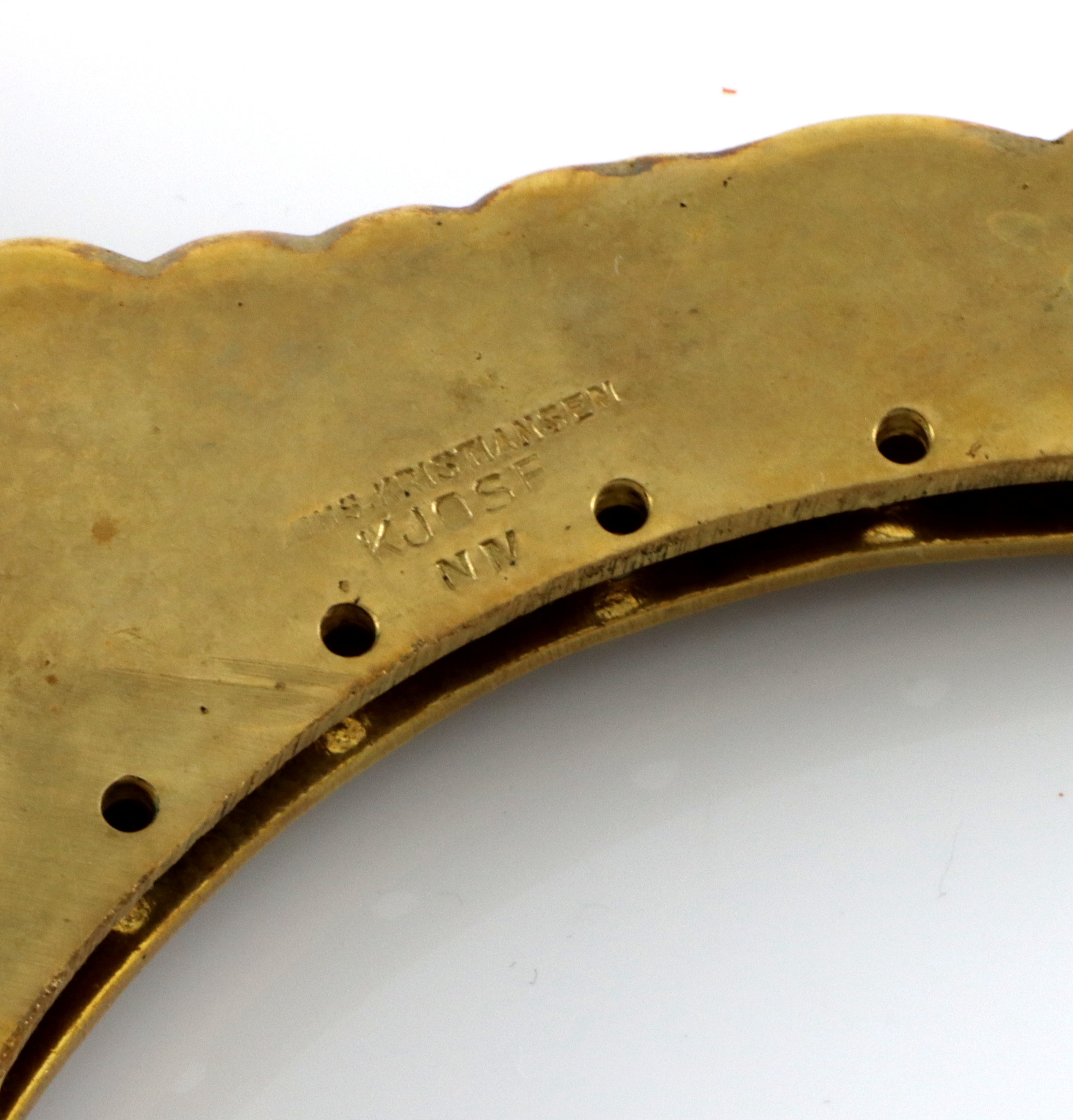 Veskelås i bronse fra Johs. Kristiansen Str: 115 x 135 mm I god stand Nyprisen ligger på 2600,-