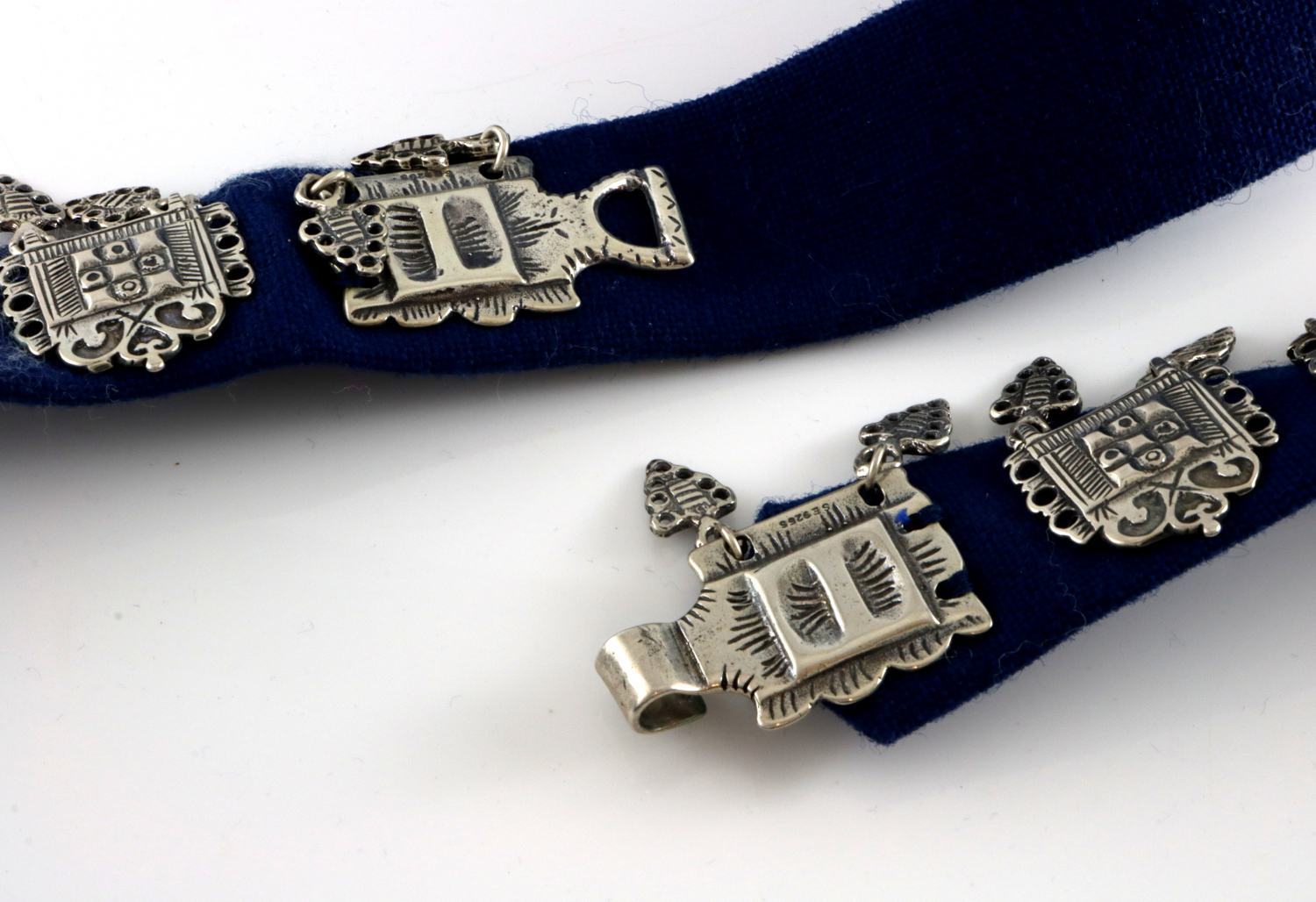 Blått belte til Romeriksbunden med 20 støler Bredde: 43 mm Sølvdelen på beltet måler 72 cm Bruttolengden er 102 cm Fremstår tilnærmet ubrukt Nyprisen ligger på rundt 12700,-