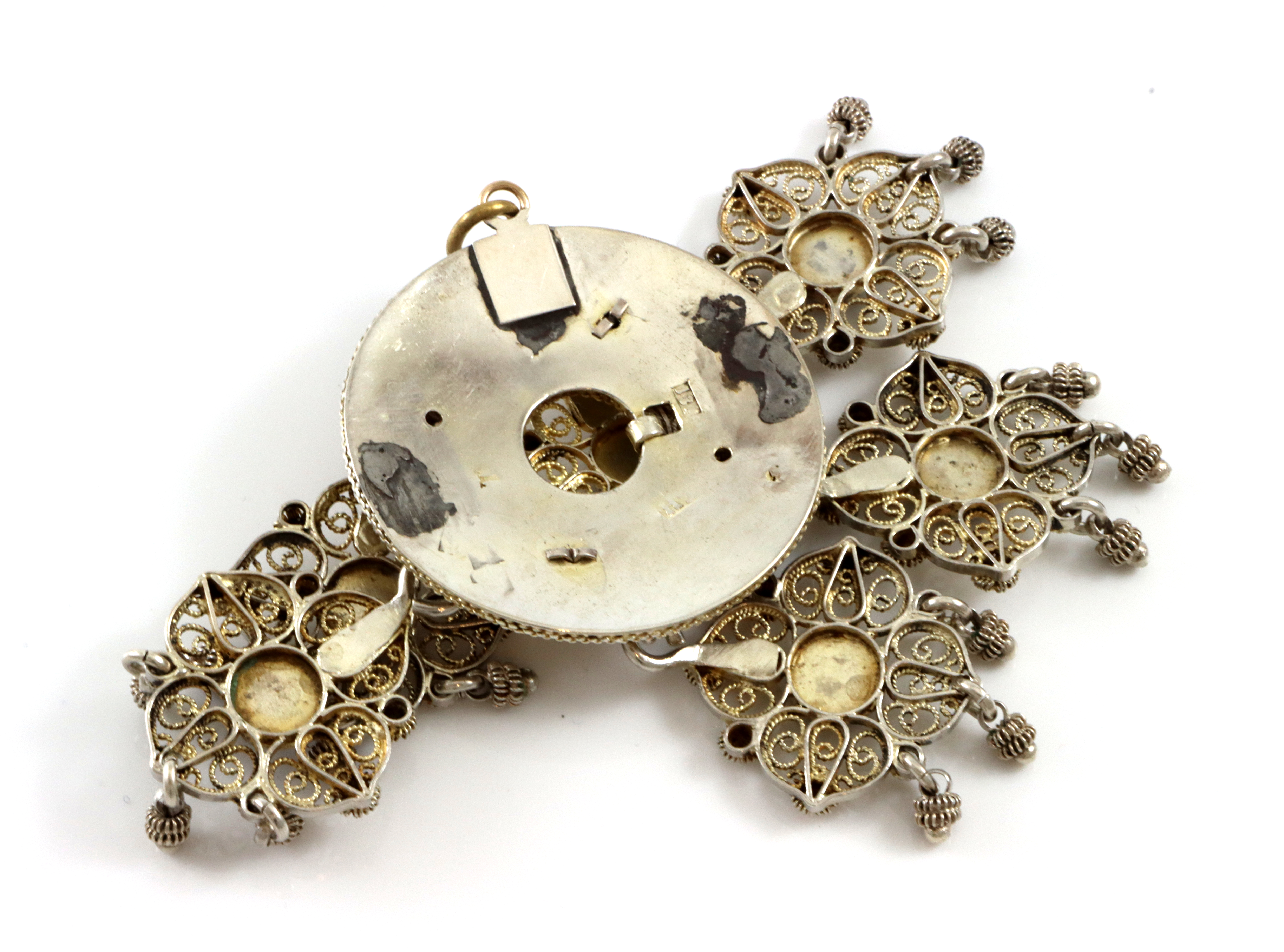 Morsomt bunadssmykke/agnus dei omgjort fra en sølje der de har fjernet nåla og satt på øsken (som ikke er sølv) Stemplet 13 1/4 samt et utydelig mesterstempel Str: 85 x 60 mm Aldersrelatert bruksslitasje samt tinnlodding men fremstår i bra stand