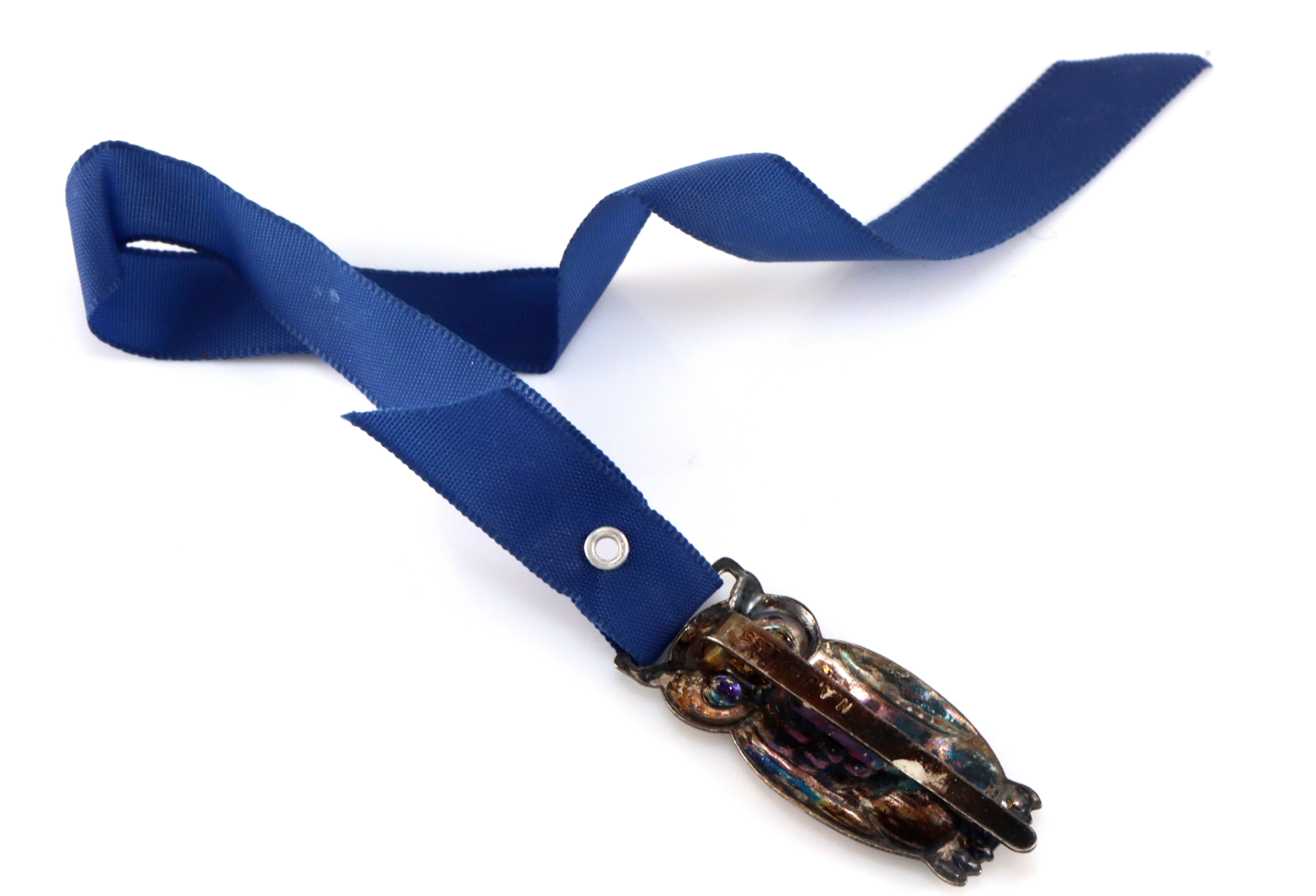 Ugle bokmerke i sølv med blått bånd, produsert av NAJ. Selve uglen er ca 3,5 cm lang, men med båndet er det totalt 23 cm.