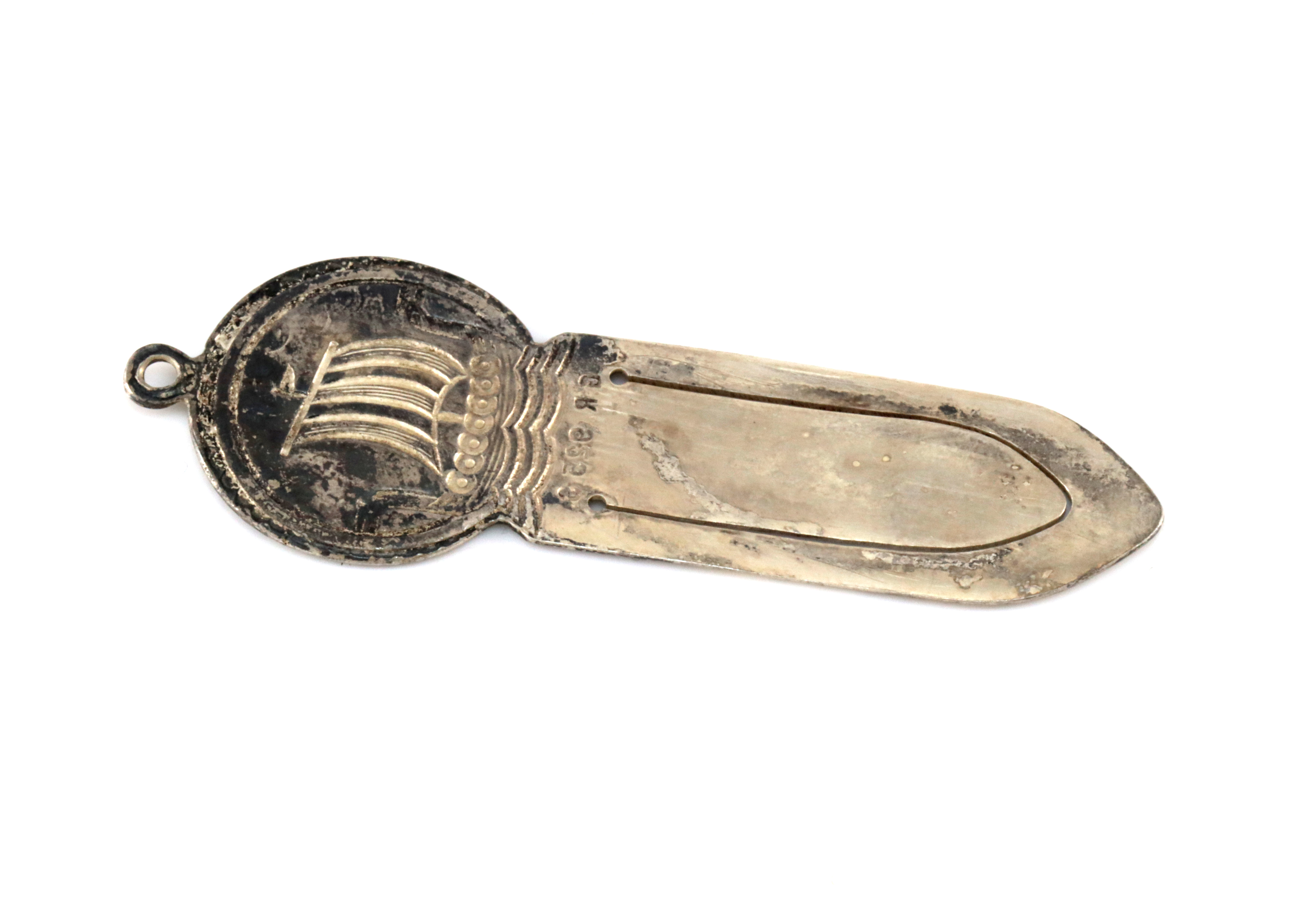 Bokmerke i sølv med vikingskip med emalje. Produsert av Georg Ruud. Bokmerke er 5,4 cm langt, mangler trolig en dusk på toppen.
