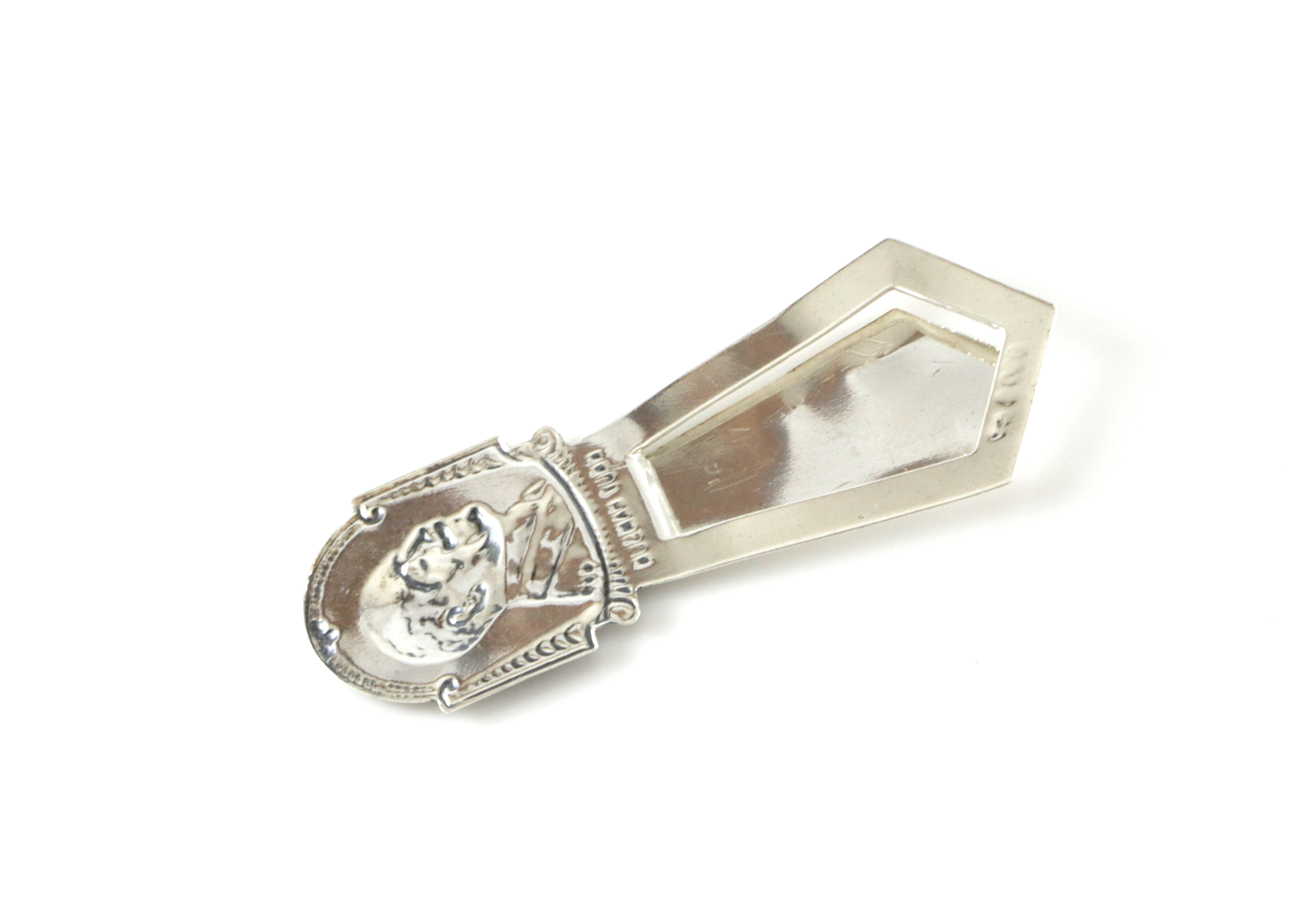 Bokmerke i sølv med motiv av Knut Hamsun (Disse finnes både i plett og sølv, dette er altså sølvversjonen) 5,9 cm langt Noe buklete på nedre del