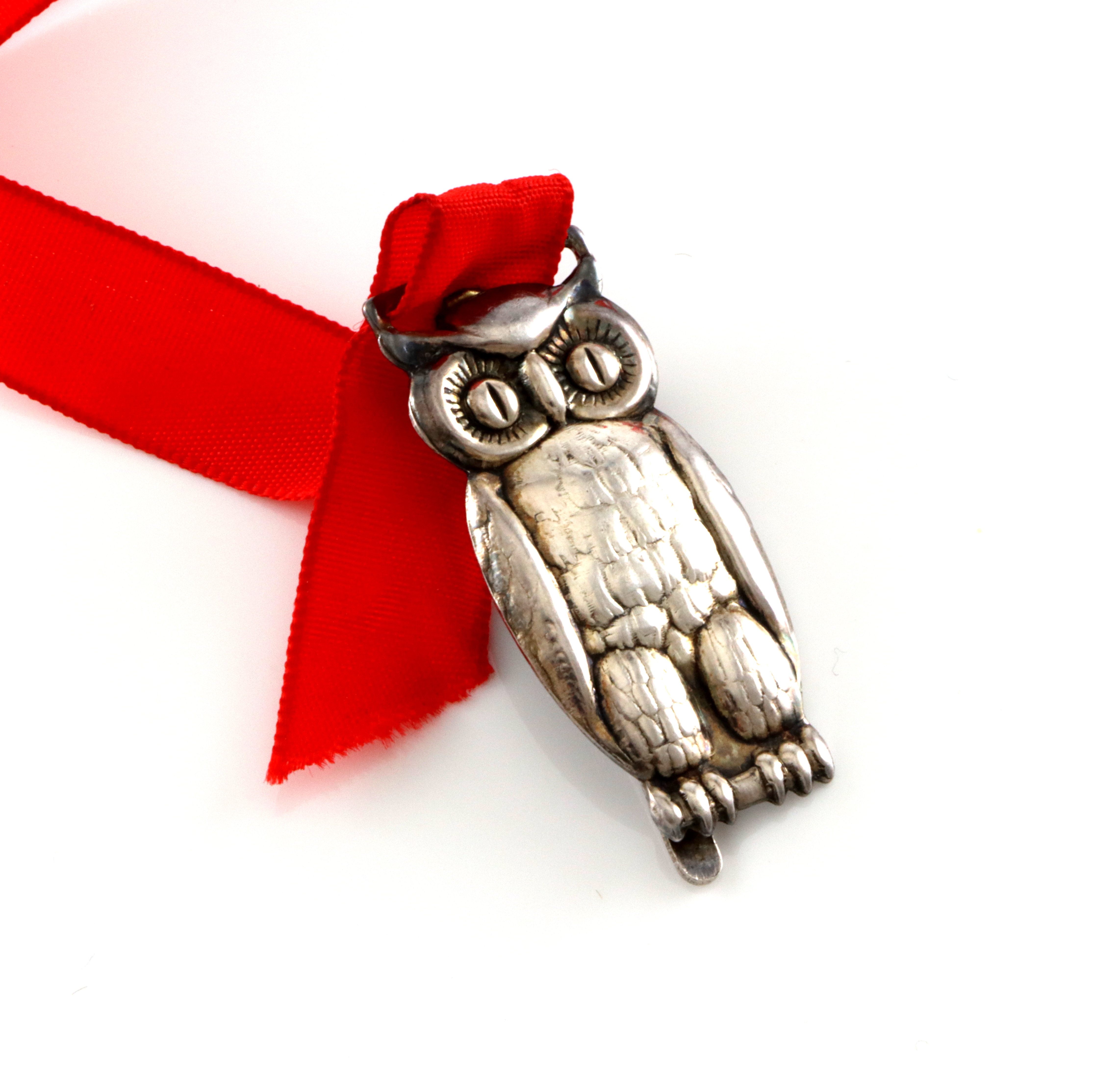 Ugle bokmerke i sølv med blått bånd, produsert av NAJ. Selve uglen er ca 3,5 cm lang