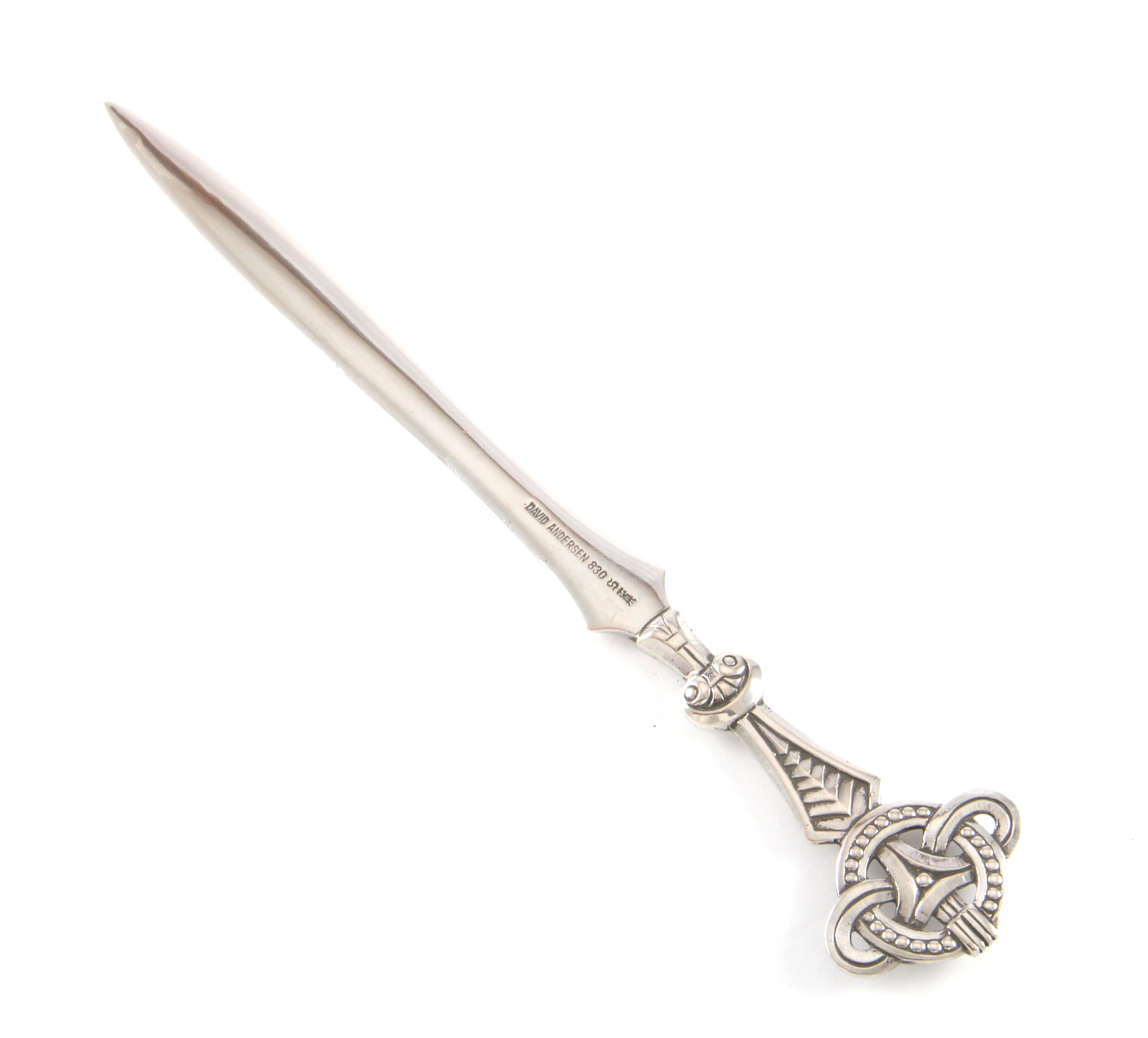 Brevåpner i sølv produsert av David-Andersen, muligens Gaudernack som står bak designet. 18,5 cm lang, 3,2 cm bred på toppen. "Eyvind" beskjedent gravert inn på ene siden.