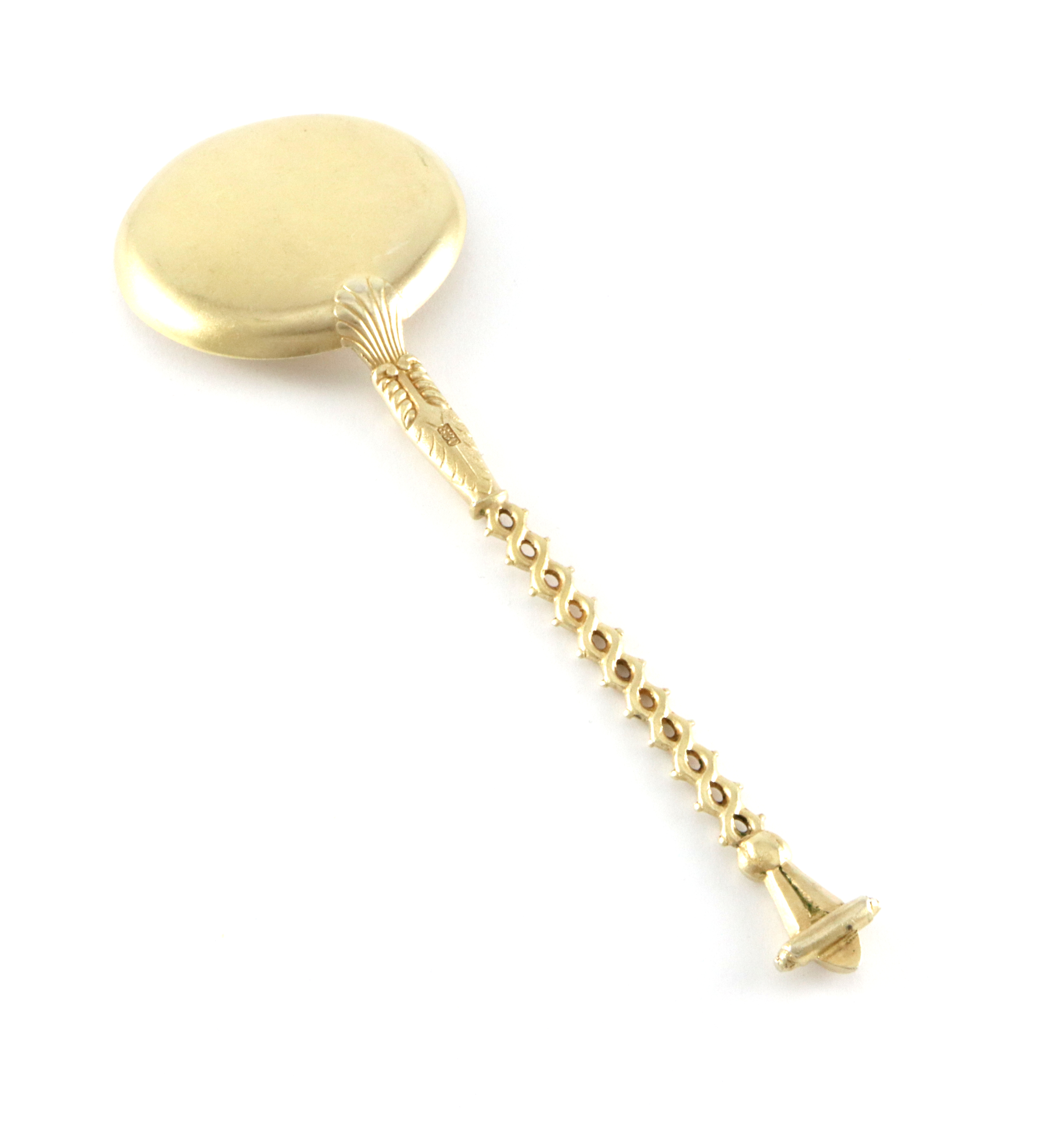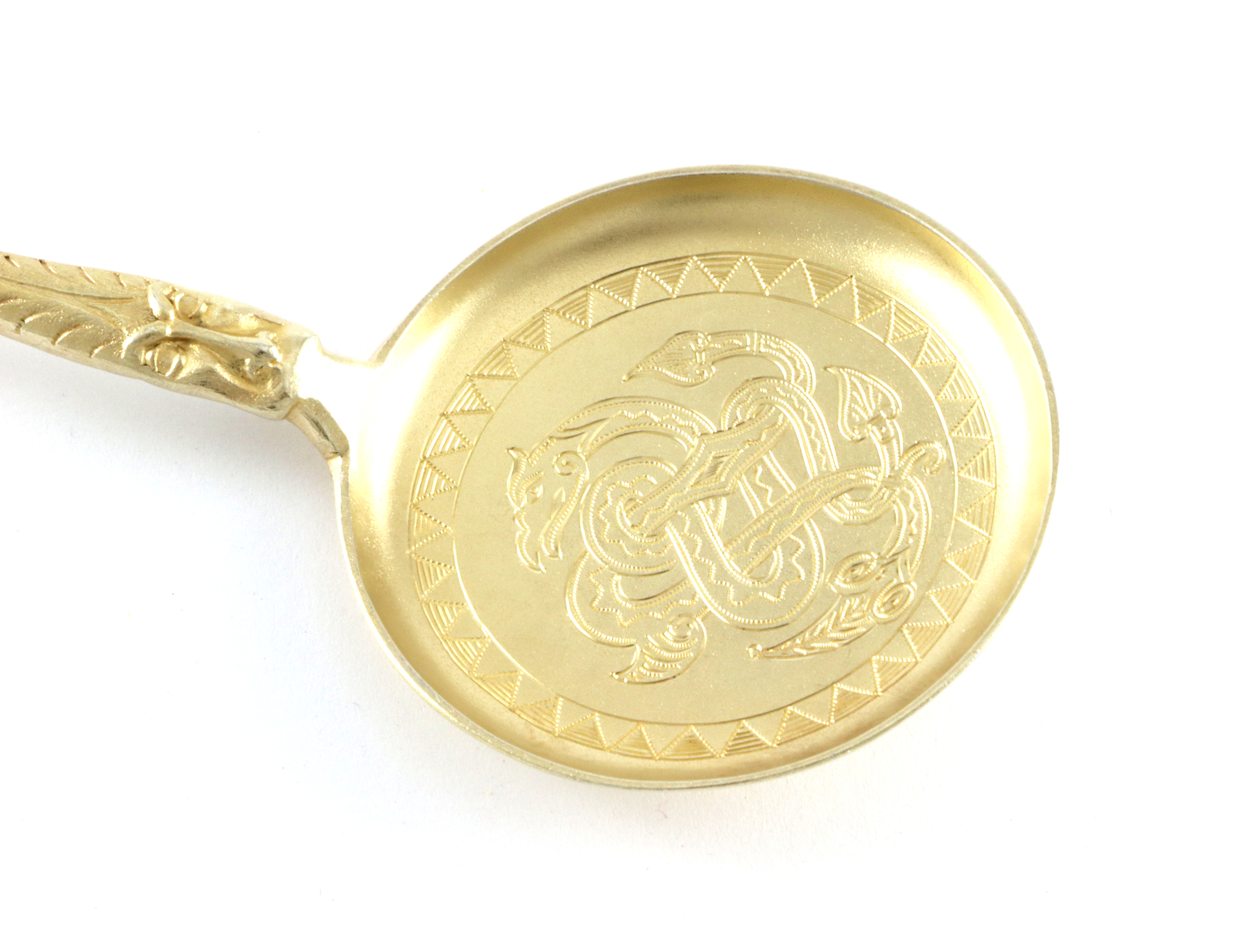 Skje i 830 sølv. Forgylt. Gravert mønster i dragestil
