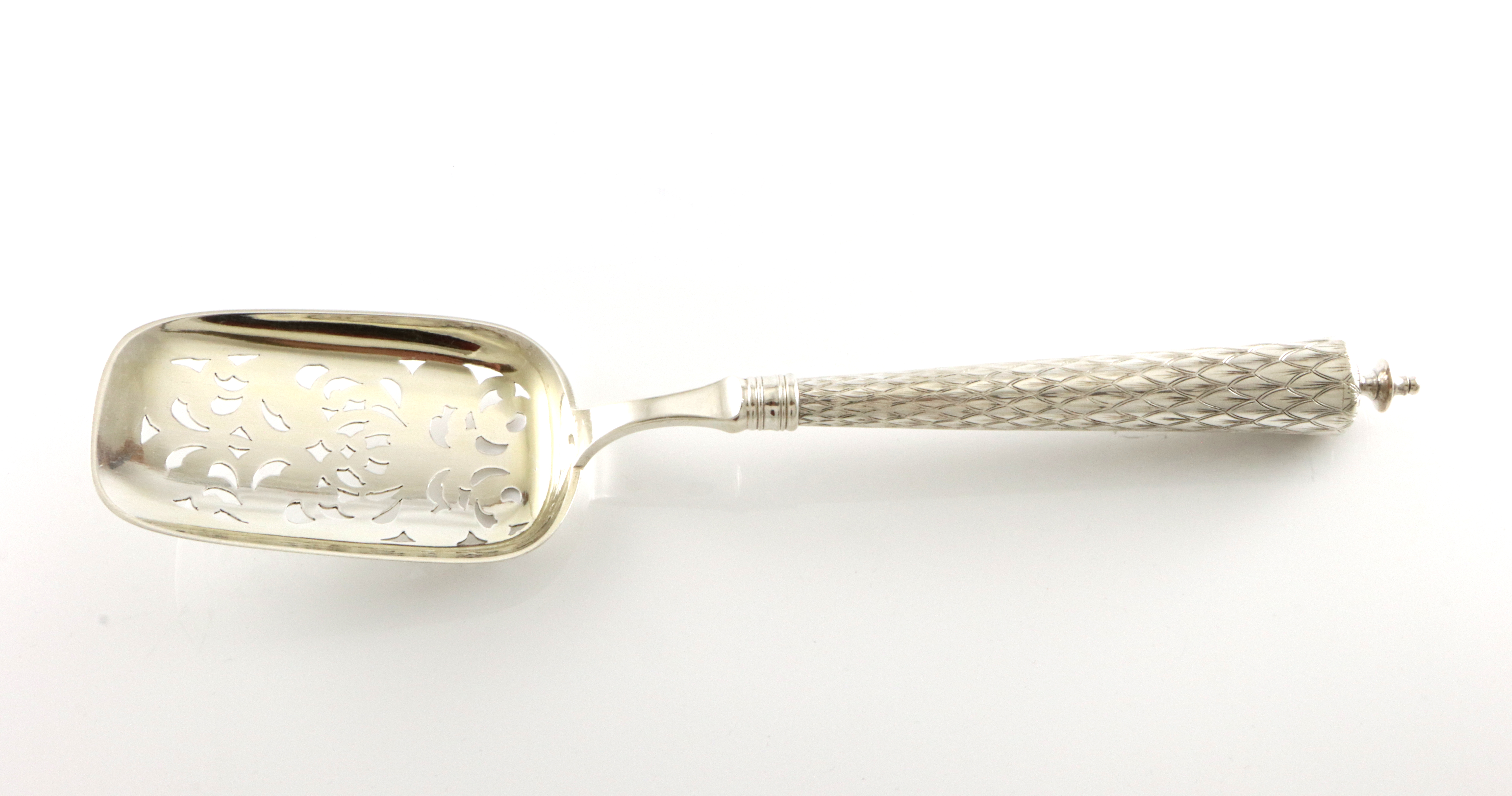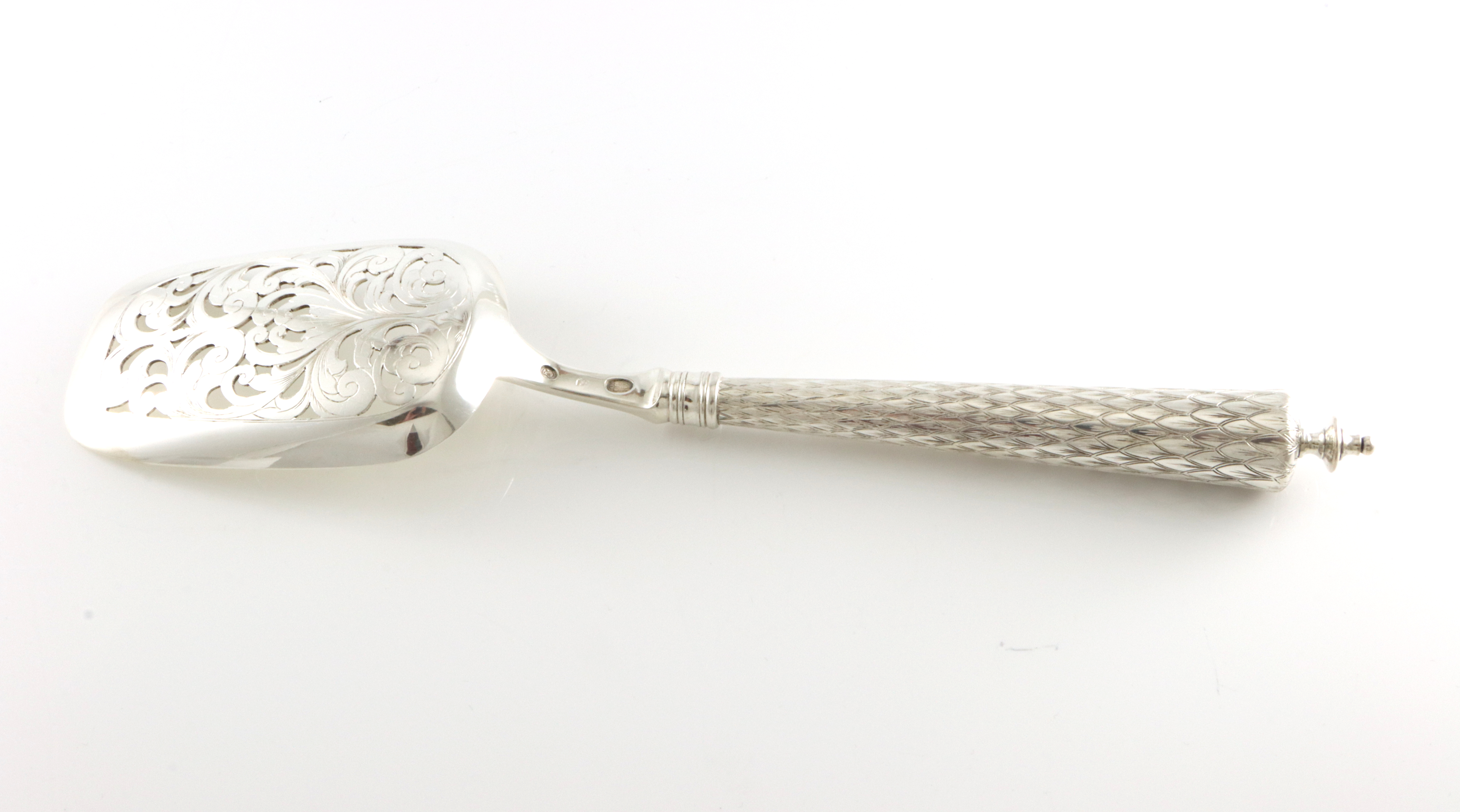 Stor og flott jordbærskje i 830 Sølv, Danmark 1879 Rundt skaft Lengde: 28,5 cm I svært god stand