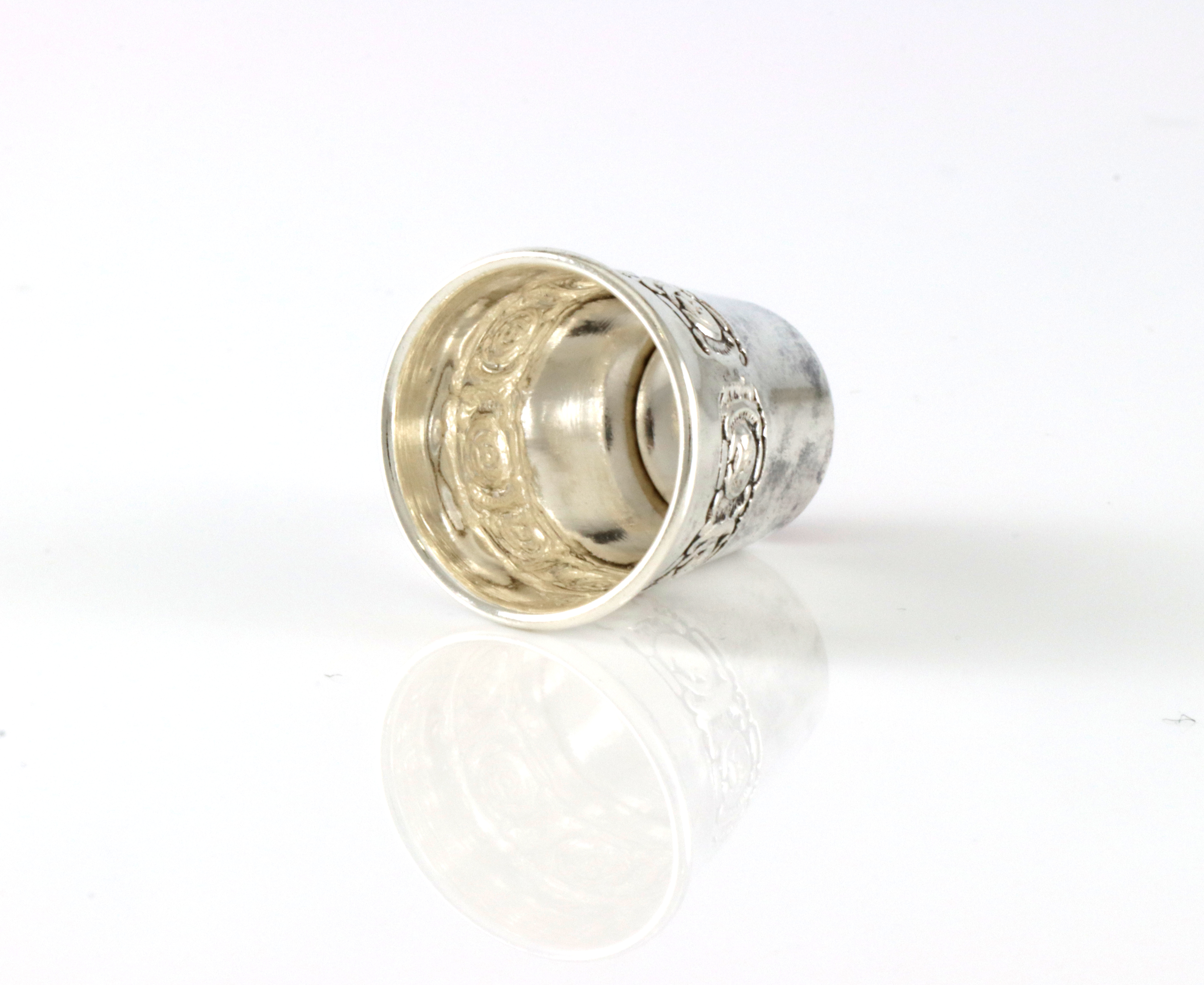 Fingerbøl i sølv med rød "stein". Dekor i rundt Ca 2,0 cm høyt