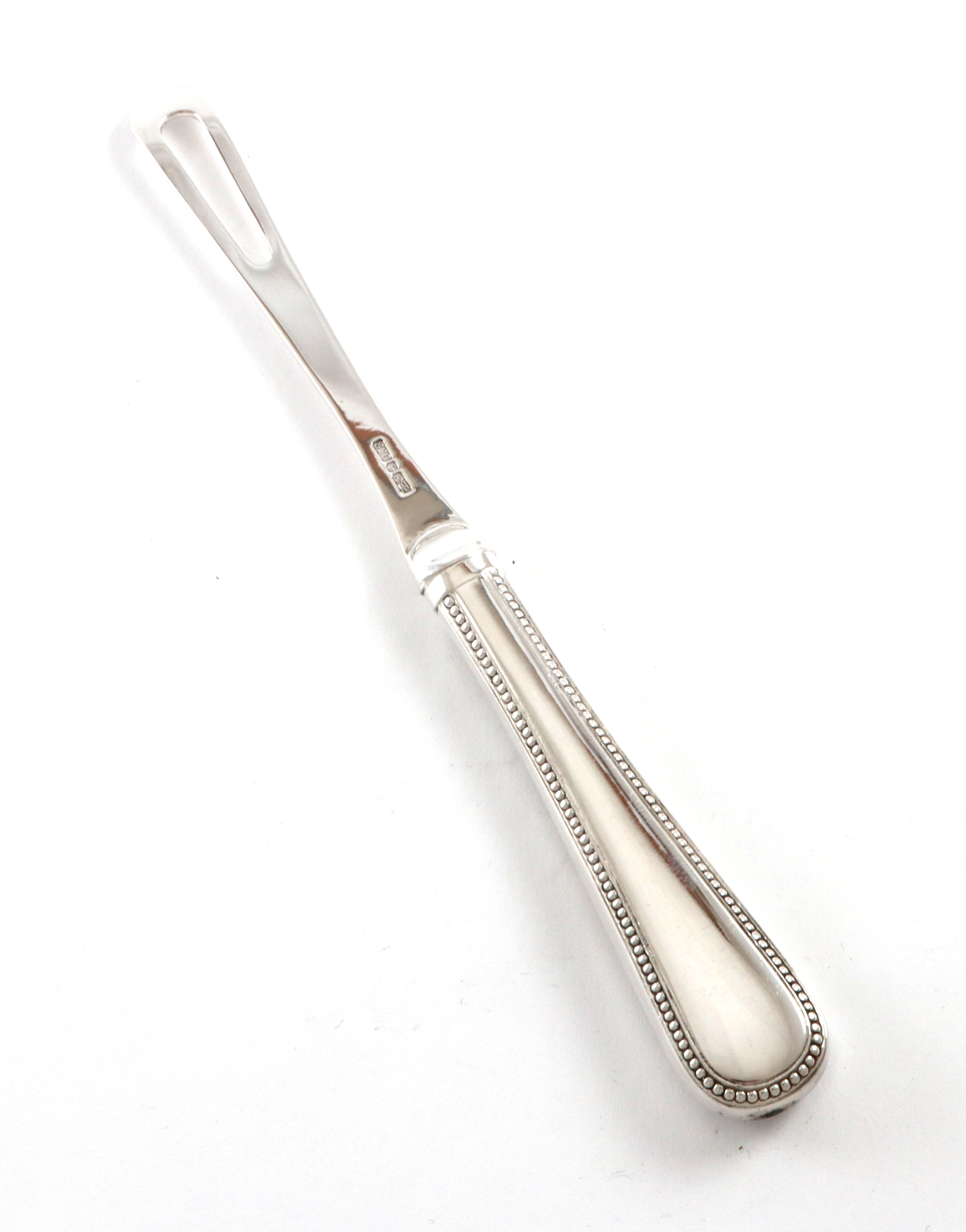 David-Andersen skalldyrgaffel i sølv. Gammelstemplet Ukjent om mønsteret har noe navn. 15,0 cm lange, enkelt monogram på forsiden. Noe skjevheter i hullet etter bruk på enkelte.