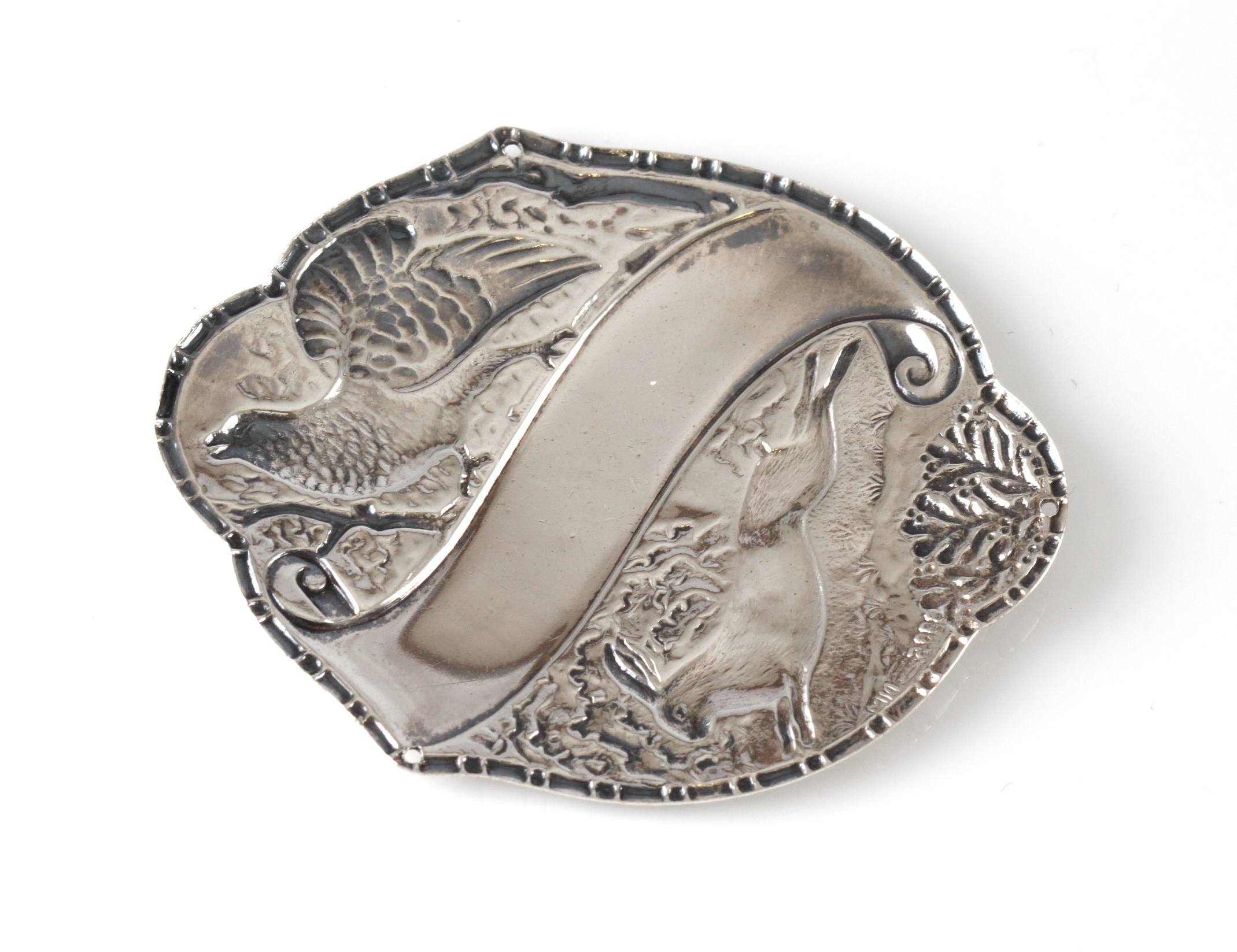 Frakkeskjold i sølv med motiv av tiur og hare. Mannsnavn 5,8 x 4,7 cm
