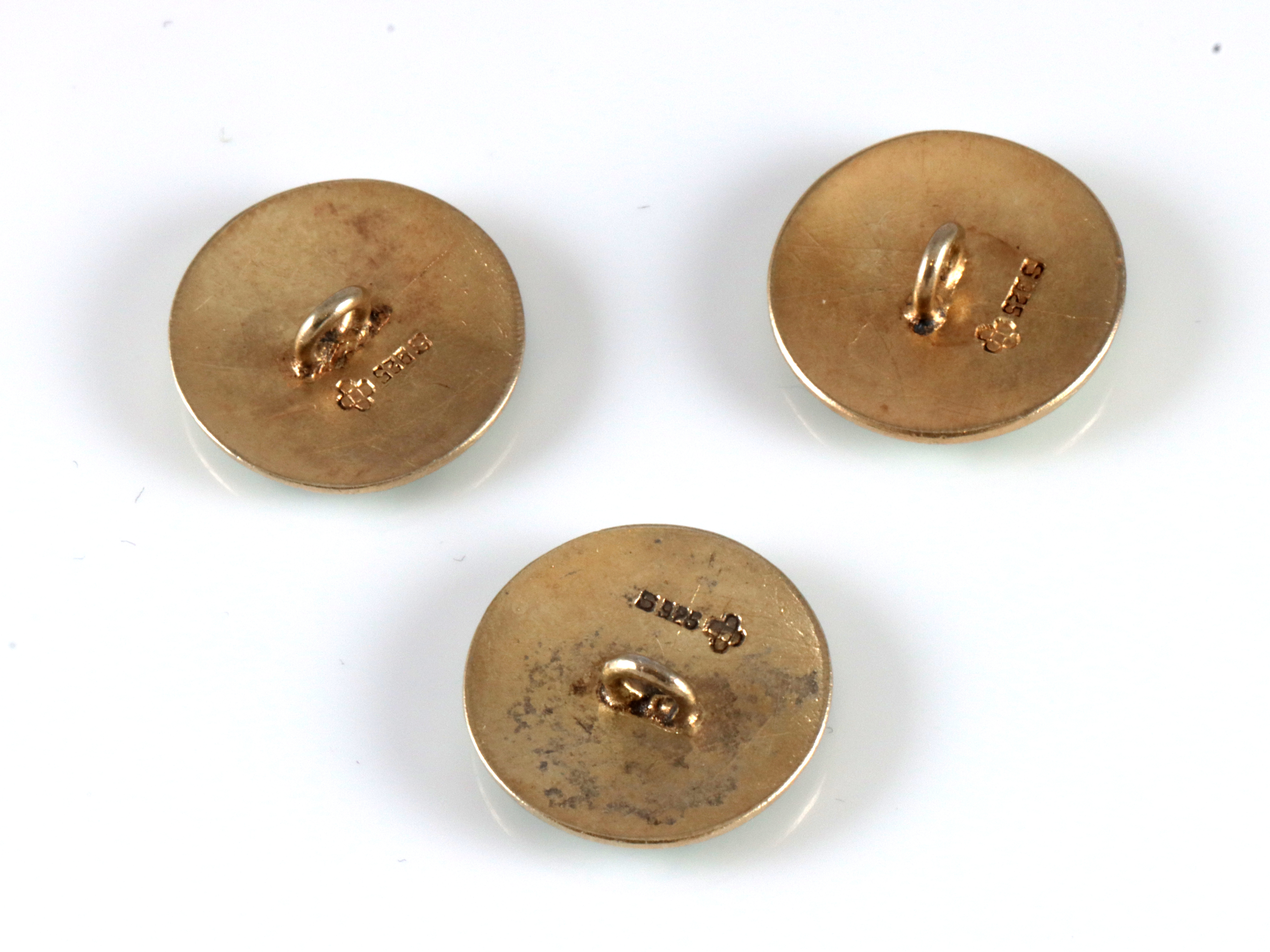 Lot med tre stk emaljerte knapper i forgyldt sølv.. Motiv av blåklokke Produsert av Ole Olberg. 1,7 x 1,7 cm