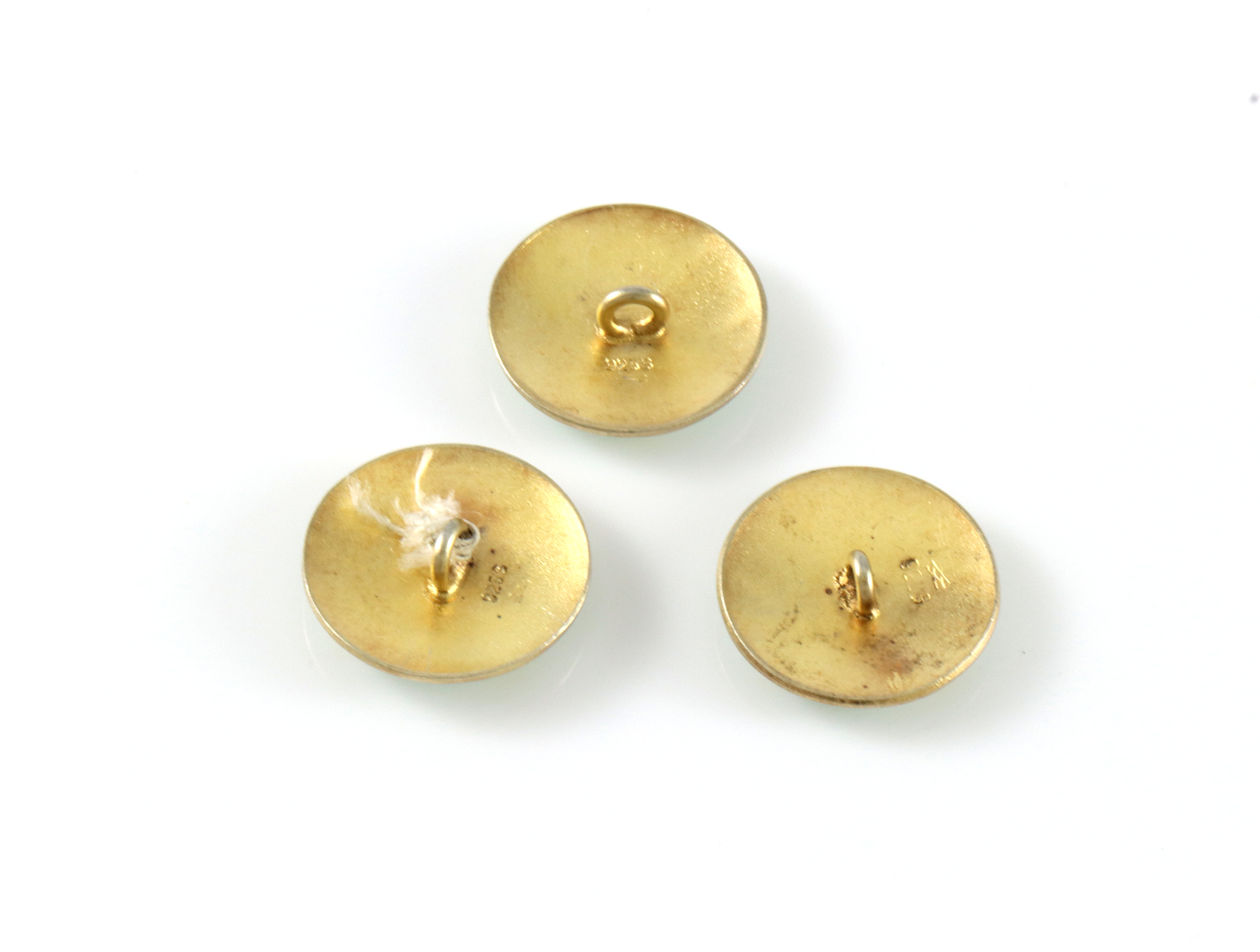 Tre flotte knapper i forgylt sølv og flerfarget emalje. Motiv av stemorsblomst. Produsert av Aksel Holmsen. 1,6 cm store