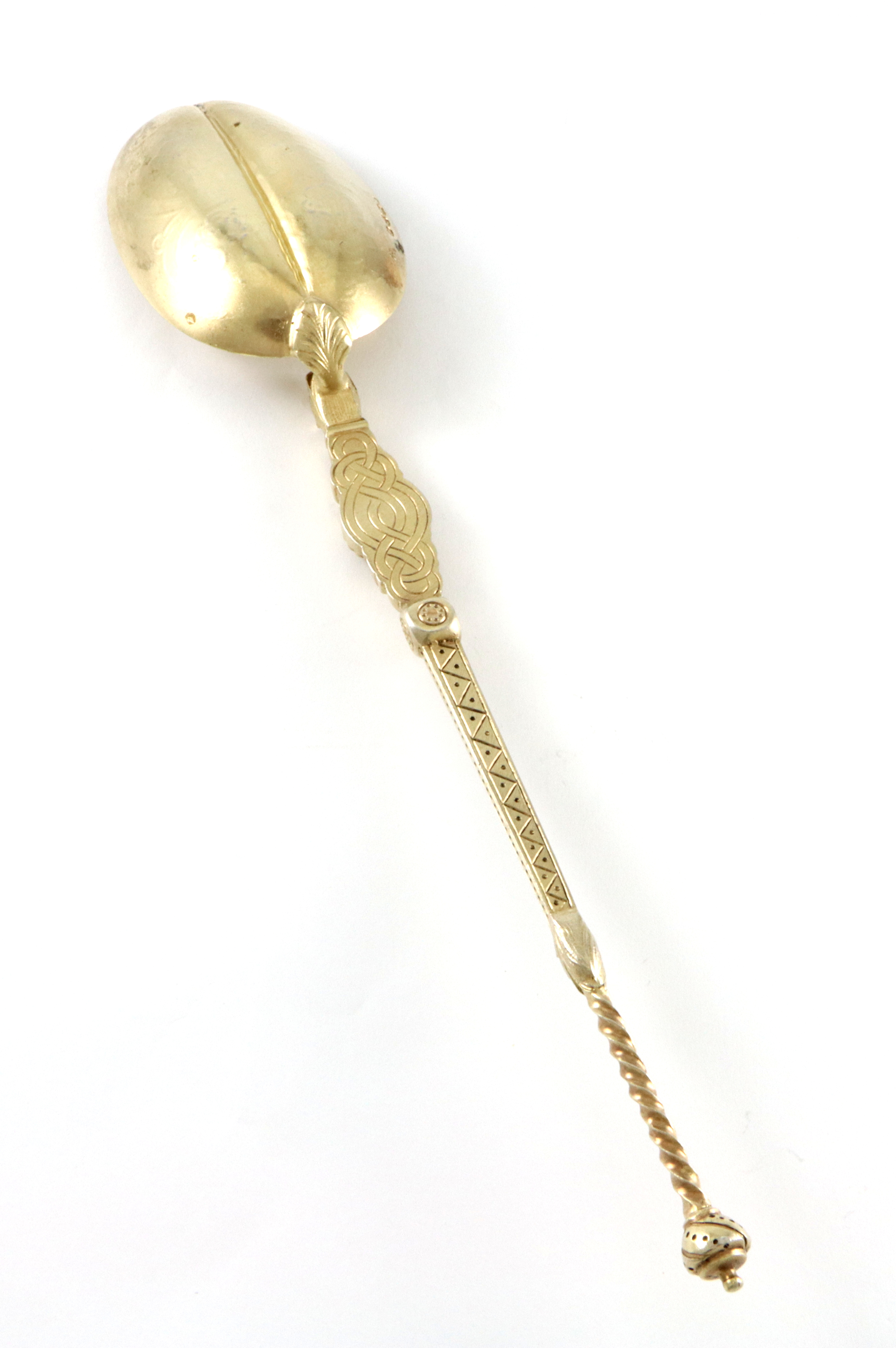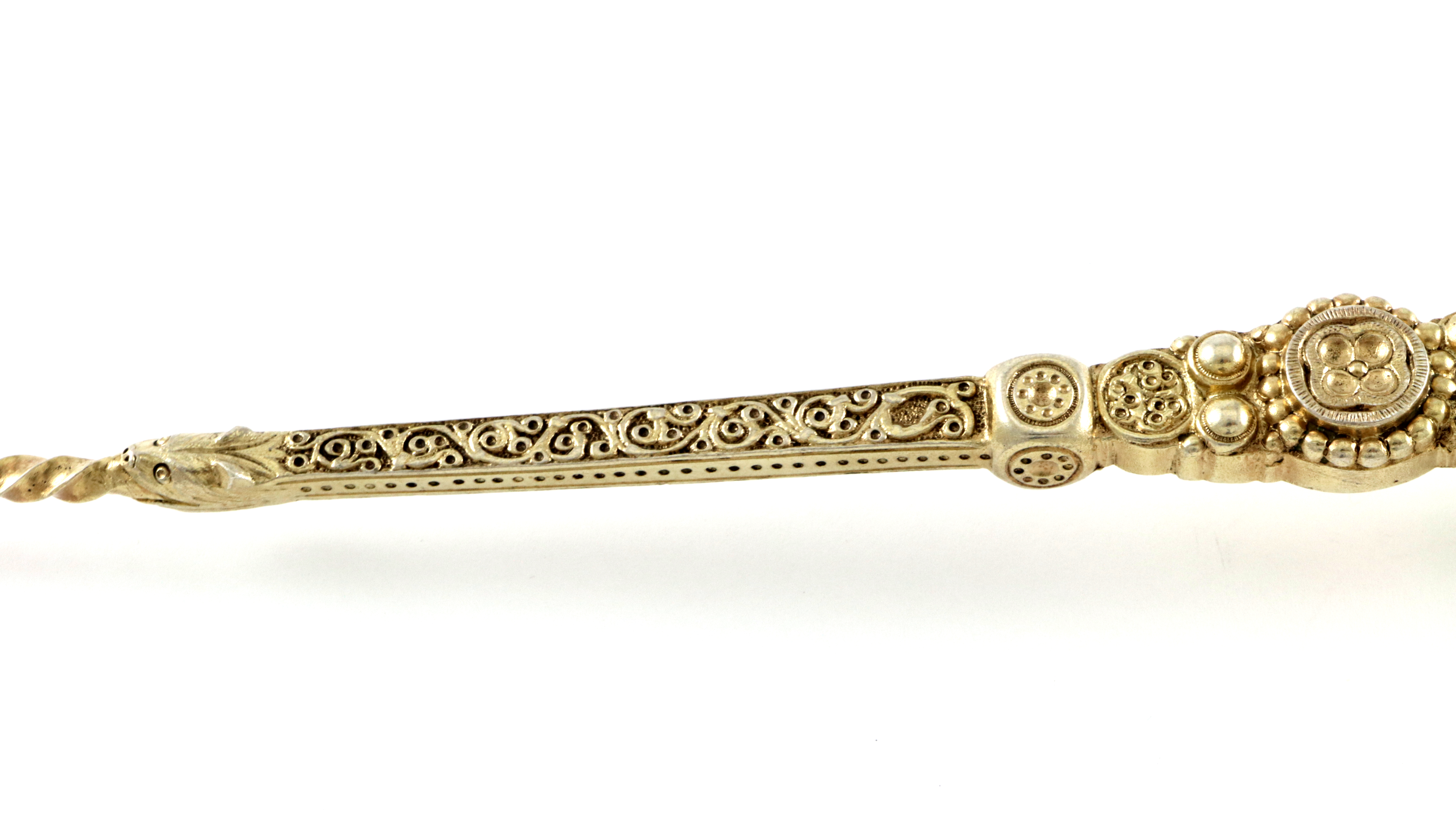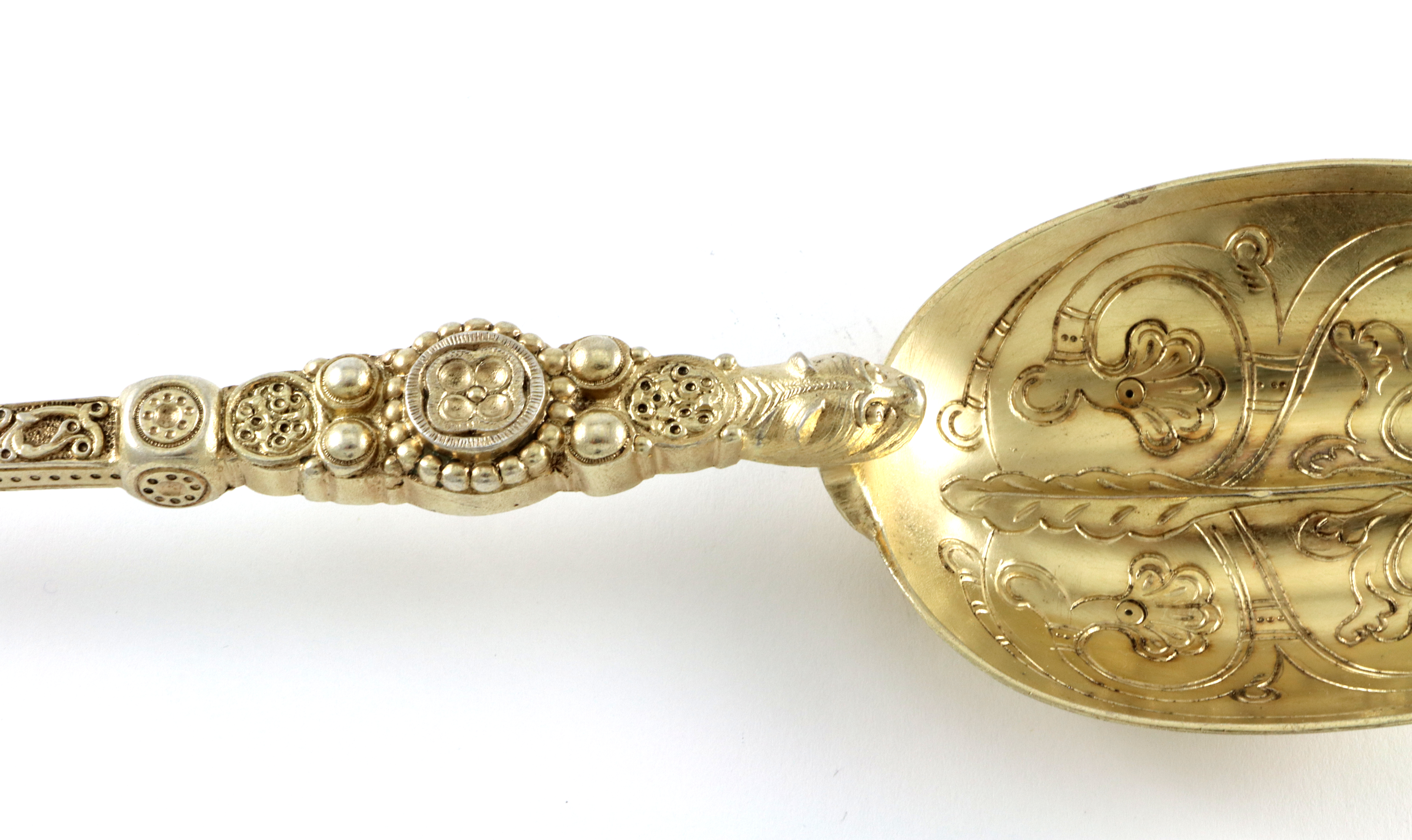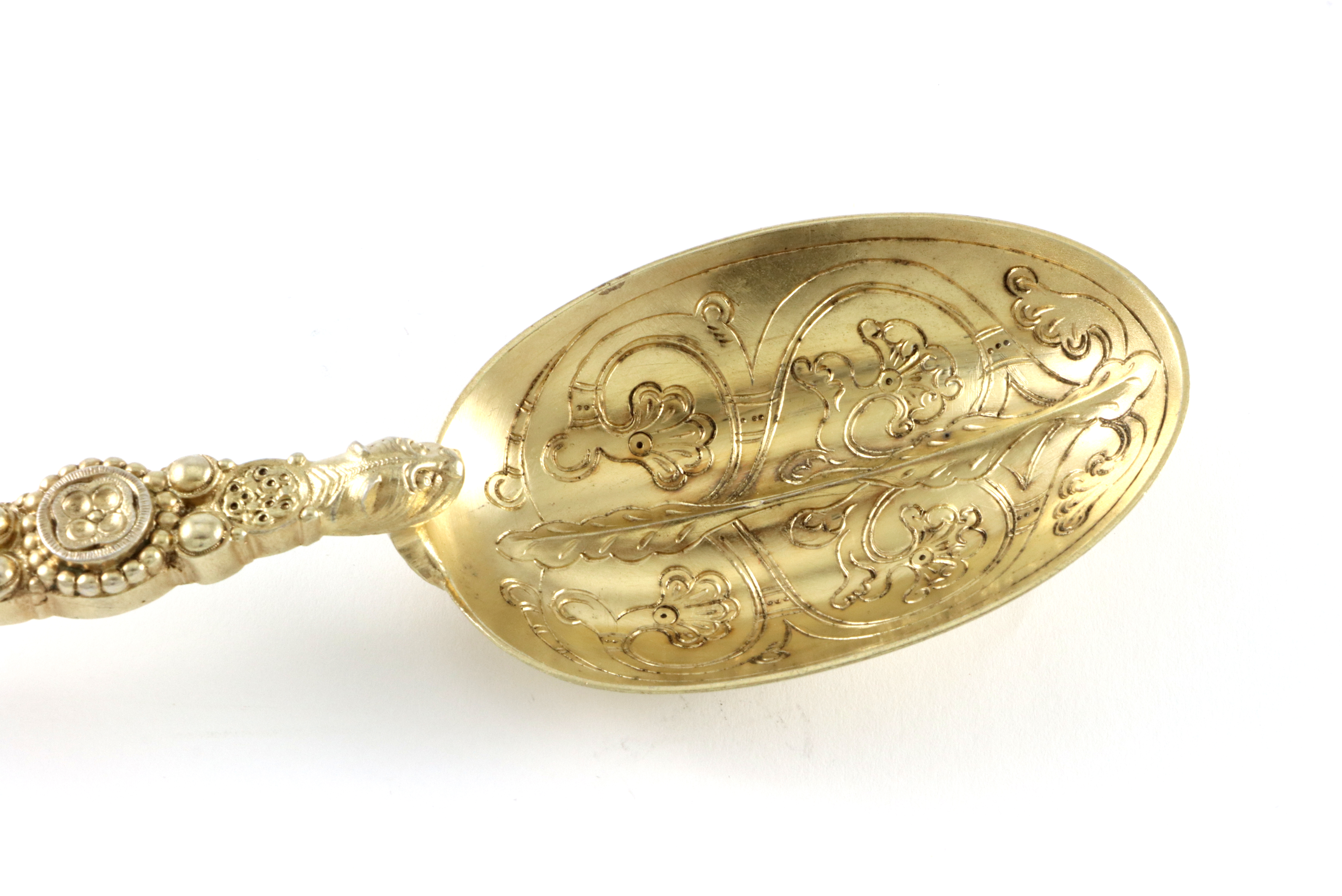 Helt fantastisk skje i forgylt sølv fra England, trolig produsert i London 1882. Fullstemplet med sølvstempel, bystempel, årsstempel, monarkstempel og produsentstempel. Meget dekorativ. Skjeen er 26,6 cm lang og meget solid.