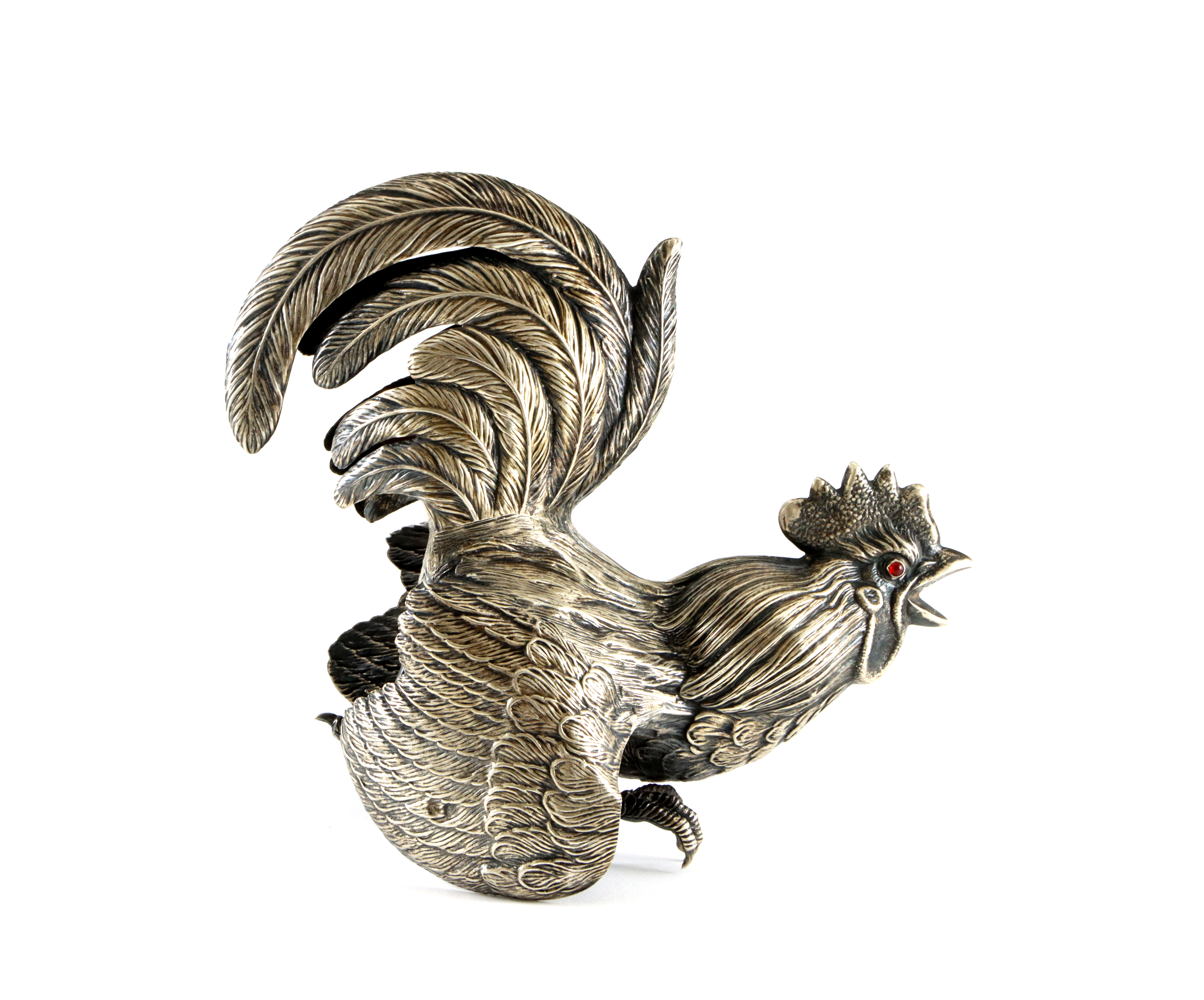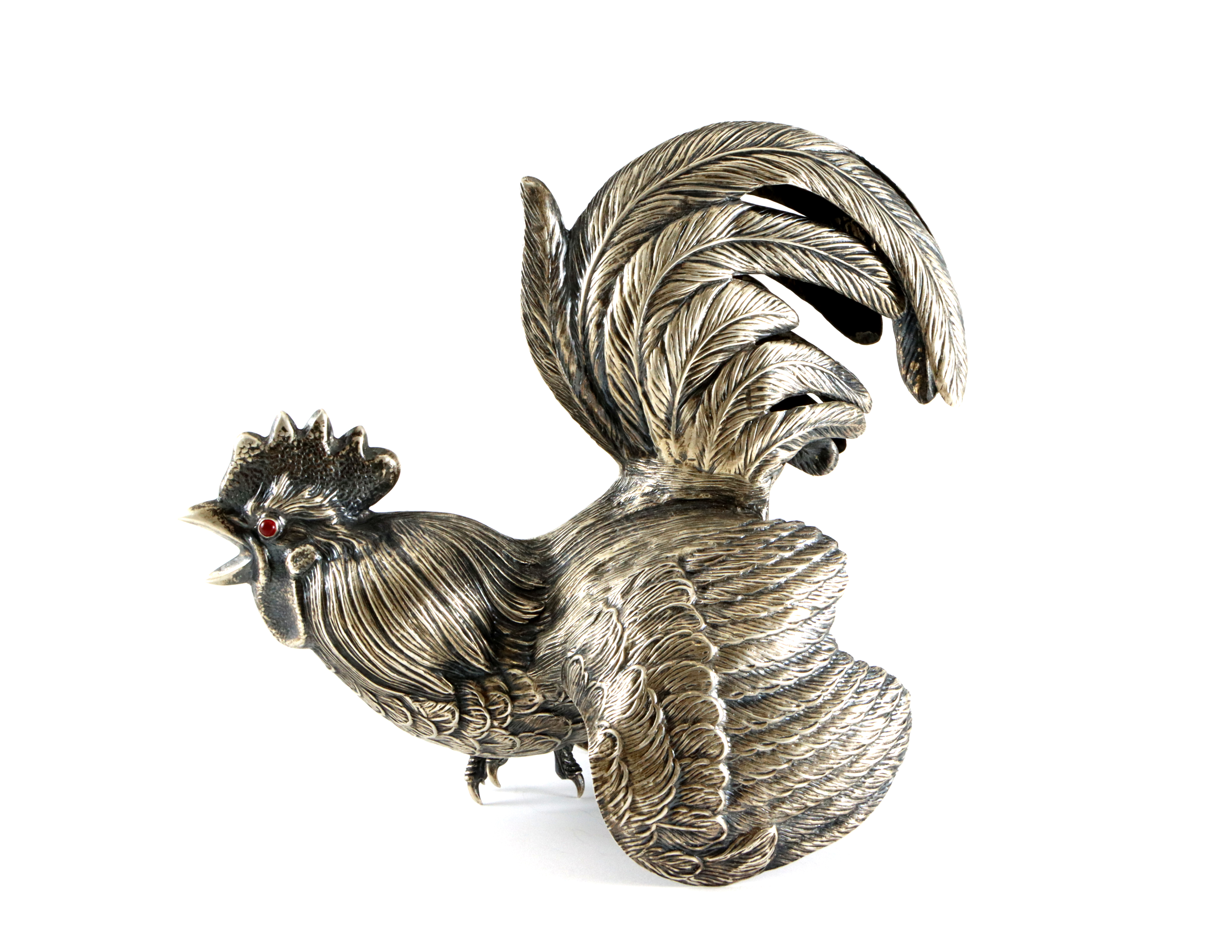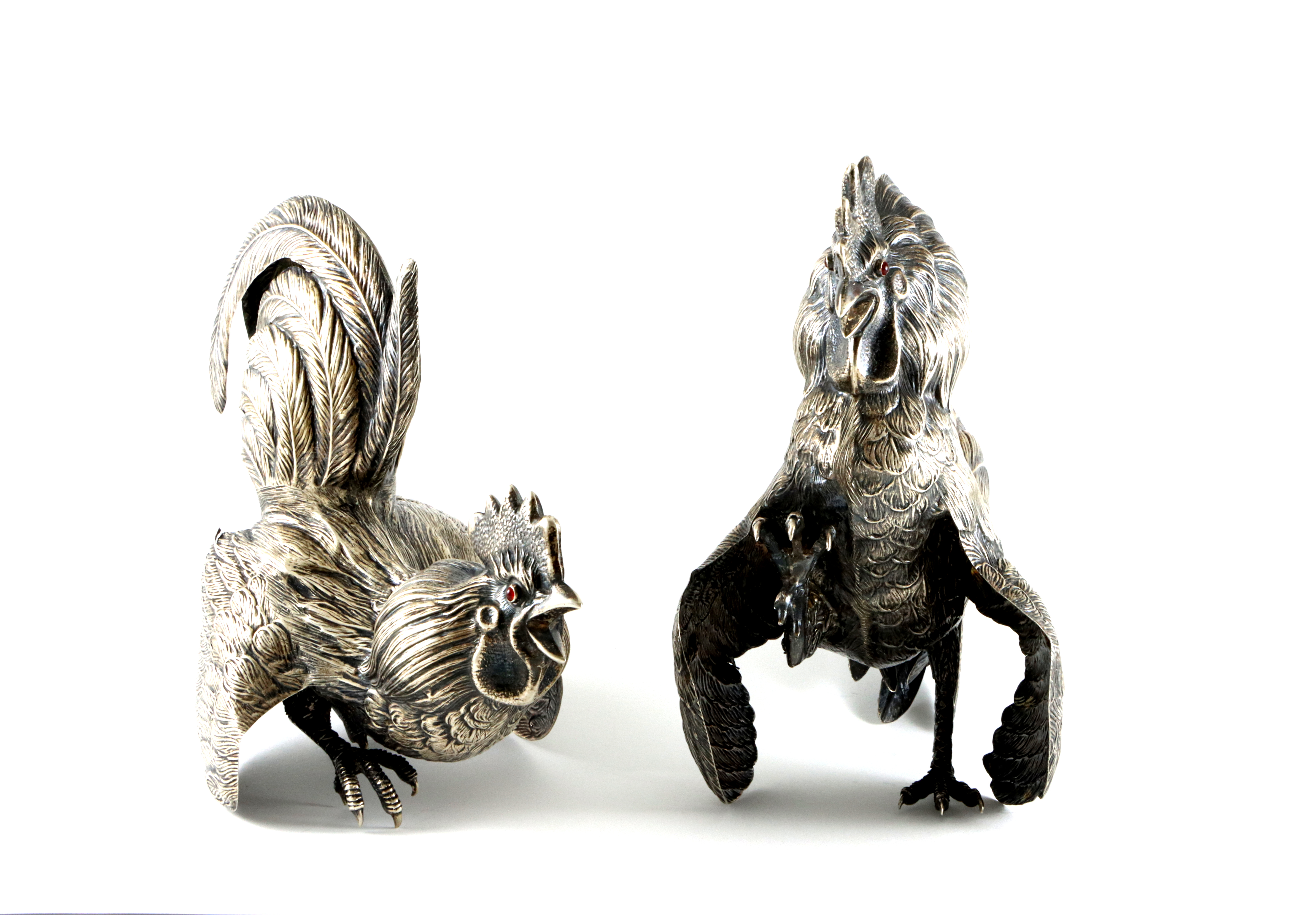 To svært morsomme haner i 830 Sølv Har ikke funnet stempler på dem men det mulig det er fordi de er en del oksidert (Tester som 830 S) Høyden er: ca 18,5 og 17,5 cm Totalvekt 454 gram Tross noen små skader så er de svært dekorative Prisen er for begge