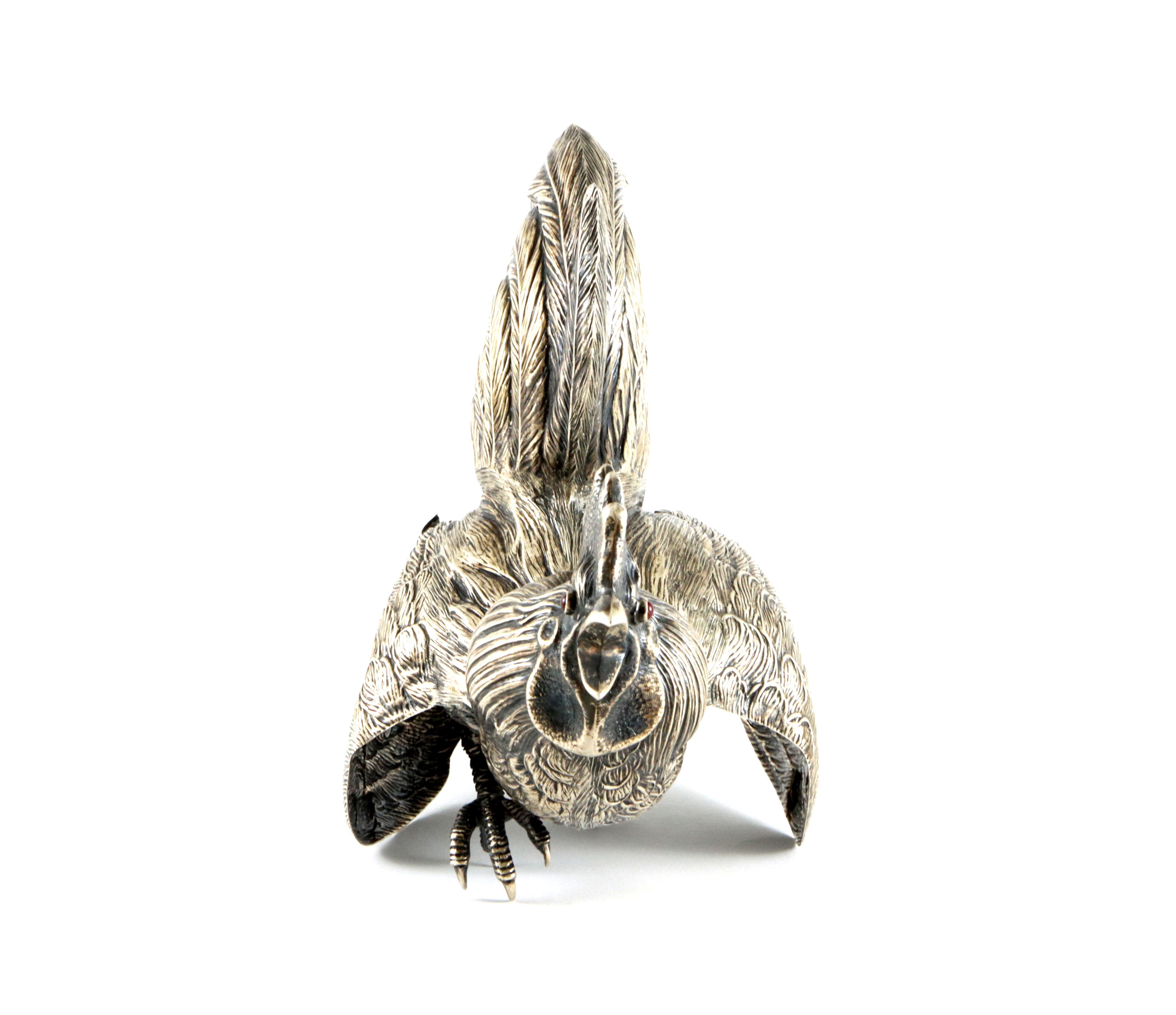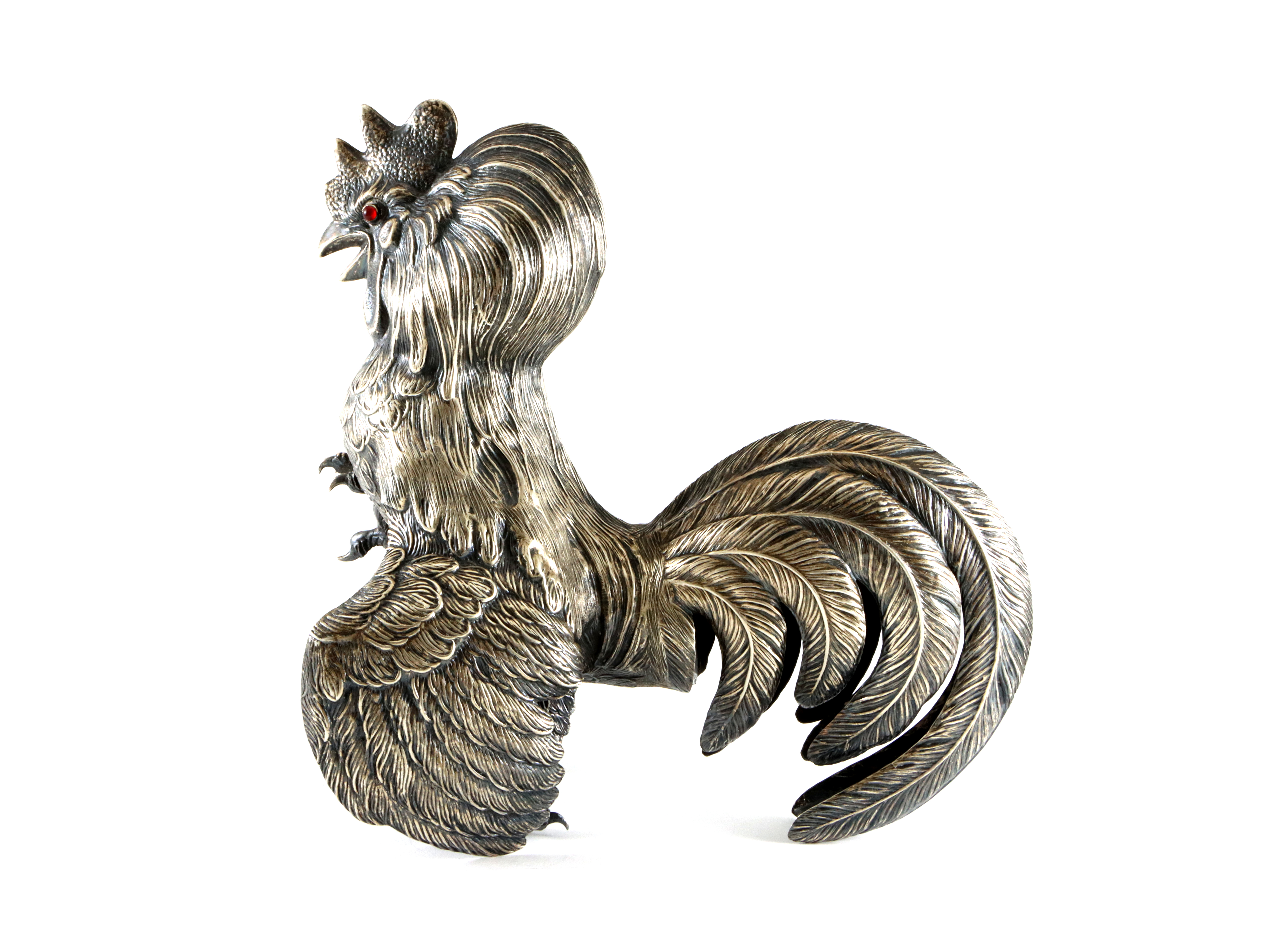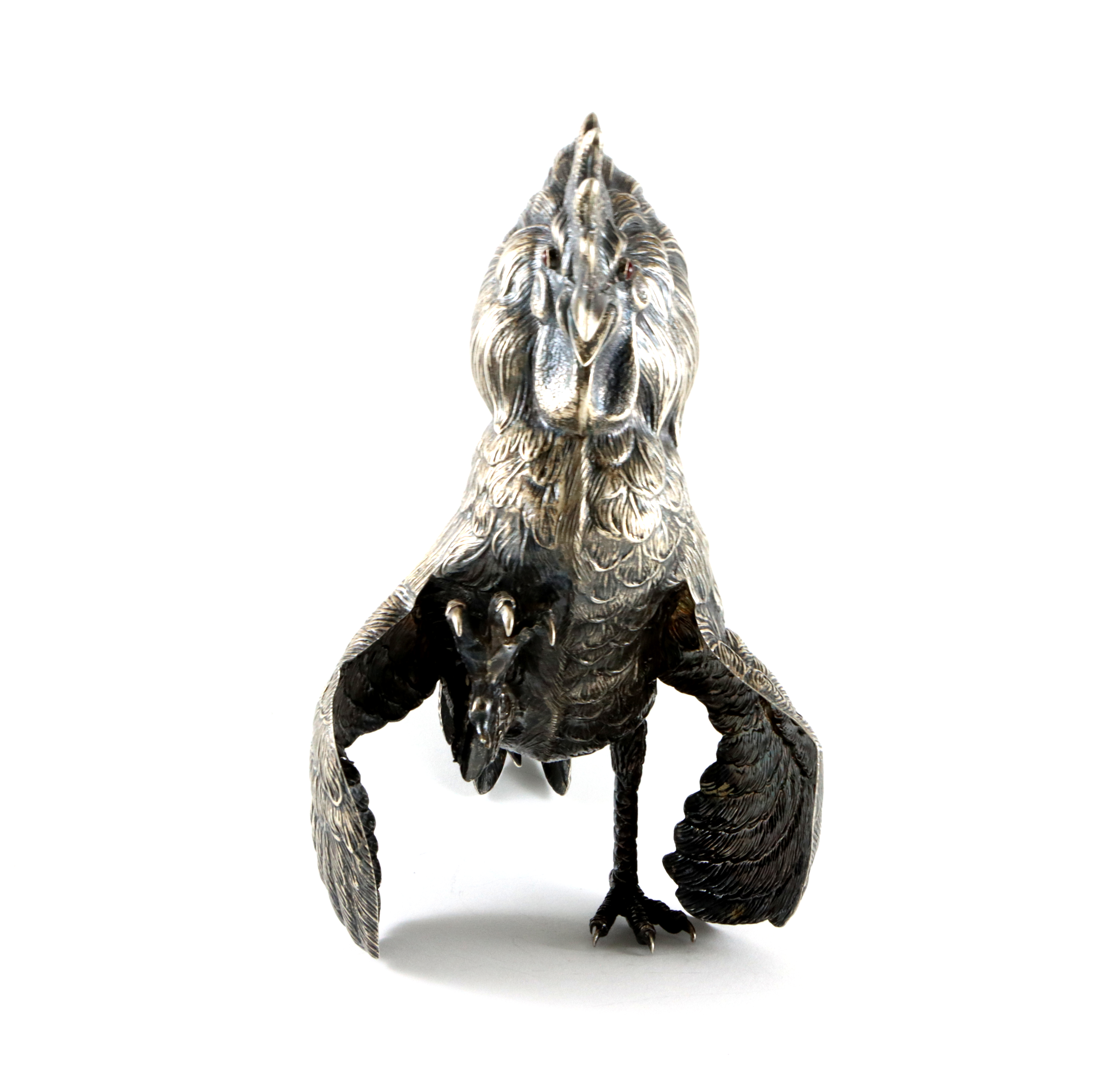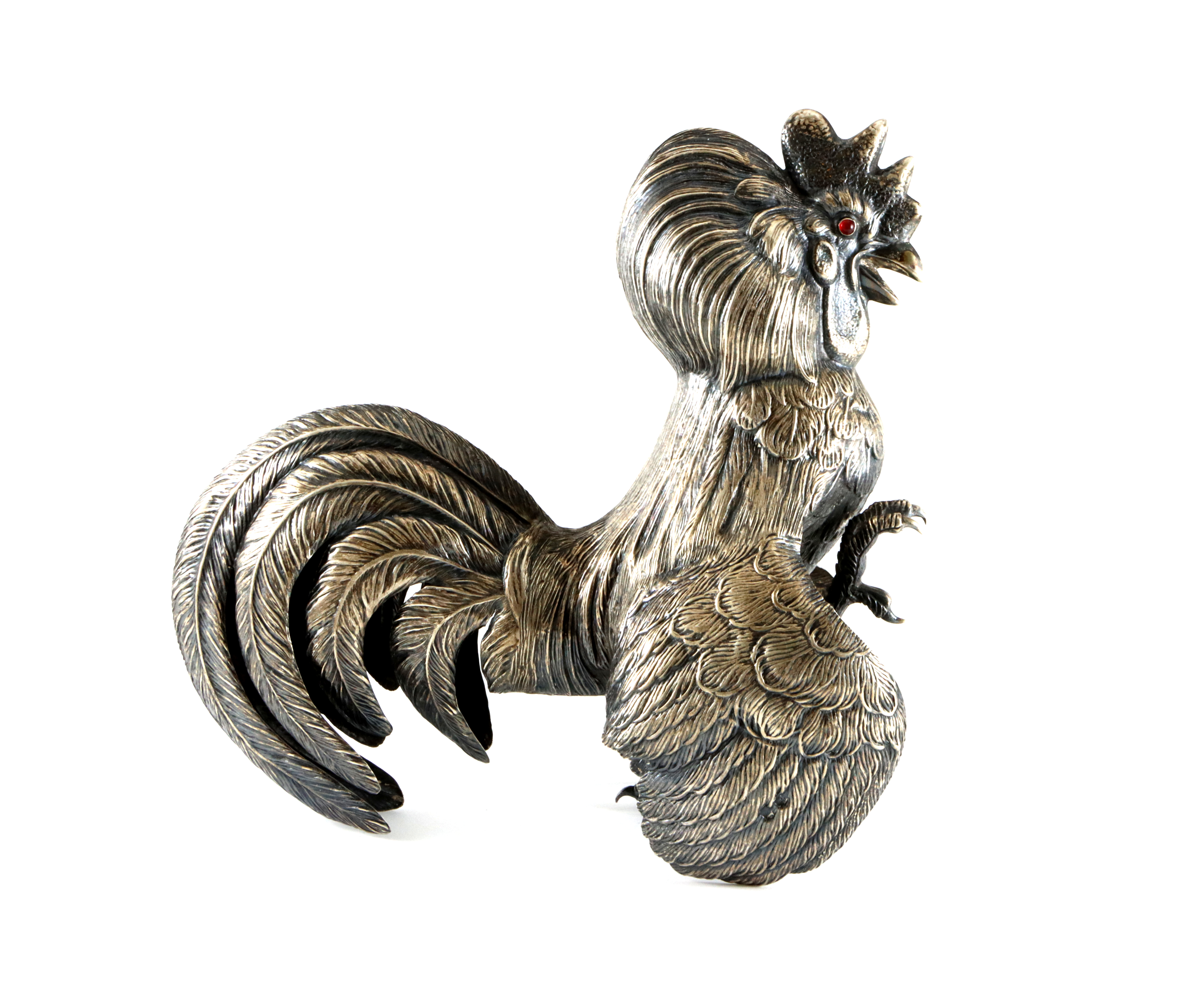 To svært morsomme haner i 830 Sølv Har ikke funnet stempler på dem men det mulig det er fordi de er en del oksidert (Tester som 830 S) Høyden er: ca 18,5 og 17,5 cm Totalvekt 454 gram Tross noen små skader så er de svært dekorative Prisen er for begge