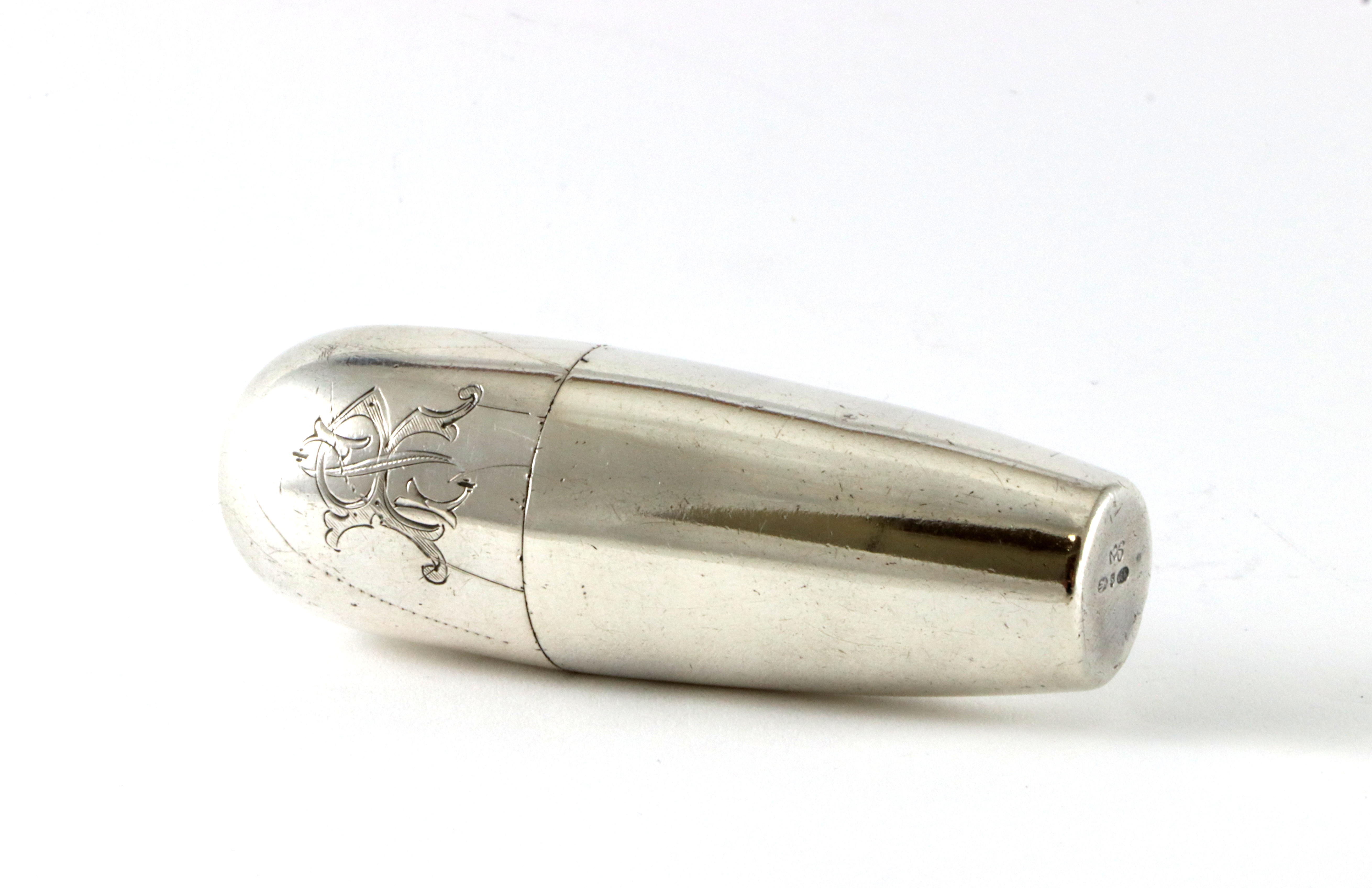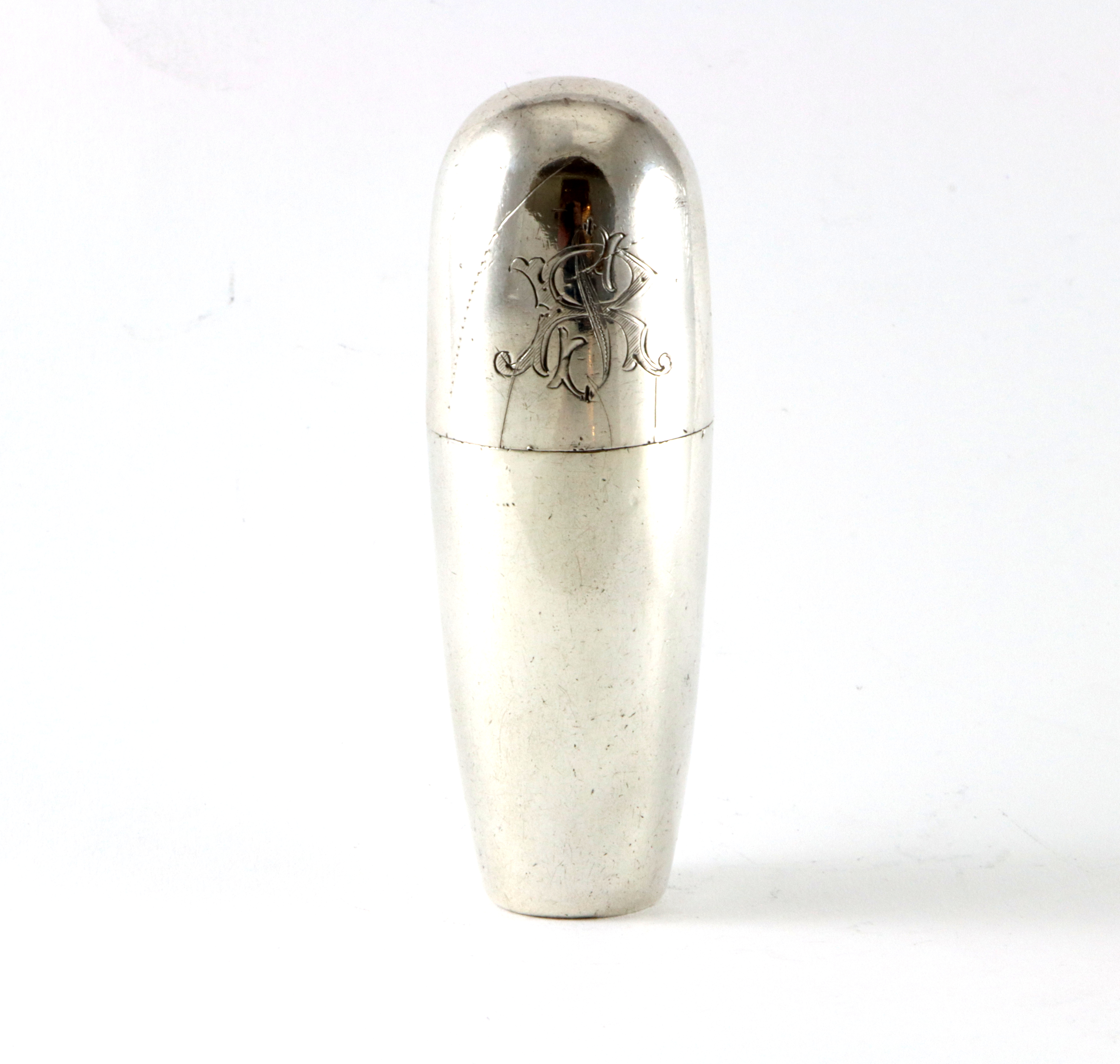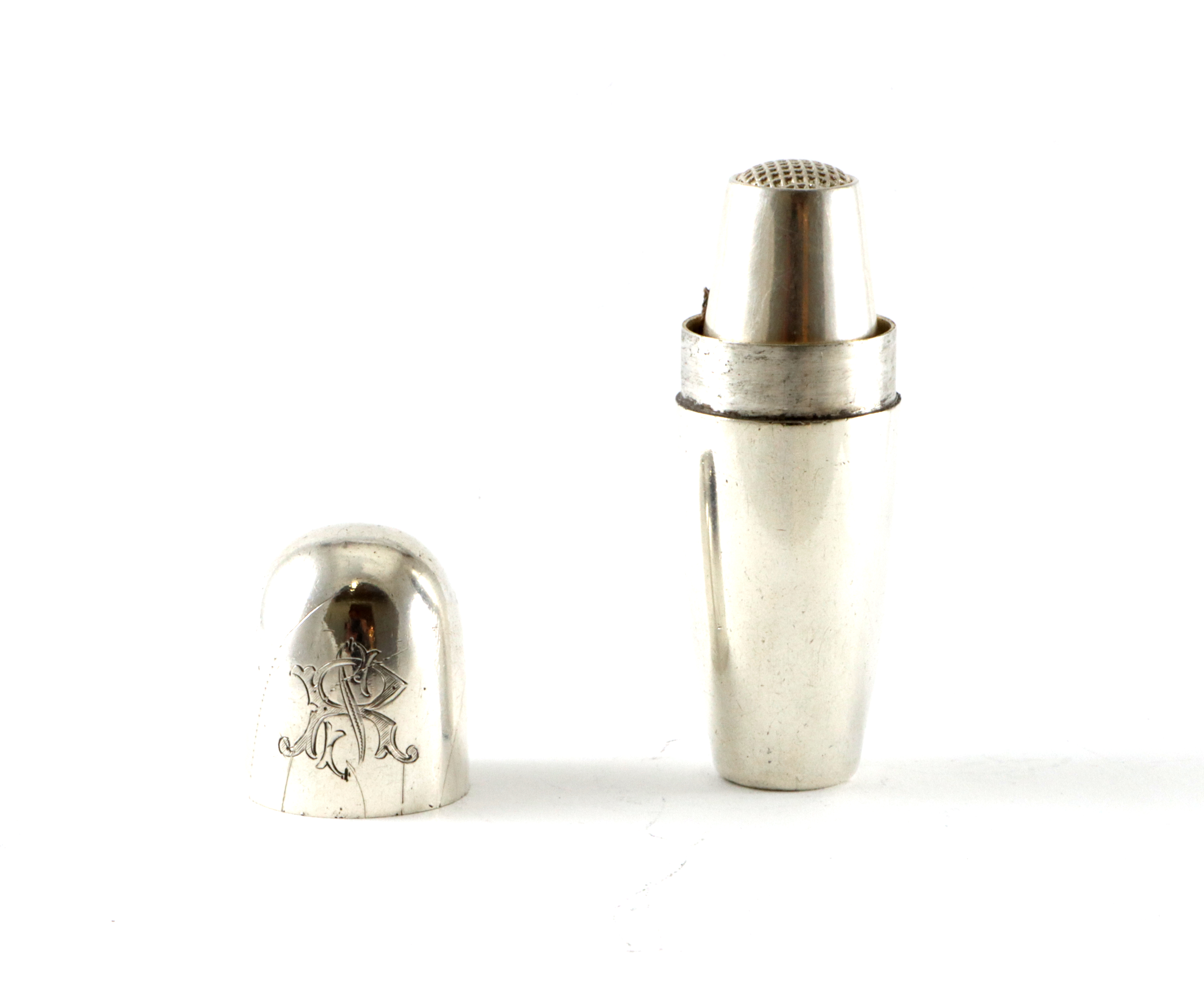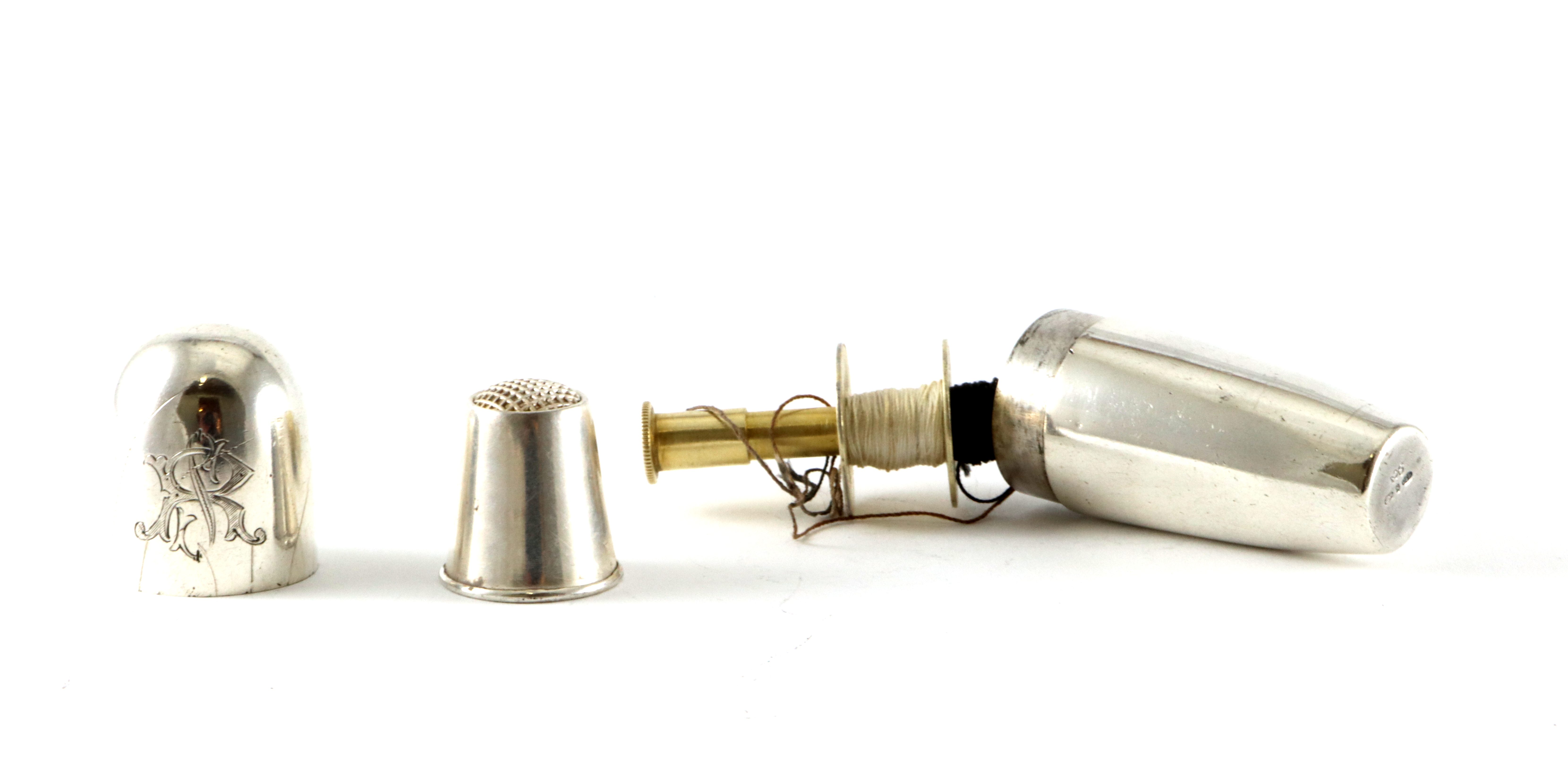 Utrolig morsom "sysett" fra David-Andersen, antikk Består av trådsneller på stang, fingerbøl og "futteral" Høyde: 65 mm Gravert monogram