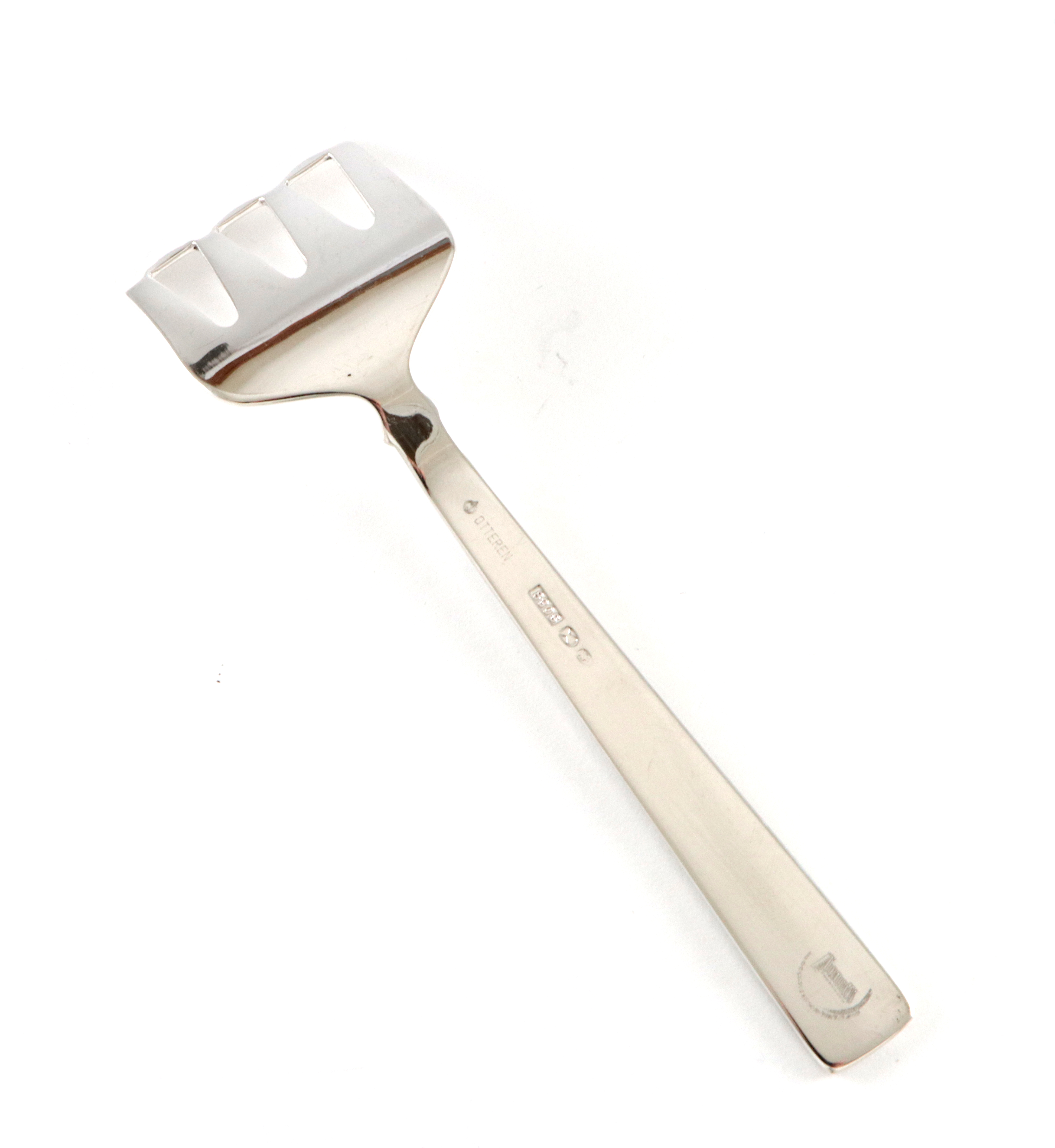 Sardingaffel i sølv, produsert av Th.Marthinsen i Tønsberg. Solgt av Otteren. Sardingaffelen har logoen til Chr.Bjelland på toppen. 12,0 cm lang, har en enkel "D" gravert på baksiden.