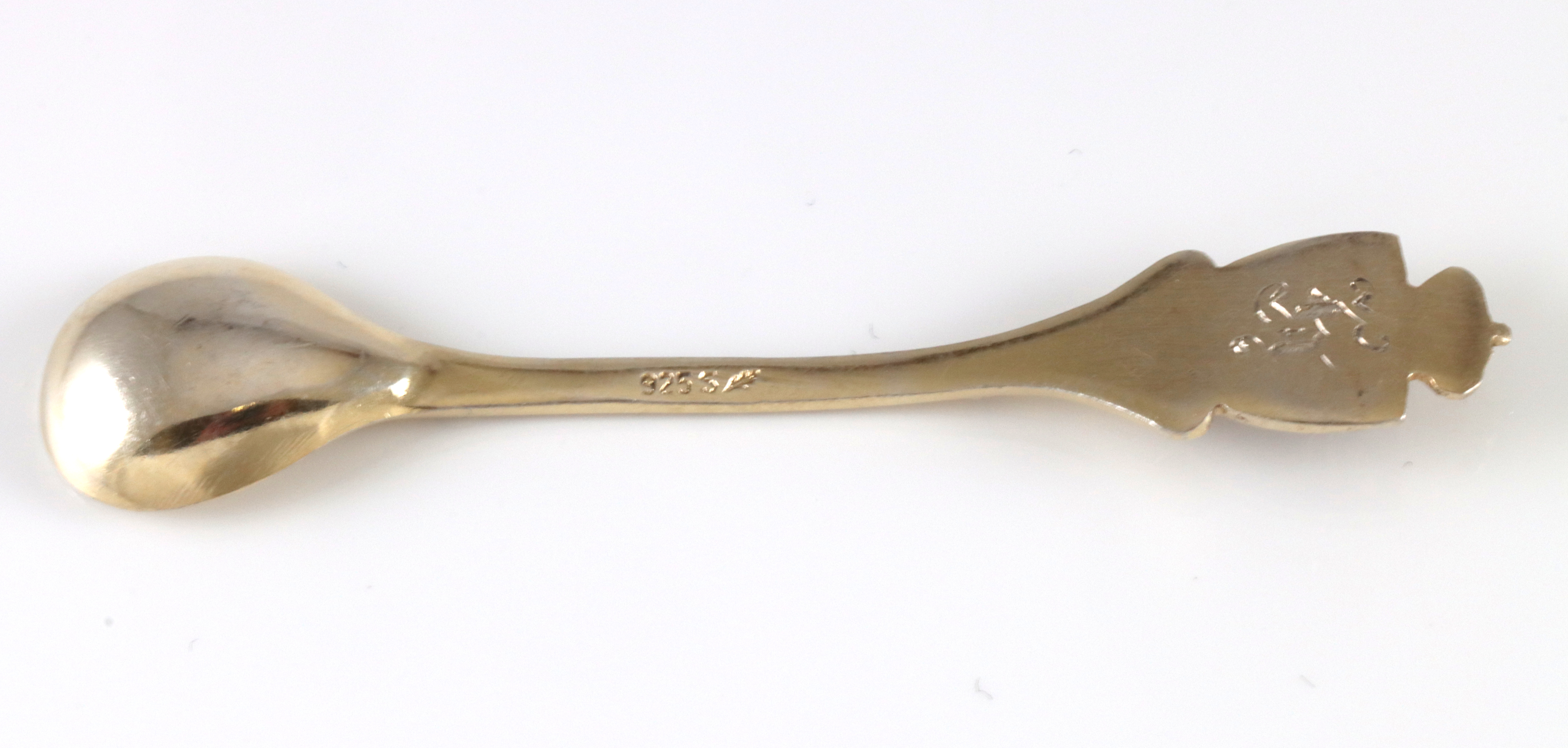 Sjelden riksvåpen saltskje i sølv produsert av Gustav Hellstrøm. Initialer på baksiden 6,7 cm lang