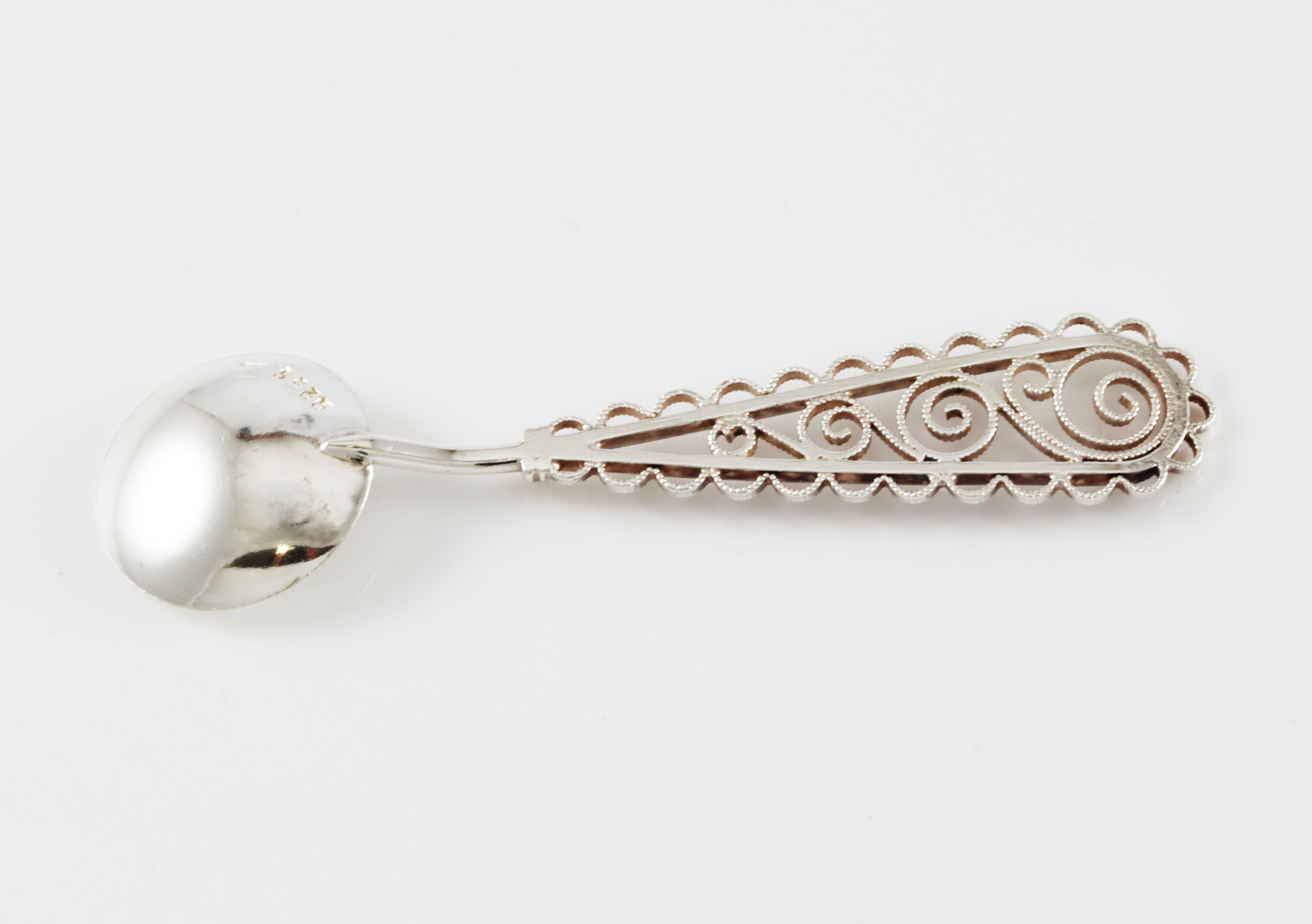 Saltskje i sølv med filigransarbeid. Mestermerket er svakt, men kan være Harry Pedersen i Bergen. 6,1 x 1,2 cm