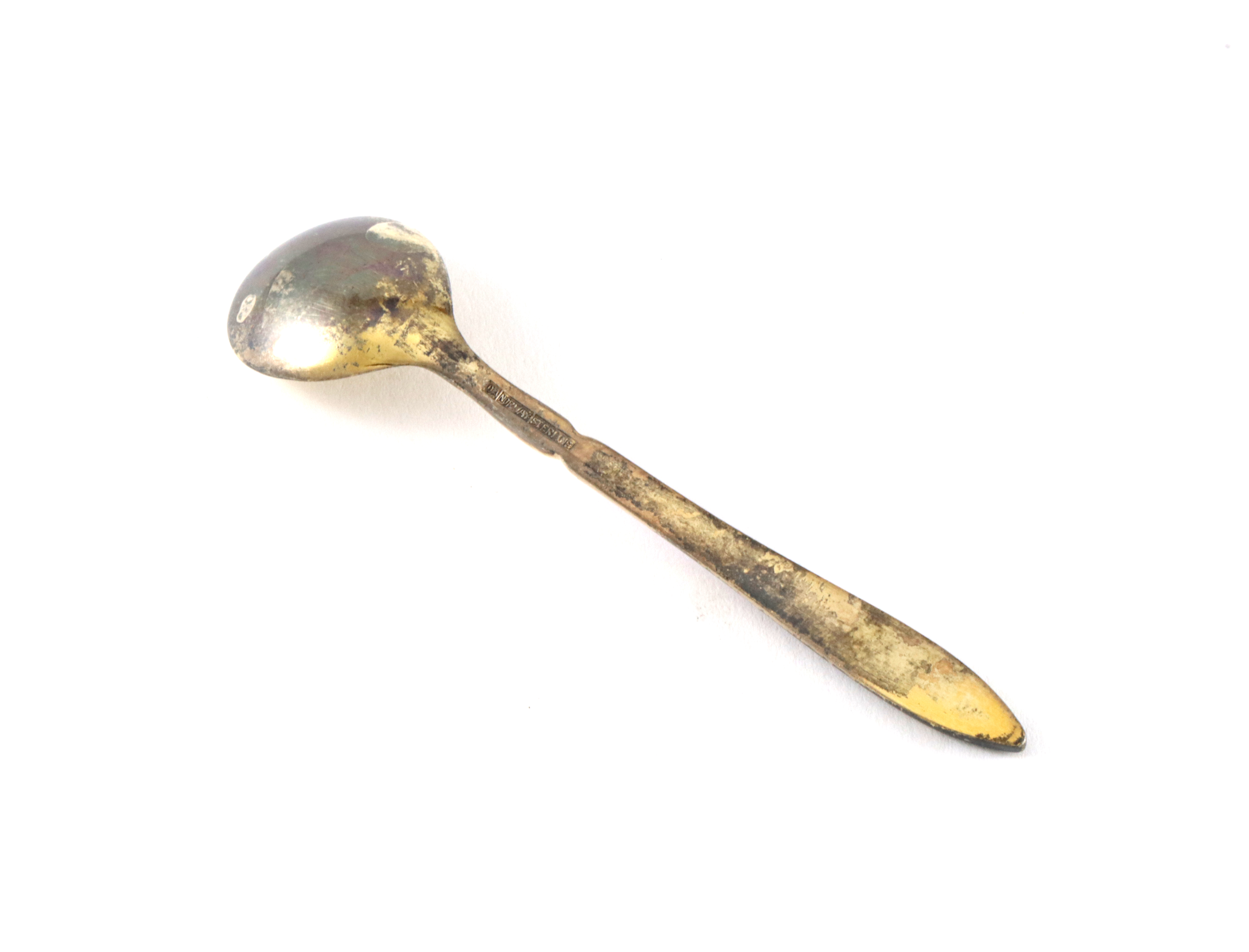 Saltskje i forgylt sølv og rød emalje. Produsert av David-Andersen. Oksidert i forgylningen selges derfor til redusert pris. 6,1 cm lang