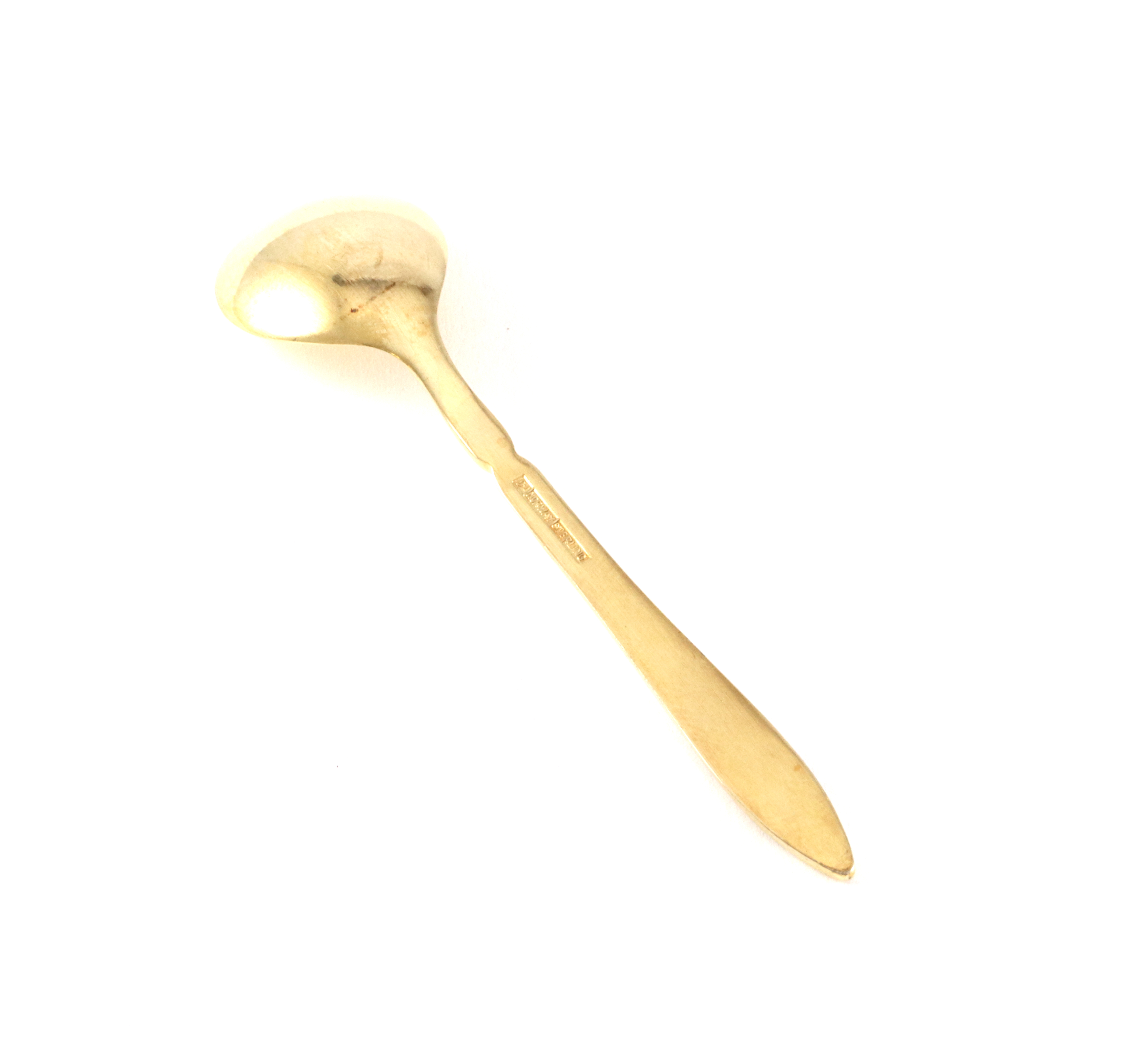 Saltskje i forgylt sølv og hvit emalje. Produsert av David-Andersen. Kjempefin stand. 6,1 cm lang