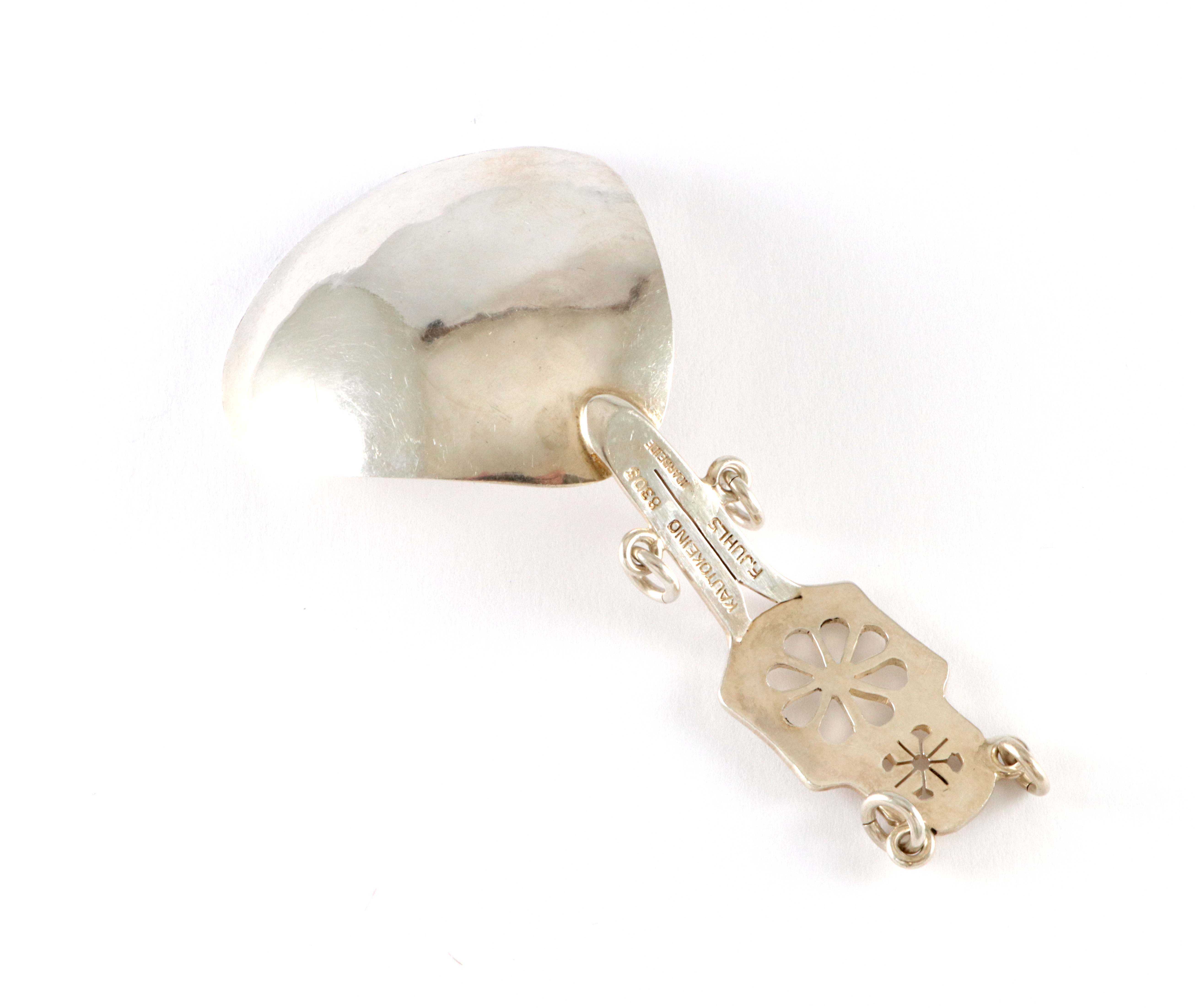Samiskinpirert skje i sølv, produsert av Juhls. Skjeen er 9,5 cm lang. Ukjent modellnummer. I god stand.