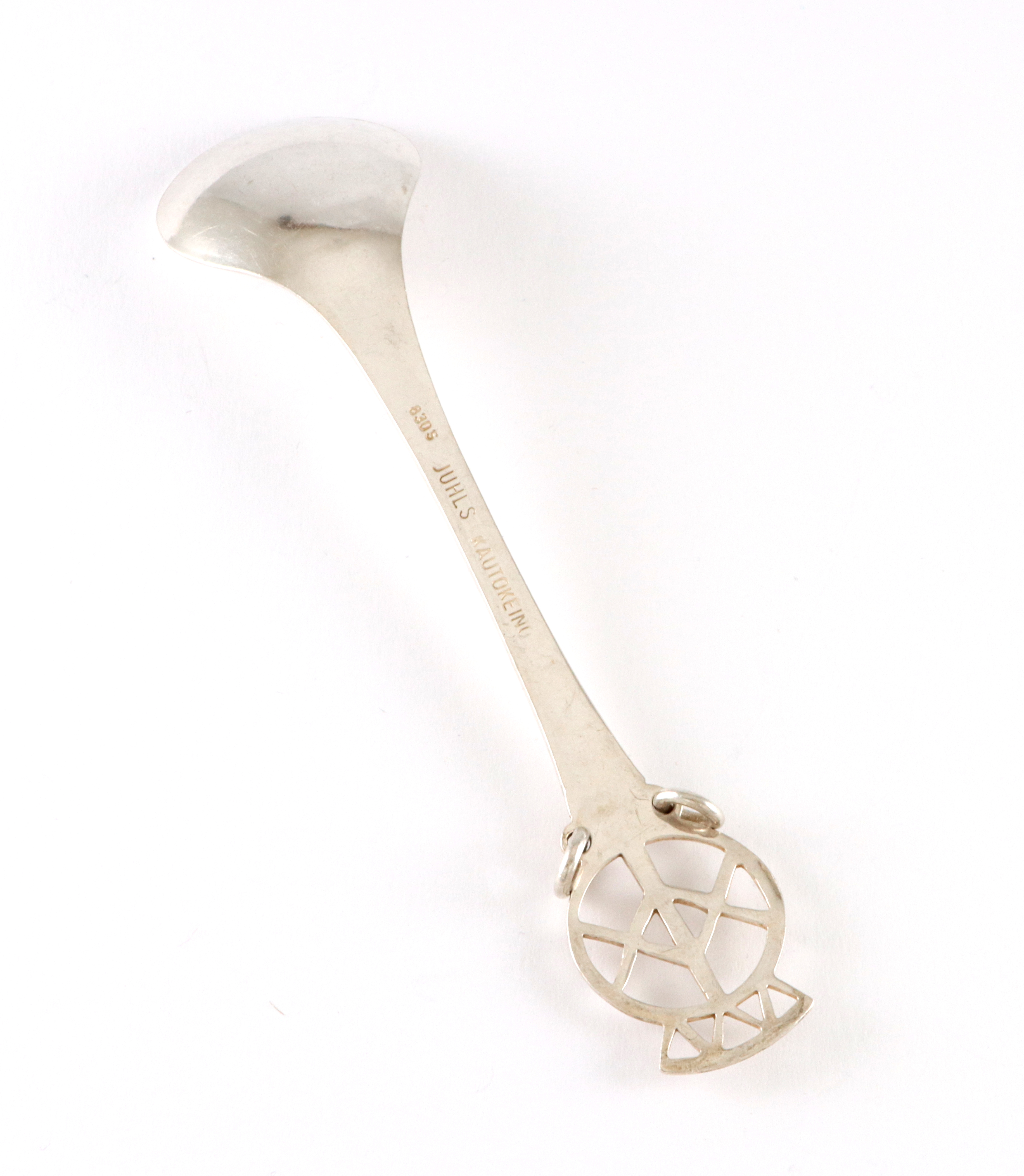 Samiskinpirert skje i sølv, produsert av Juhls. Skjeen er ca 11,3 cm lang. I god stand, normal bruksslitasje.