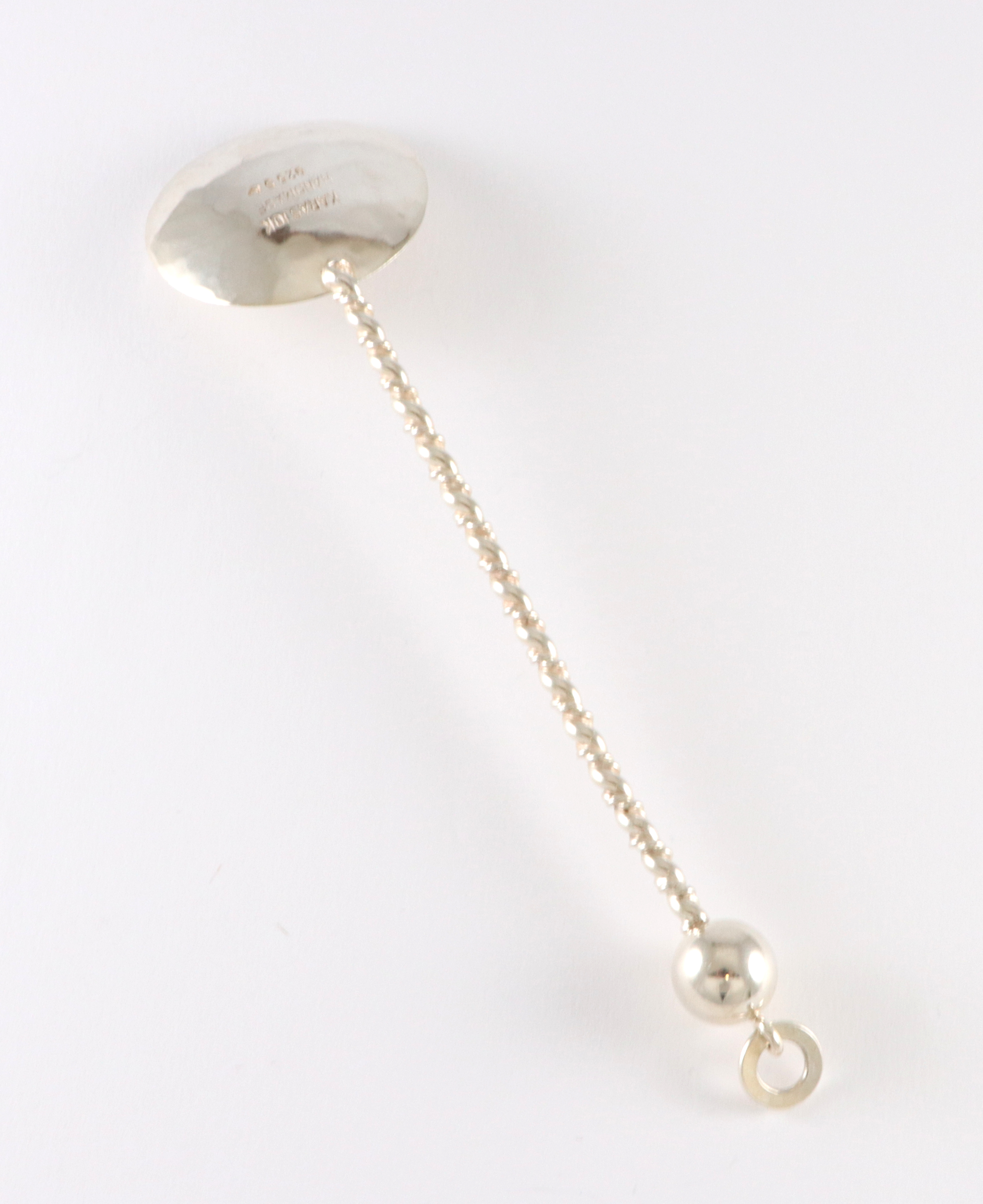 Samiskinspirert skje i sølv, produsert av Sølvsmia i Karasjok. Skjeen er ca 14,7 cm lang. I god stand.