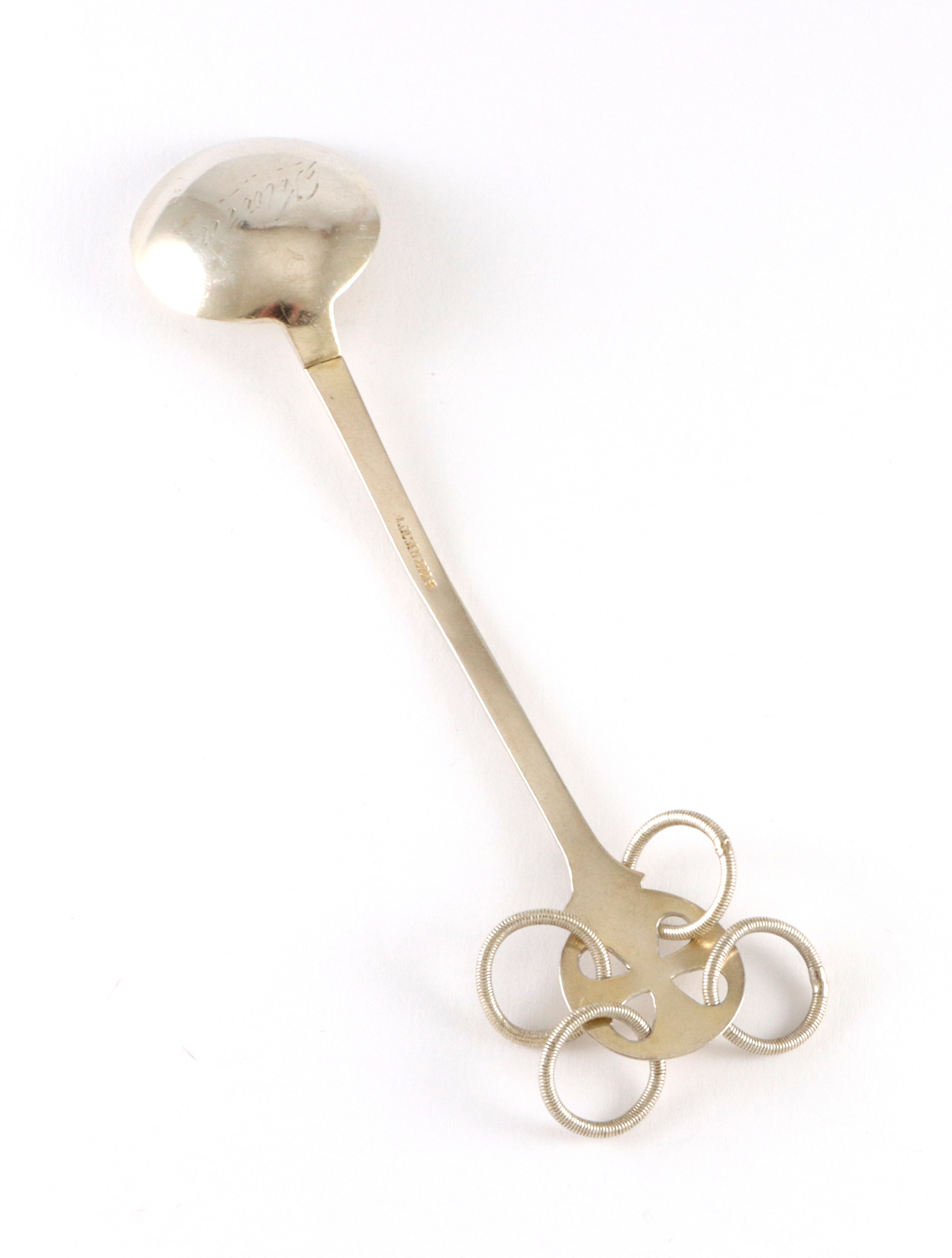 Antikk samiskinspirert skje. Mesterstempel er noe utydelig men mulig det er M(?) Olsen. Skjeen er 12,1 cm lang, noe buklete og har "Klara" gravert bak på skjebladet.