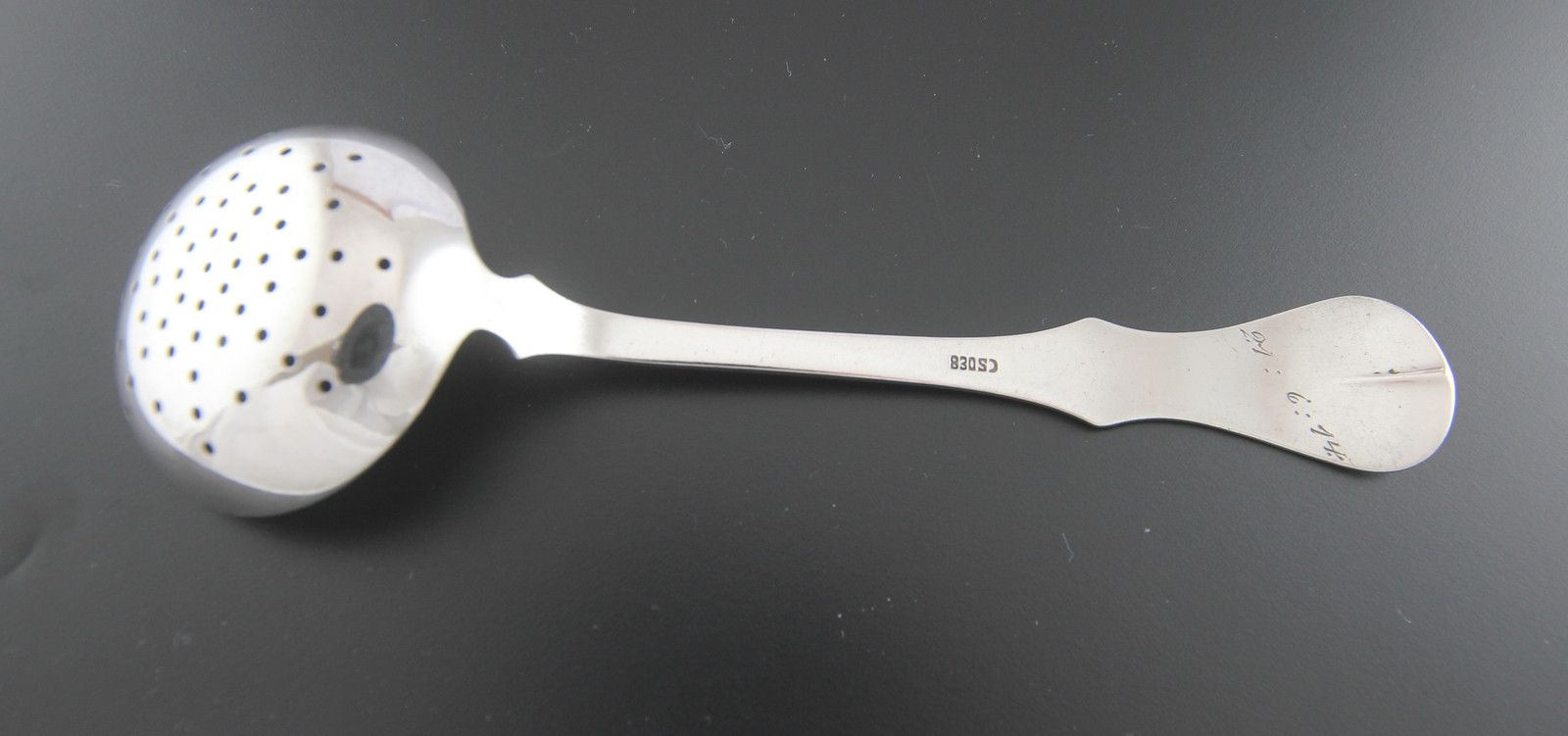 Strøskje i mønsteret "Flat Rose", produsert av Th.Marthinsen. Gravert monogram foran og dato fra 1914 bak. Lengde 16,2 cm