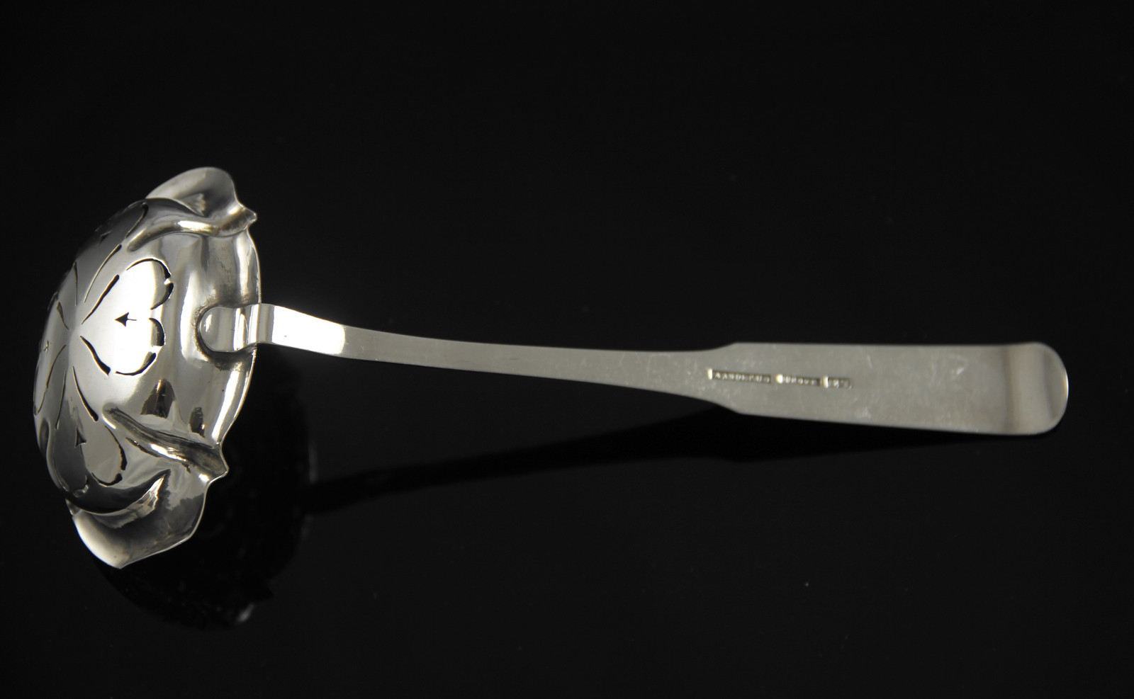 Antikk strøskje fra 1859 stemplet A.Anderud. Har ikke lødighetsstempel men er testet av oss. Lengde 18,7 cm Svakt prikkgravert monogram på forsiden I god stand.