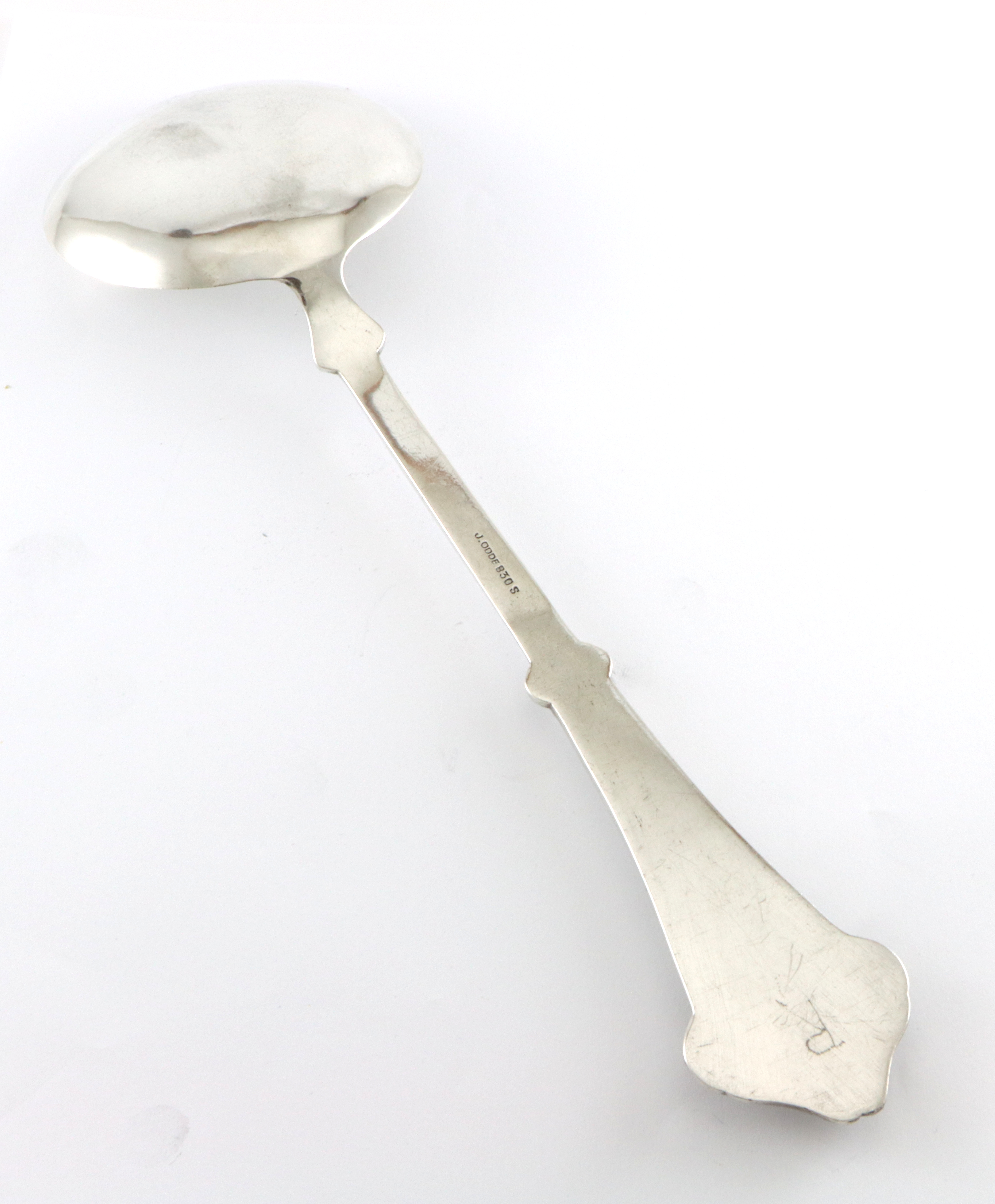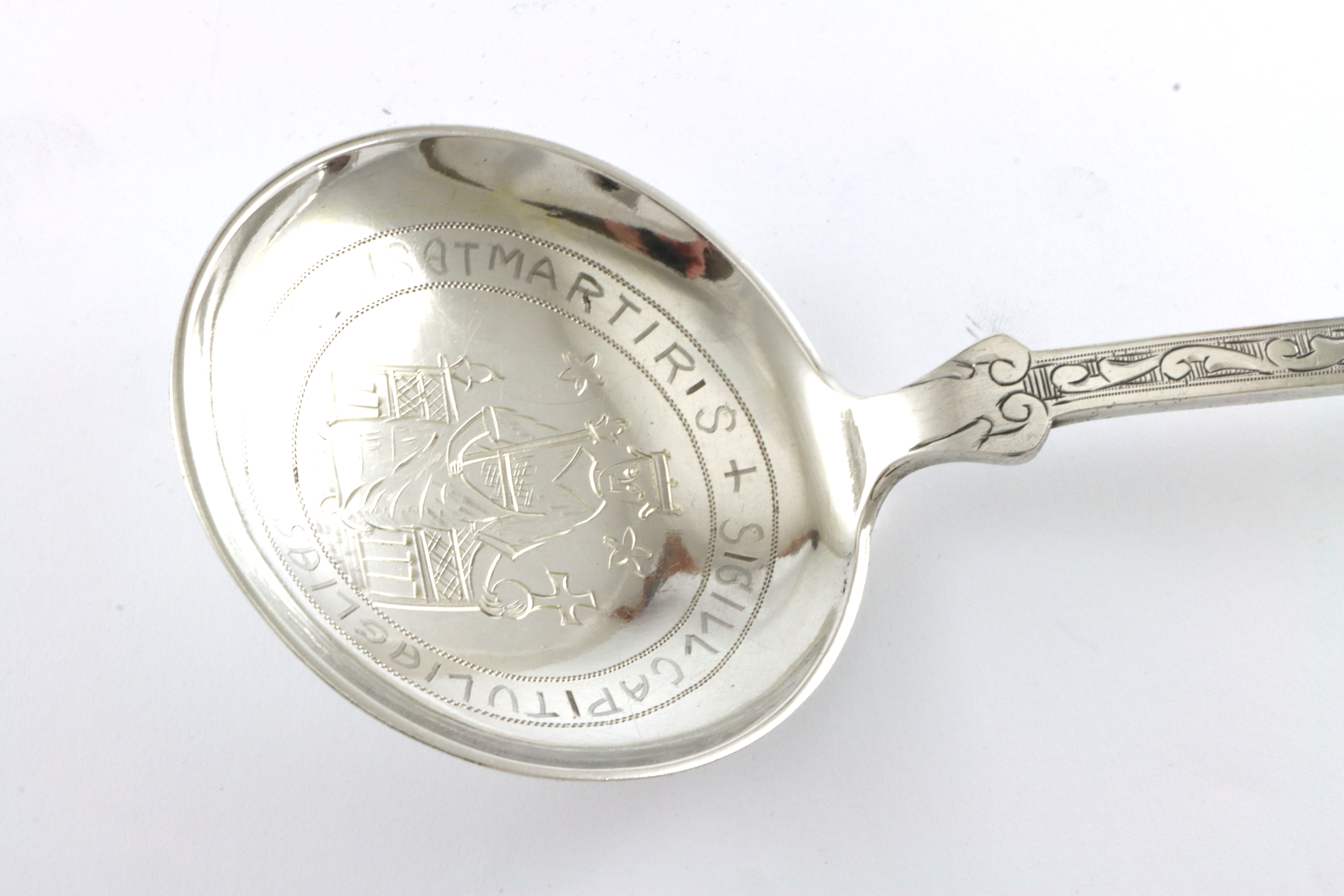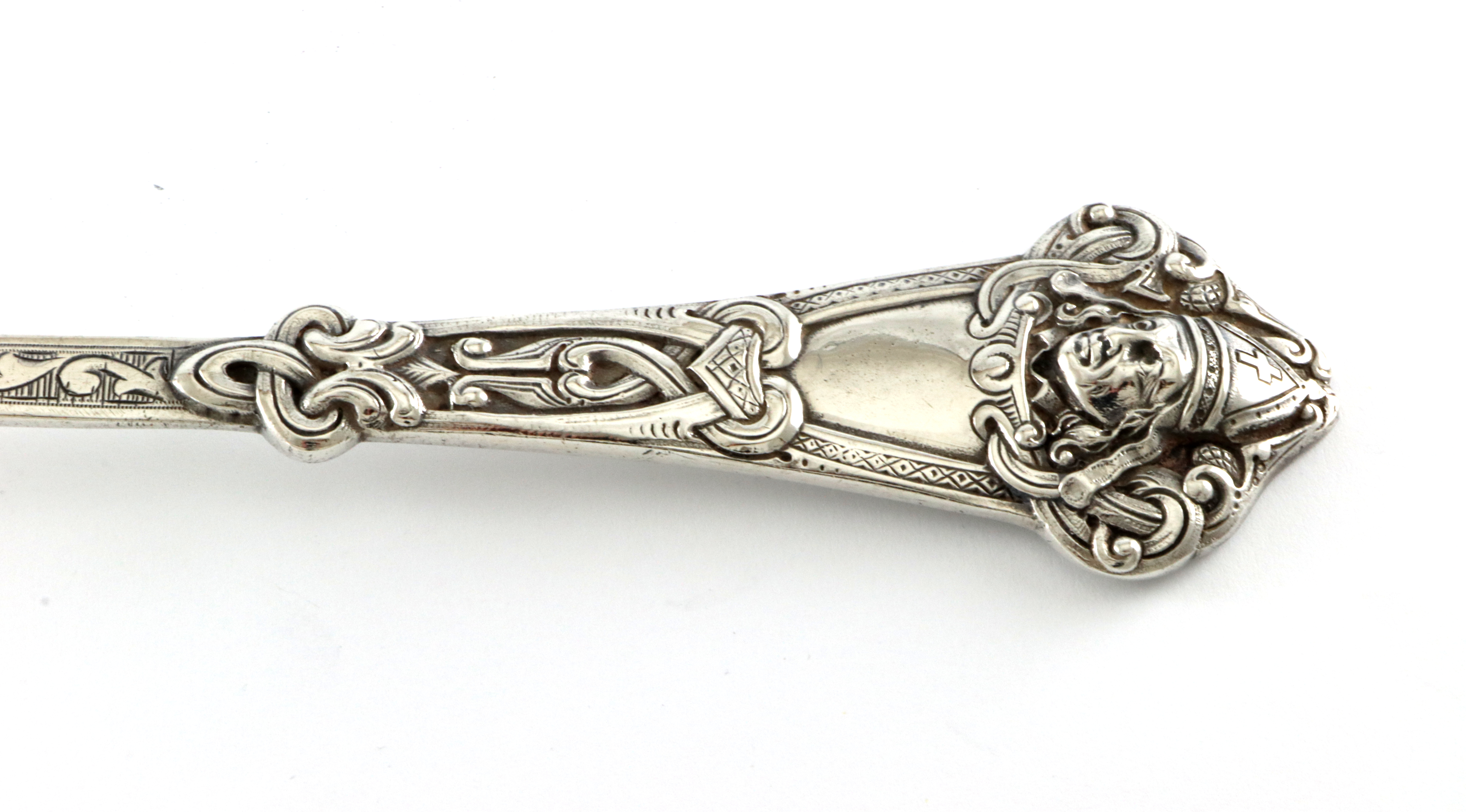 Johannes Odde. Serveringsskje med domirkehode i 830 Sølv 26,8 cm Gravert/innrisset en bokstav ("R) Aldersrelatert bruksslitasje