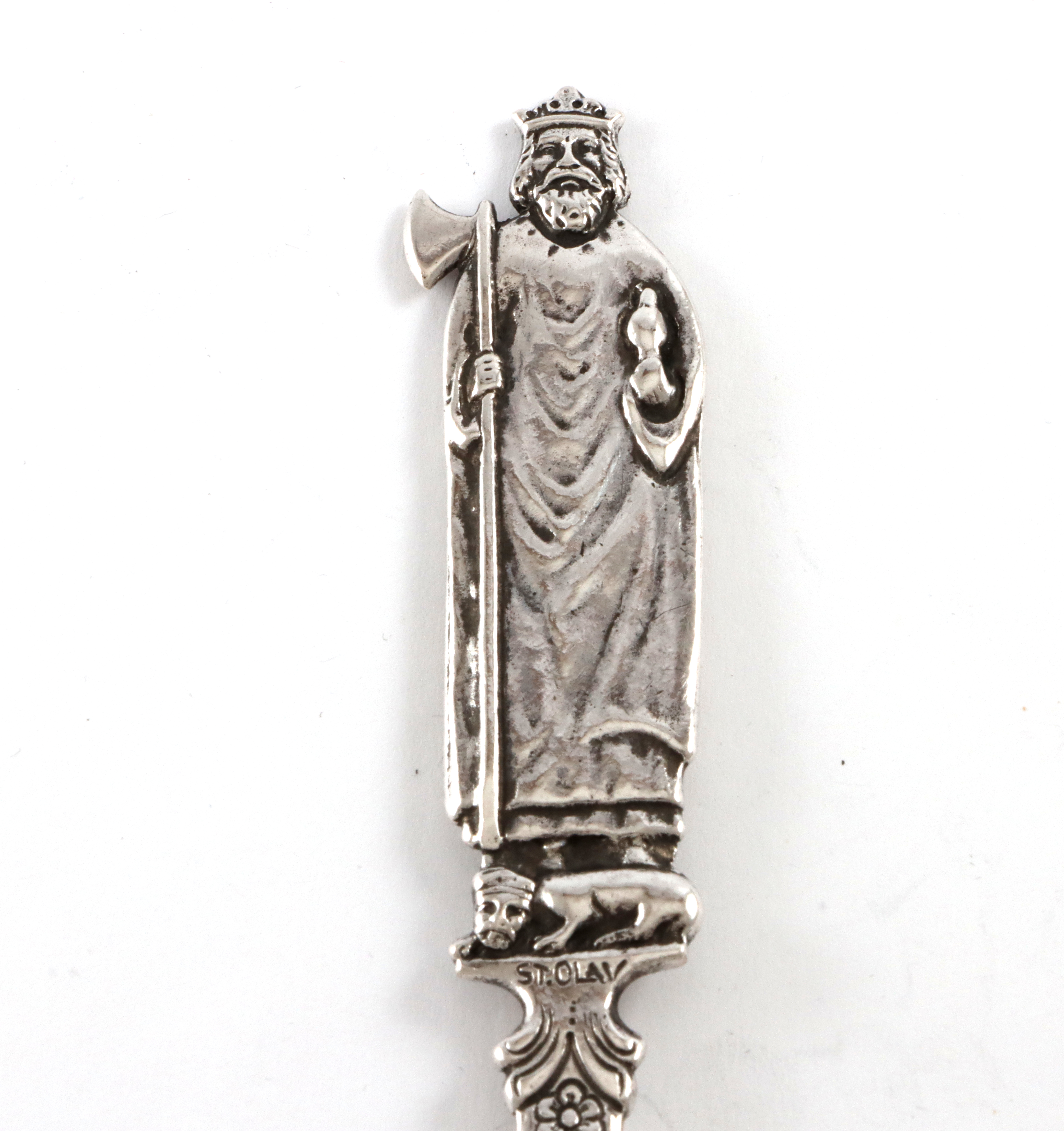 Skje i sølv med motiv av St.Olav. Gravering på baksiden av bladet fra 1931. 18,8 cm lang Svakt og ukjent mestermerke, men står tydelig T.hjem