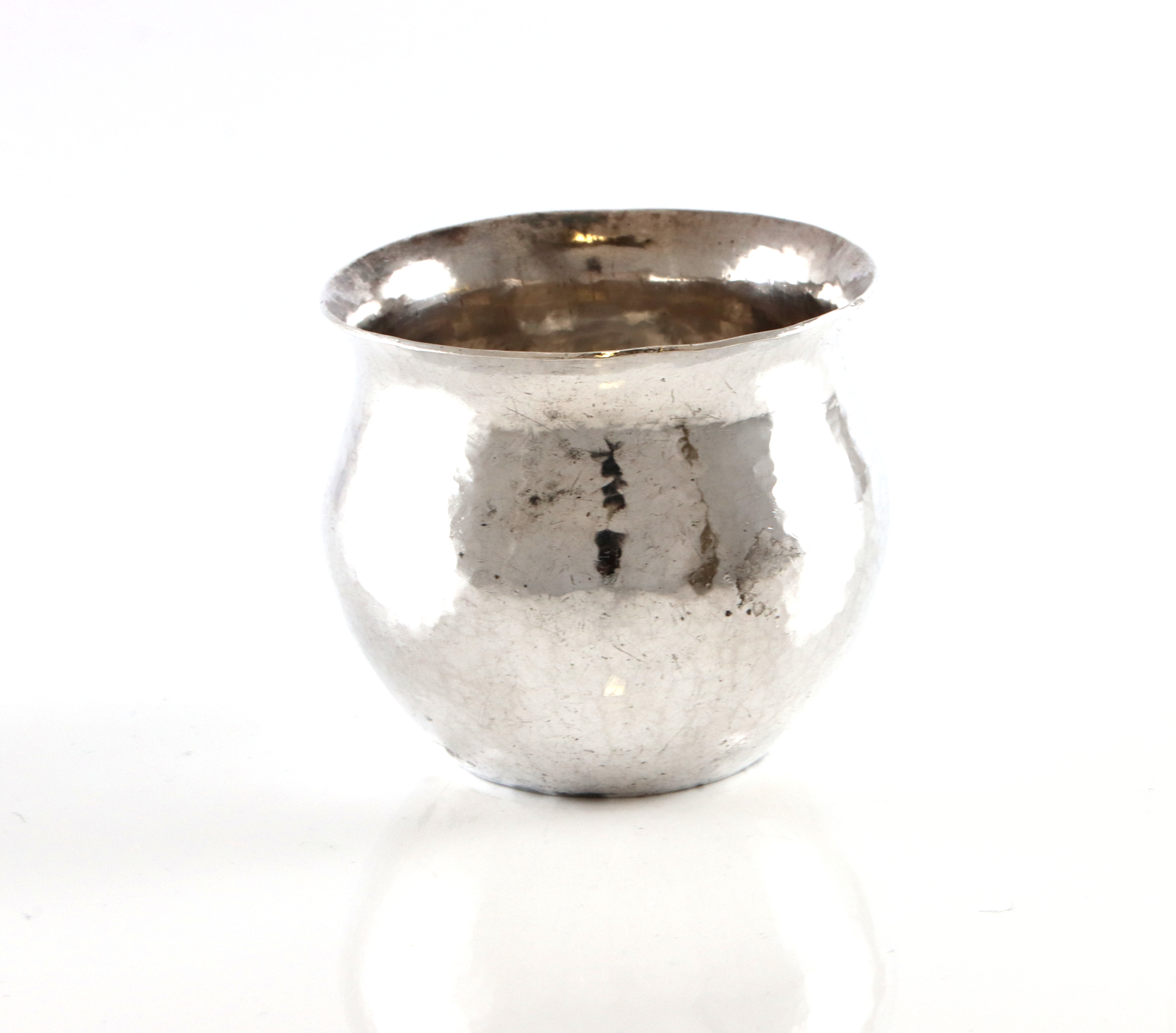 Håndsmidd tomling(?) produsert av H.Møller. Noen små flekker utenpå og inne(Mulig saltskader?). Selges derfor rimelig. 3,8 x 4,3 cm