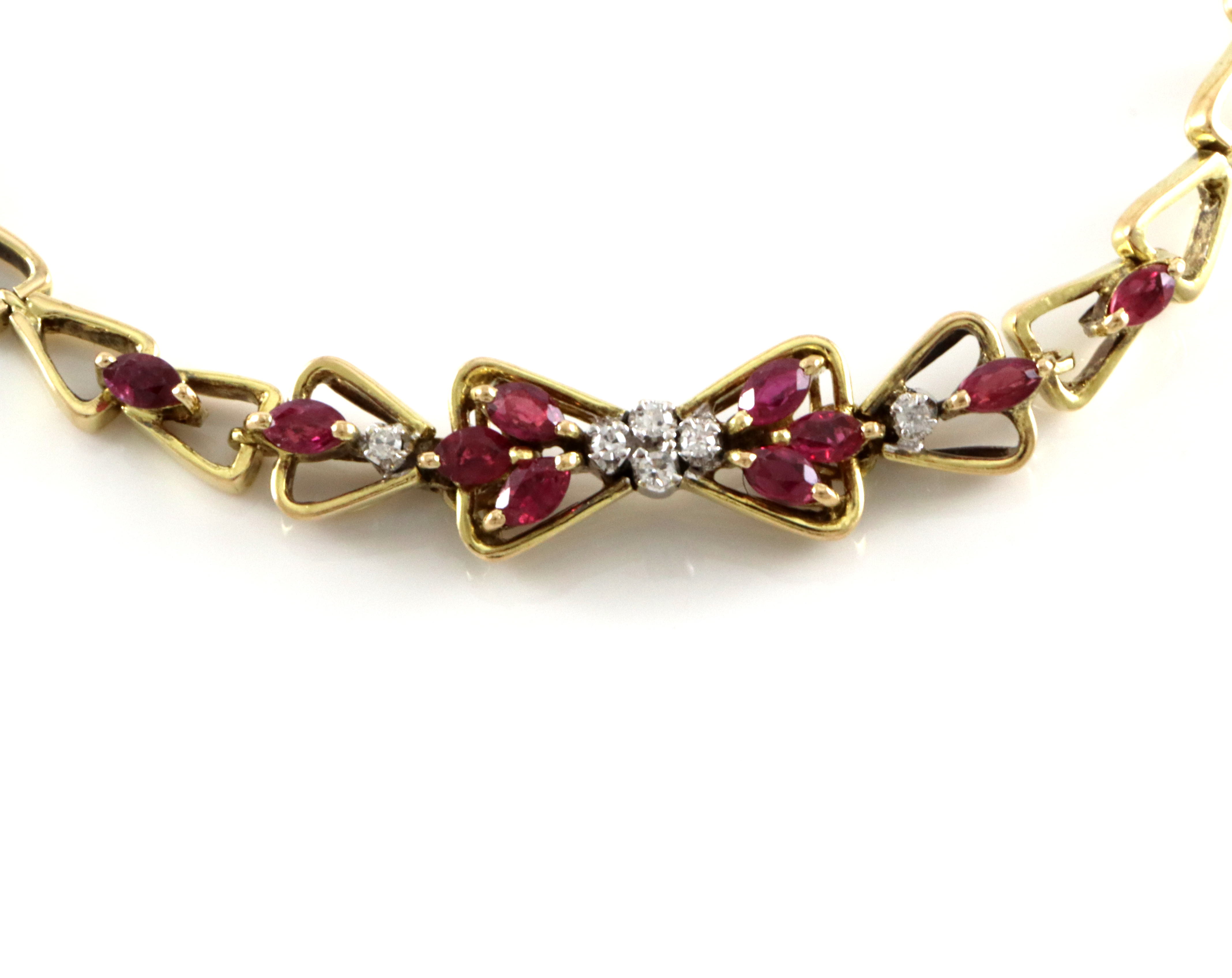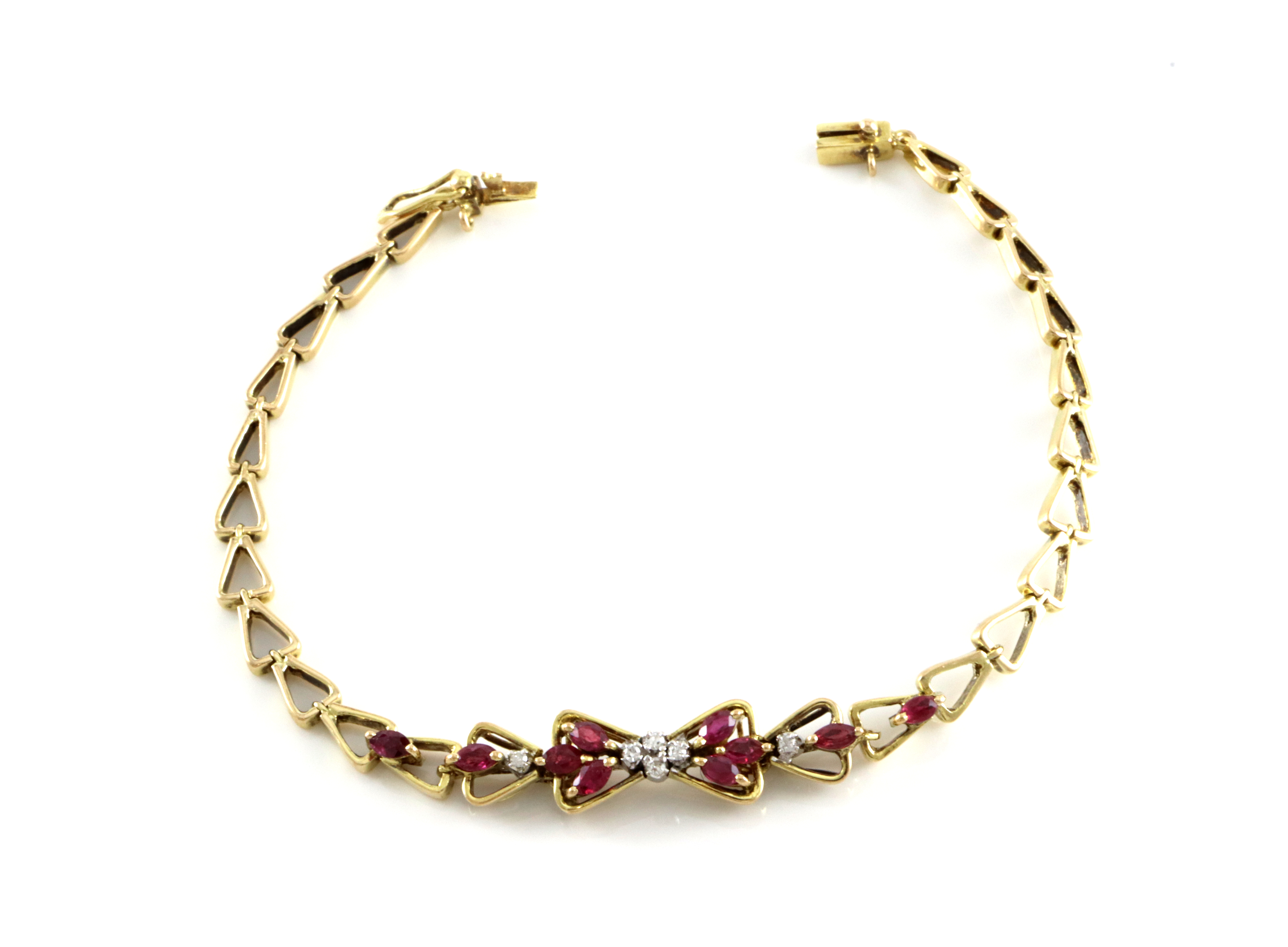 Med en sløyfe med rubiner og små diamanter Bredde: 8 mm Lengde: 18 cm Vekt: 8,4 gram Lås: Kasselås med sikkerhetshempe Har opprinnelig vært med sikkerhetslenke. Den er fjernet