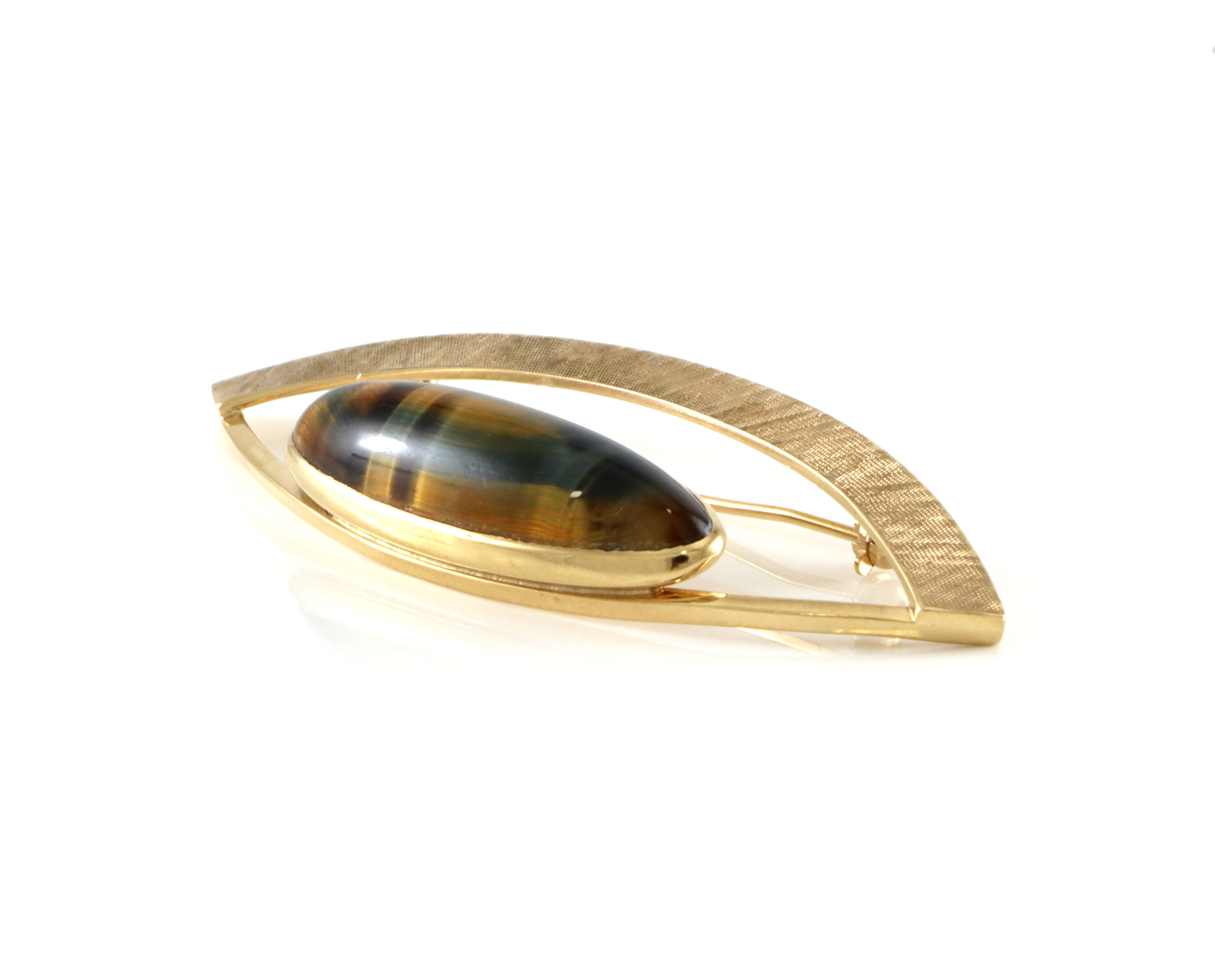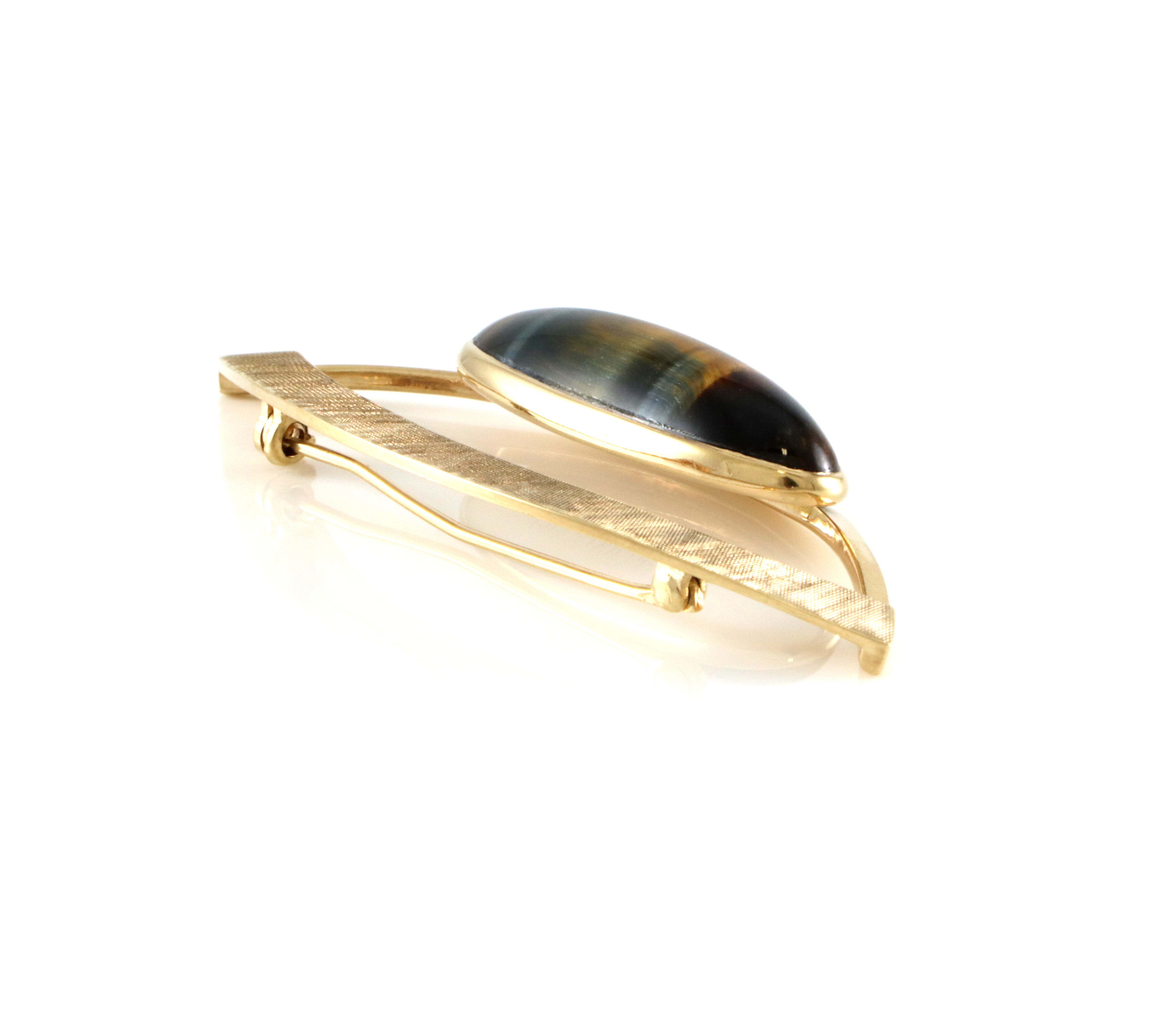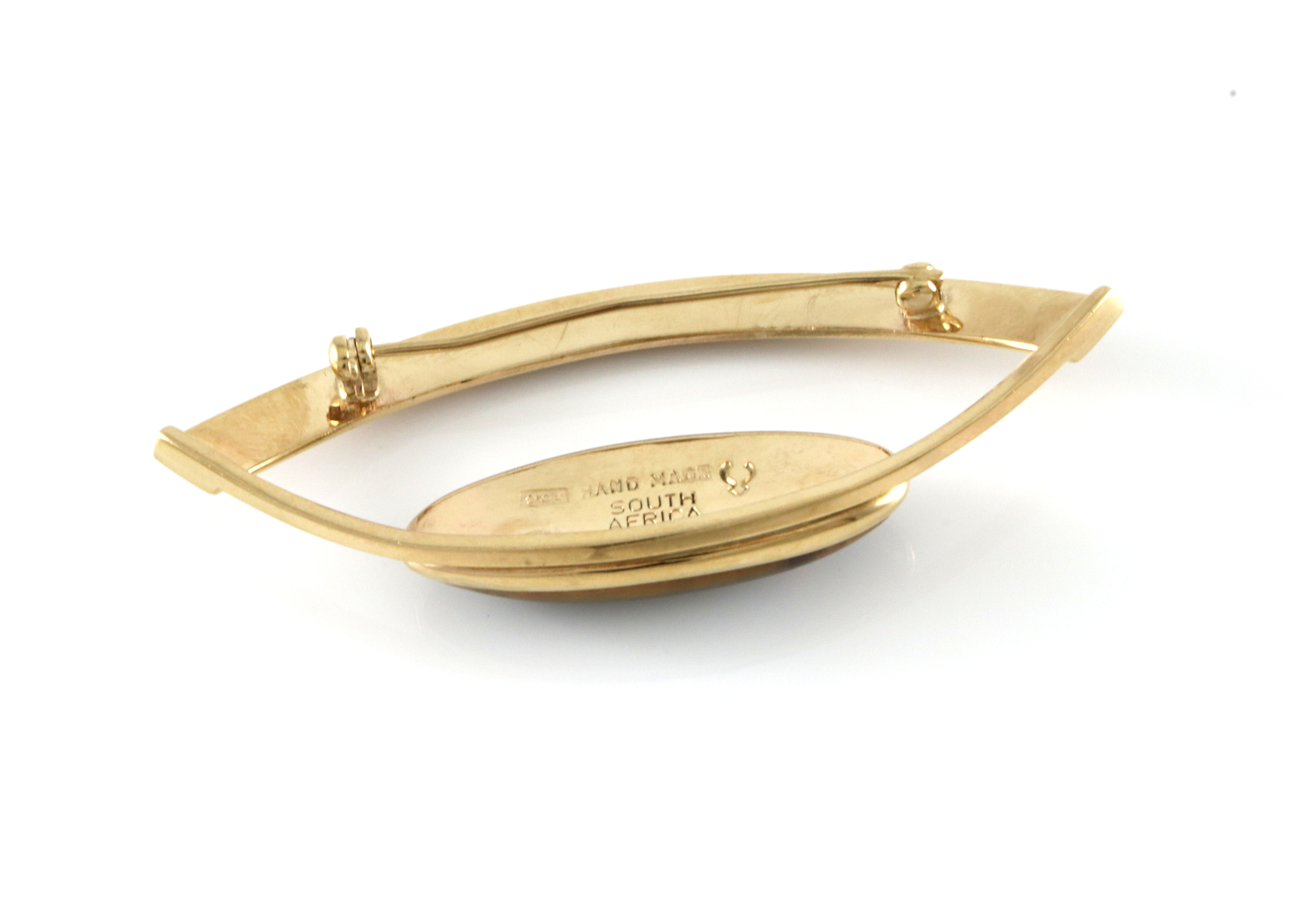 Lekker håndlaget brosje fra Sør-Afrika Med helt klart den peneste tigerøye steinen vi har sett (Bør sees!) Str: 57 x 23 mm Vekt: 8,3 gram Noe bøyd nål