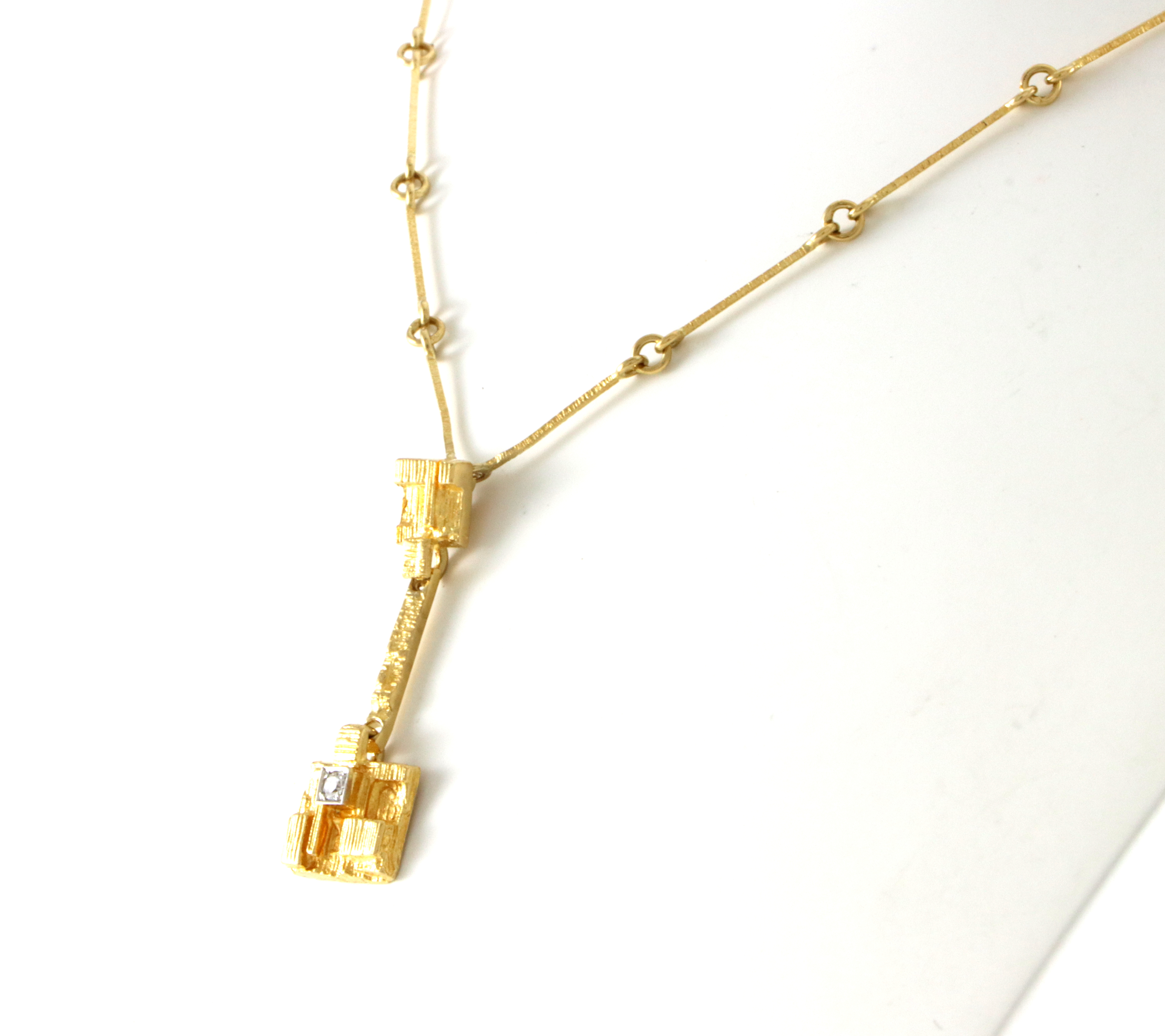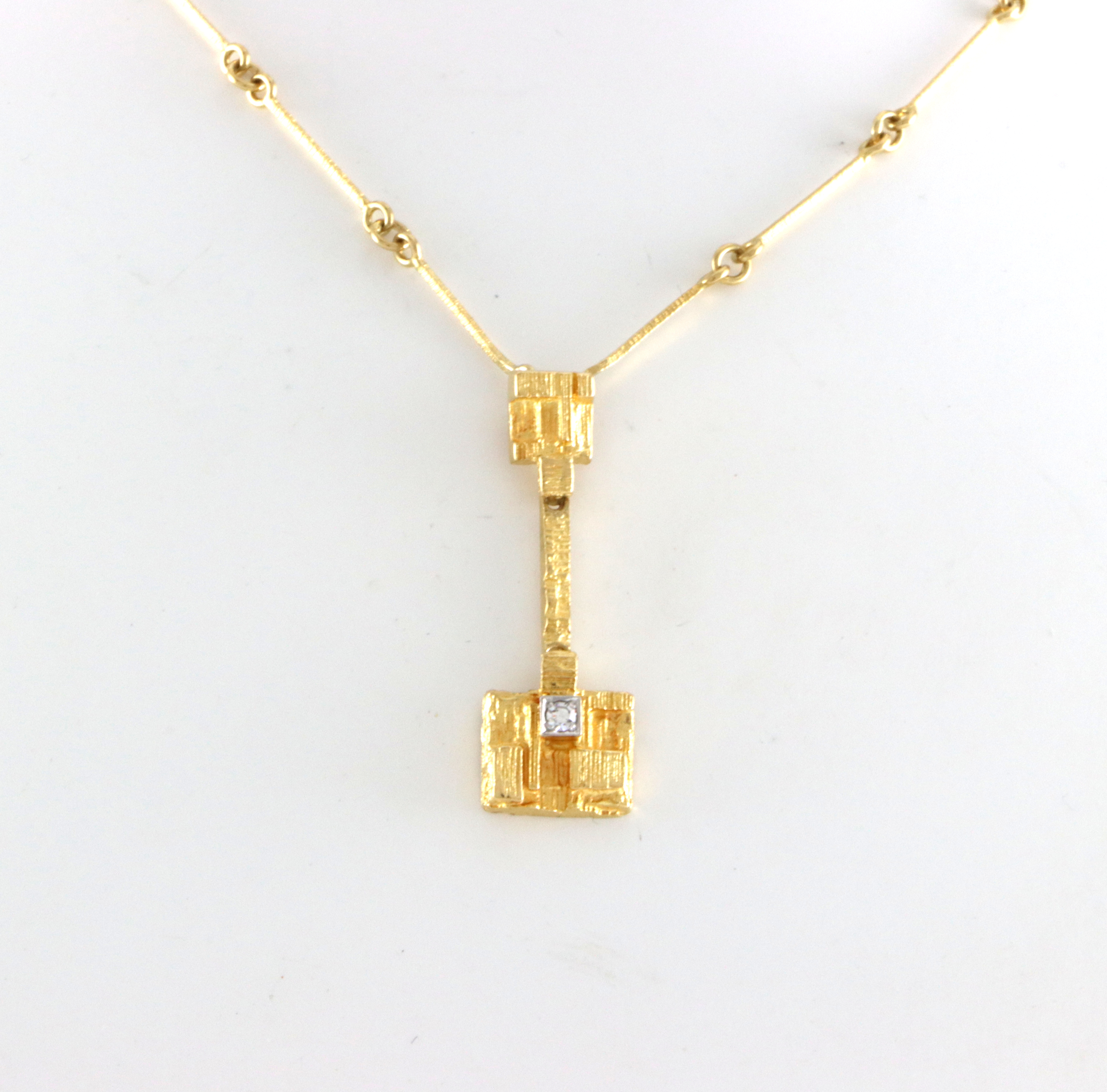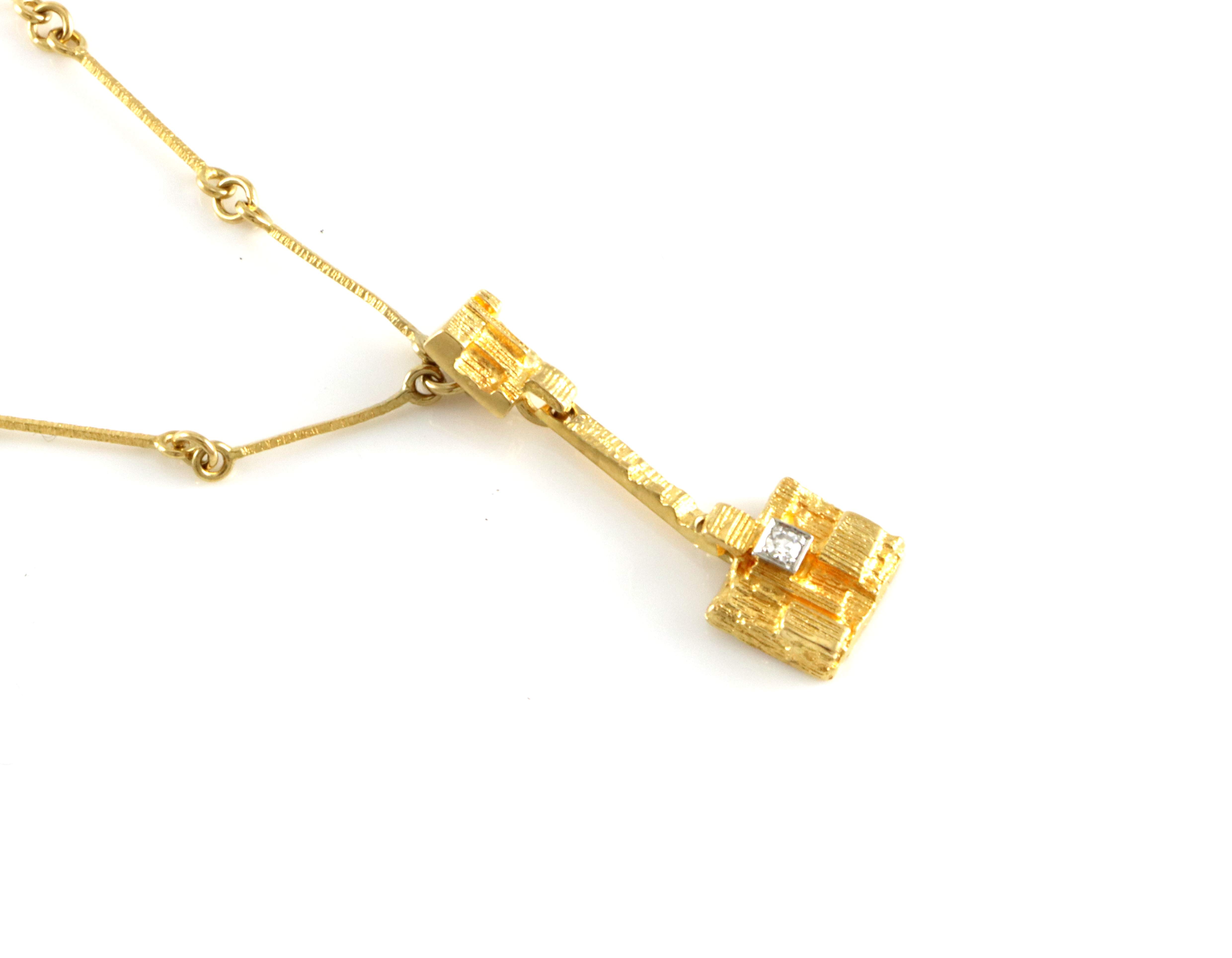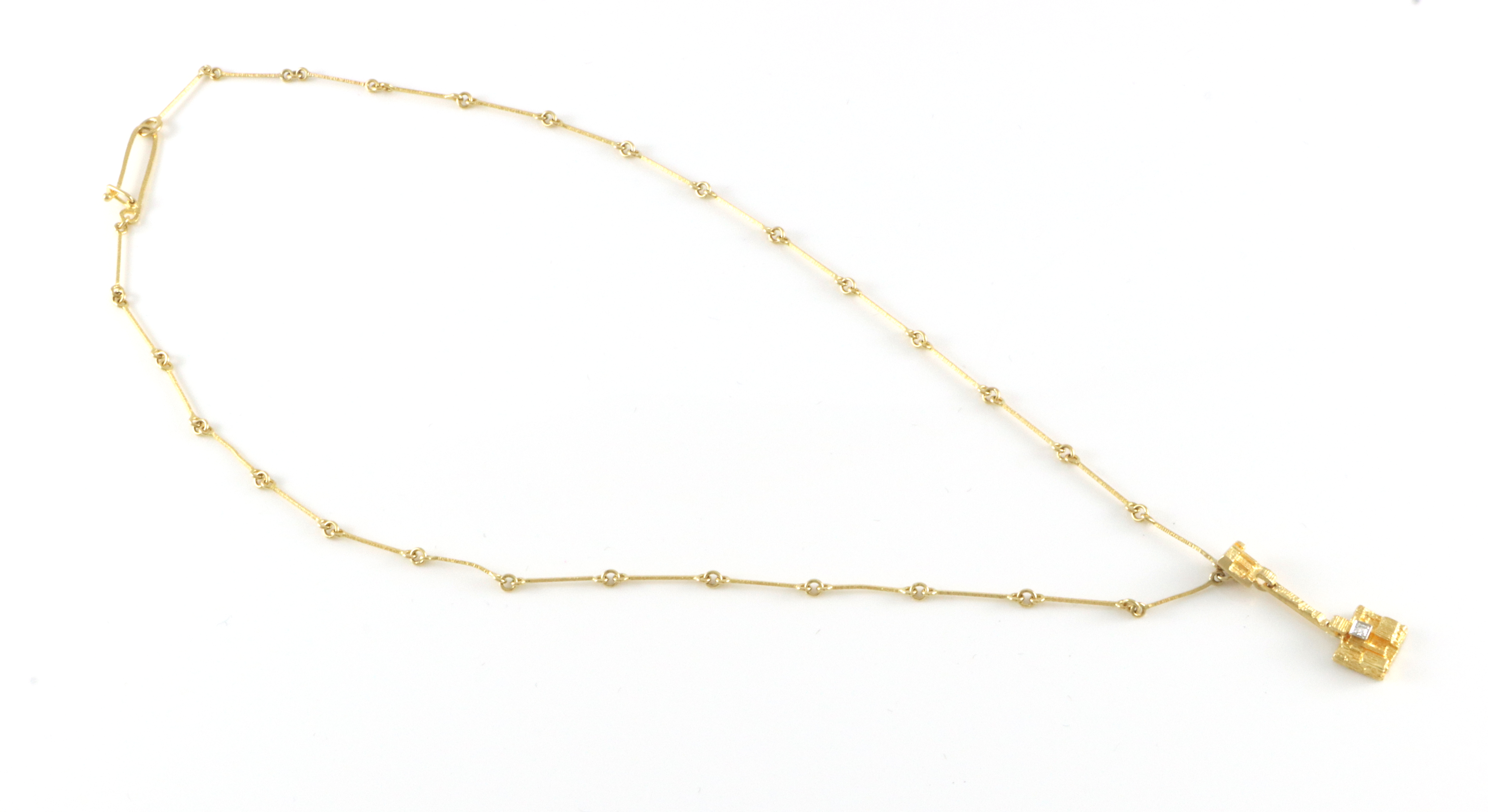Diamond city collier i 18 K gull med diamant 1977 Str anheng: 28 x 8 mm Lengde lenke: 41 cm Vekt: 4,8 gram