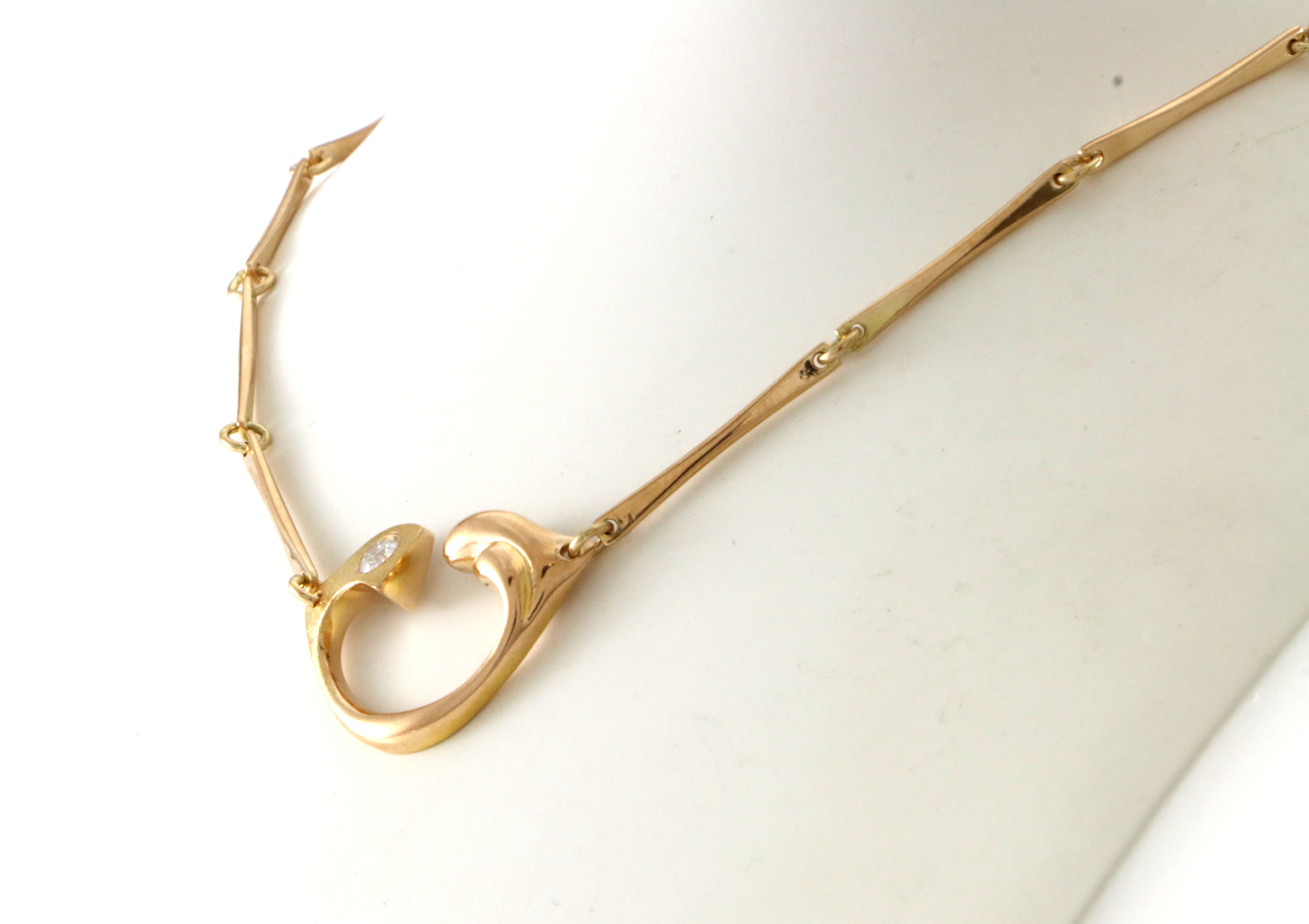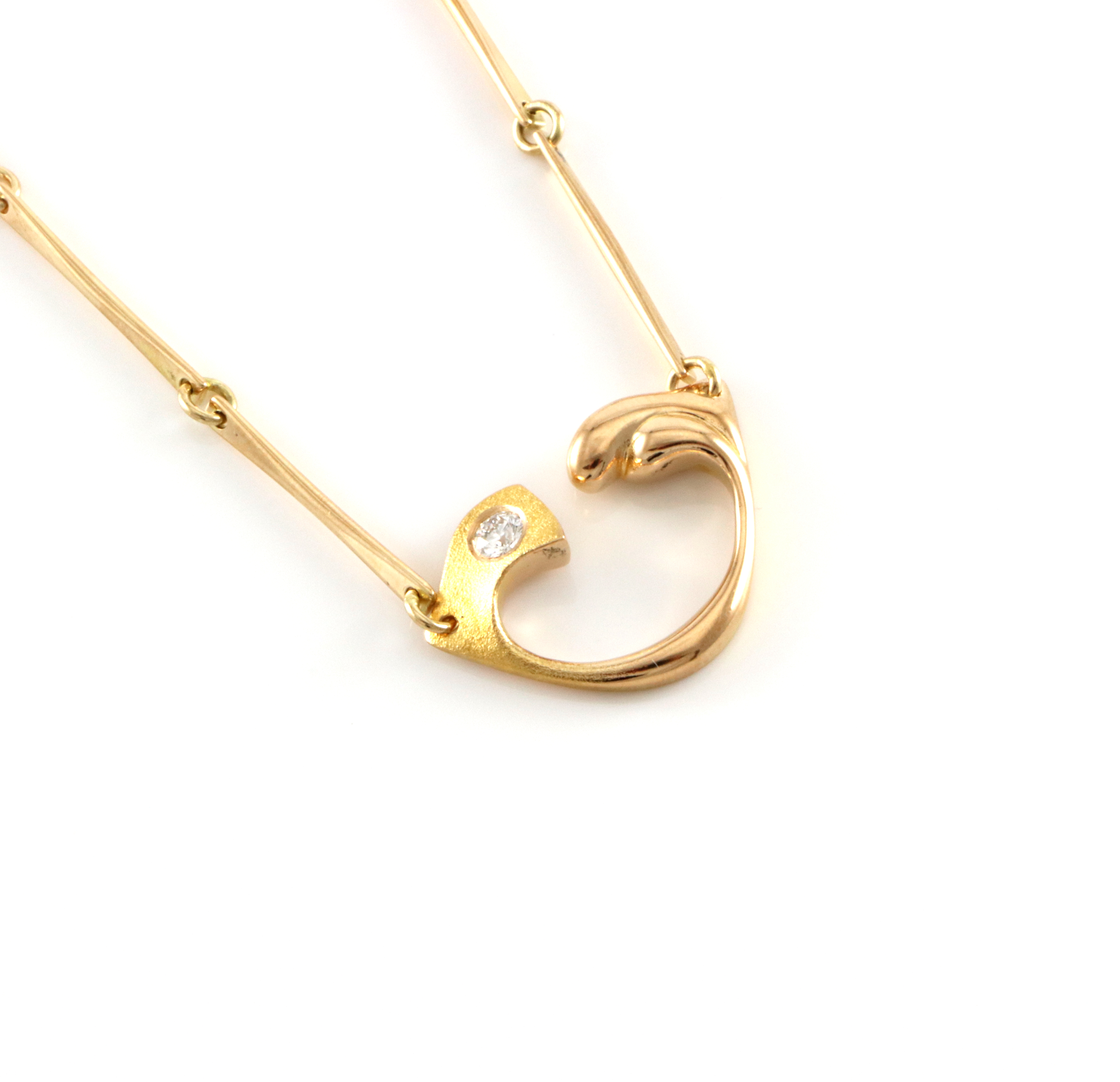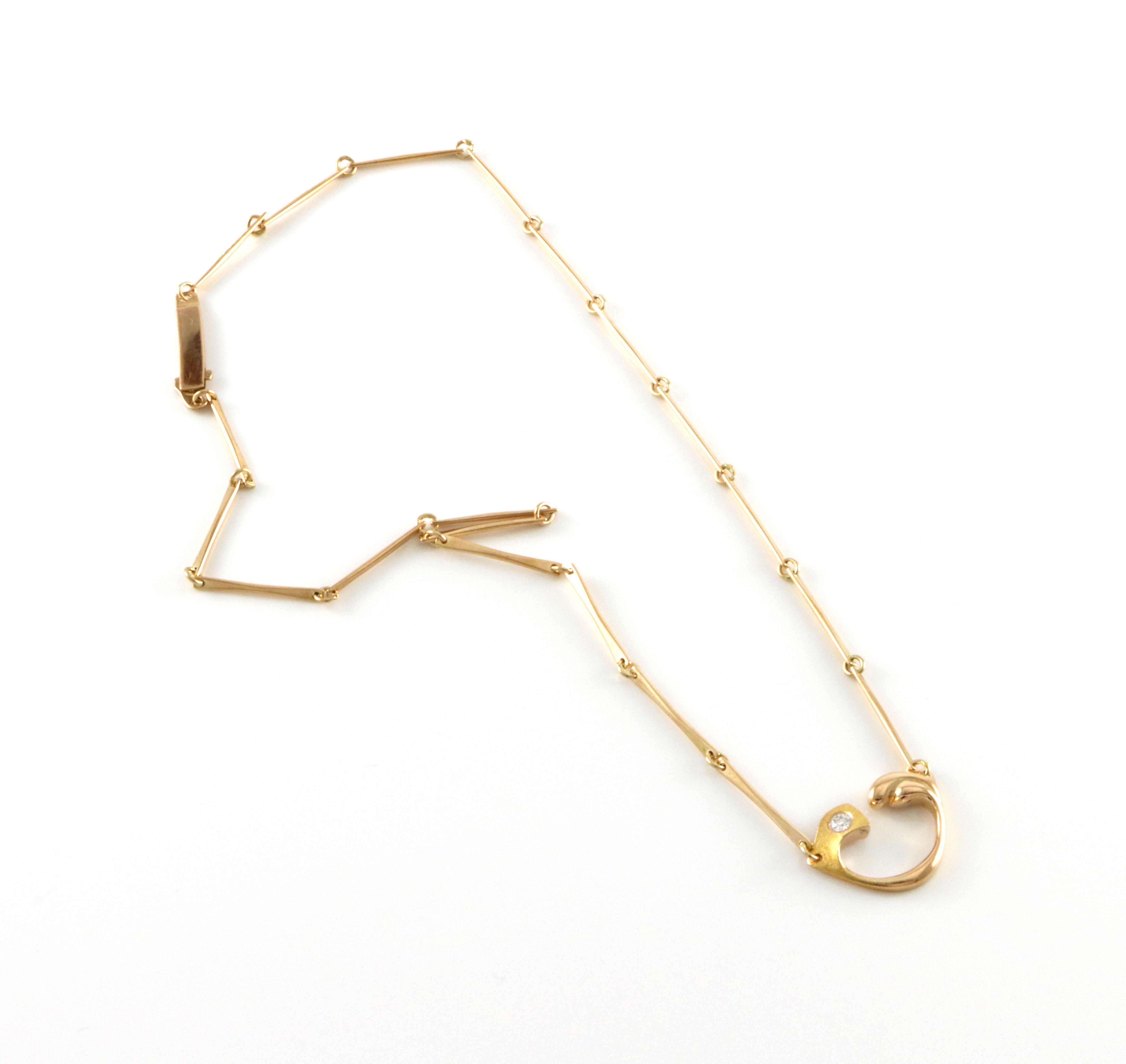 Poul Havgaard for Lapponia. "Heartbreaker" halssmykke med diamant. 1993 14 K gult gull Str anheng: 22 x 16 mm Lengde: 42 cm Vekt: 9,9 gram Fremstår som svært lite brukt