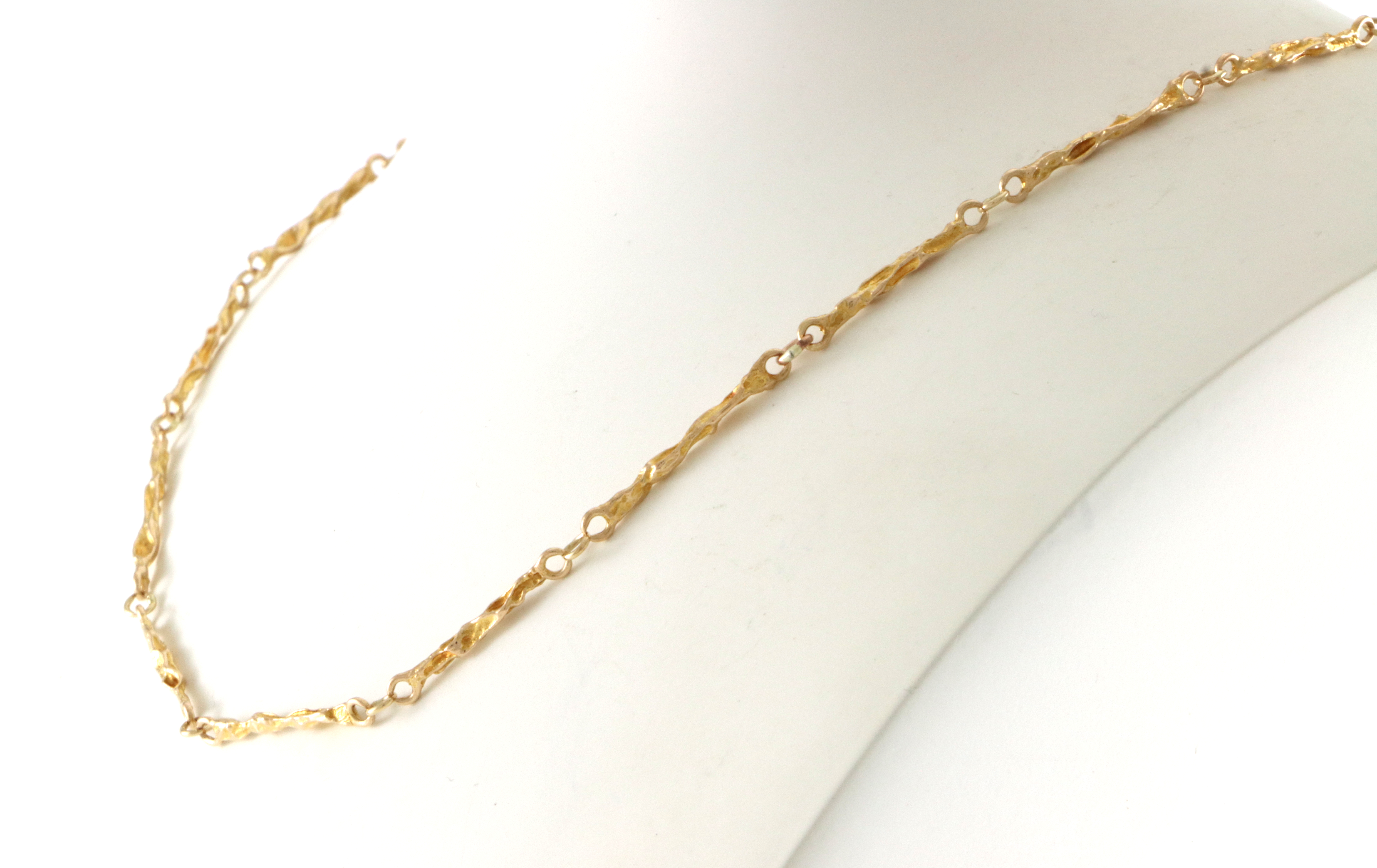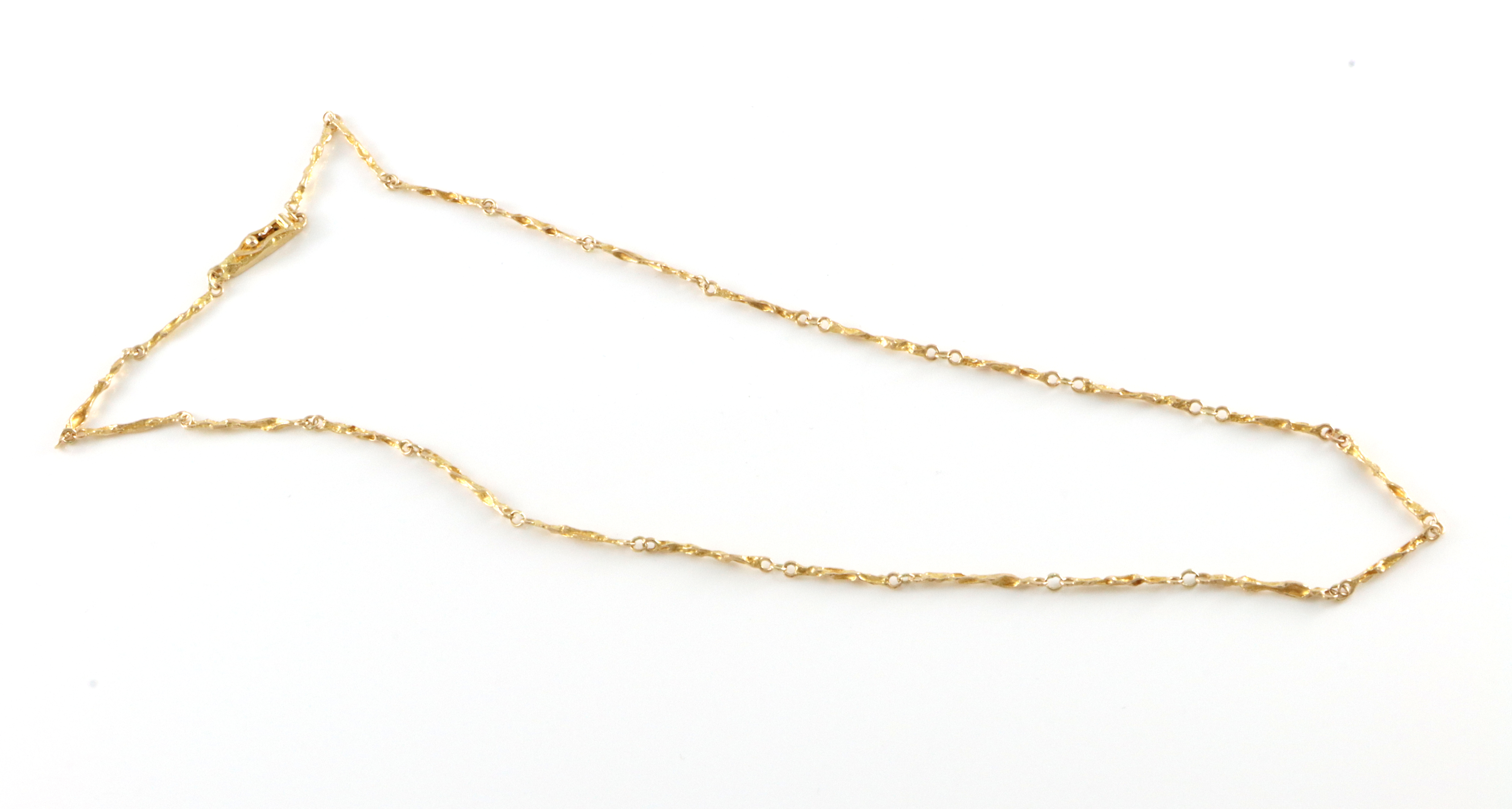 Leddet lenke i 14 K gull 1993 Bredde: 2 mm Lengde: 49 cm Vekt: 7,7 gram Kasselås med sikkerhetshempe En av ringene/øsknene er uorginal