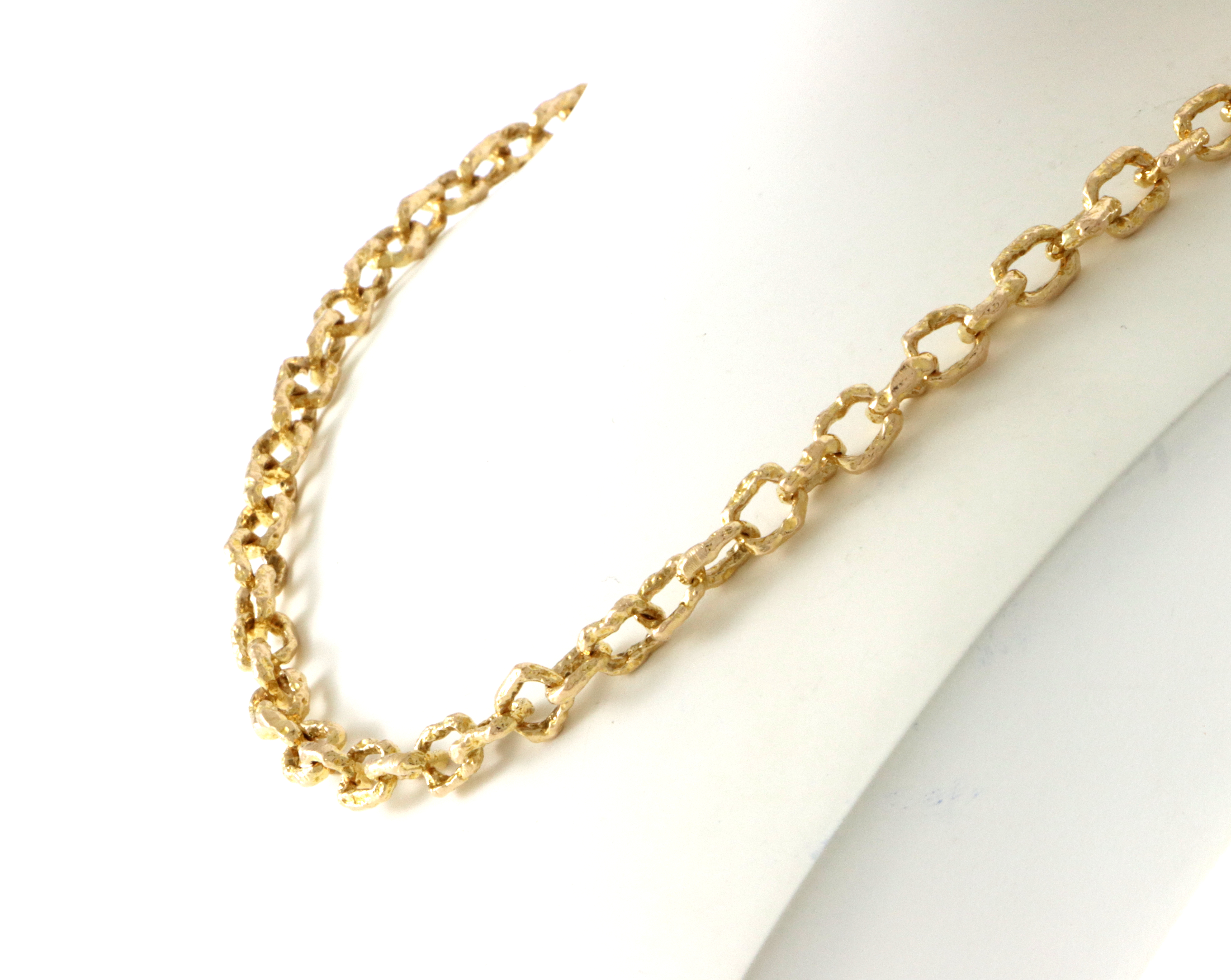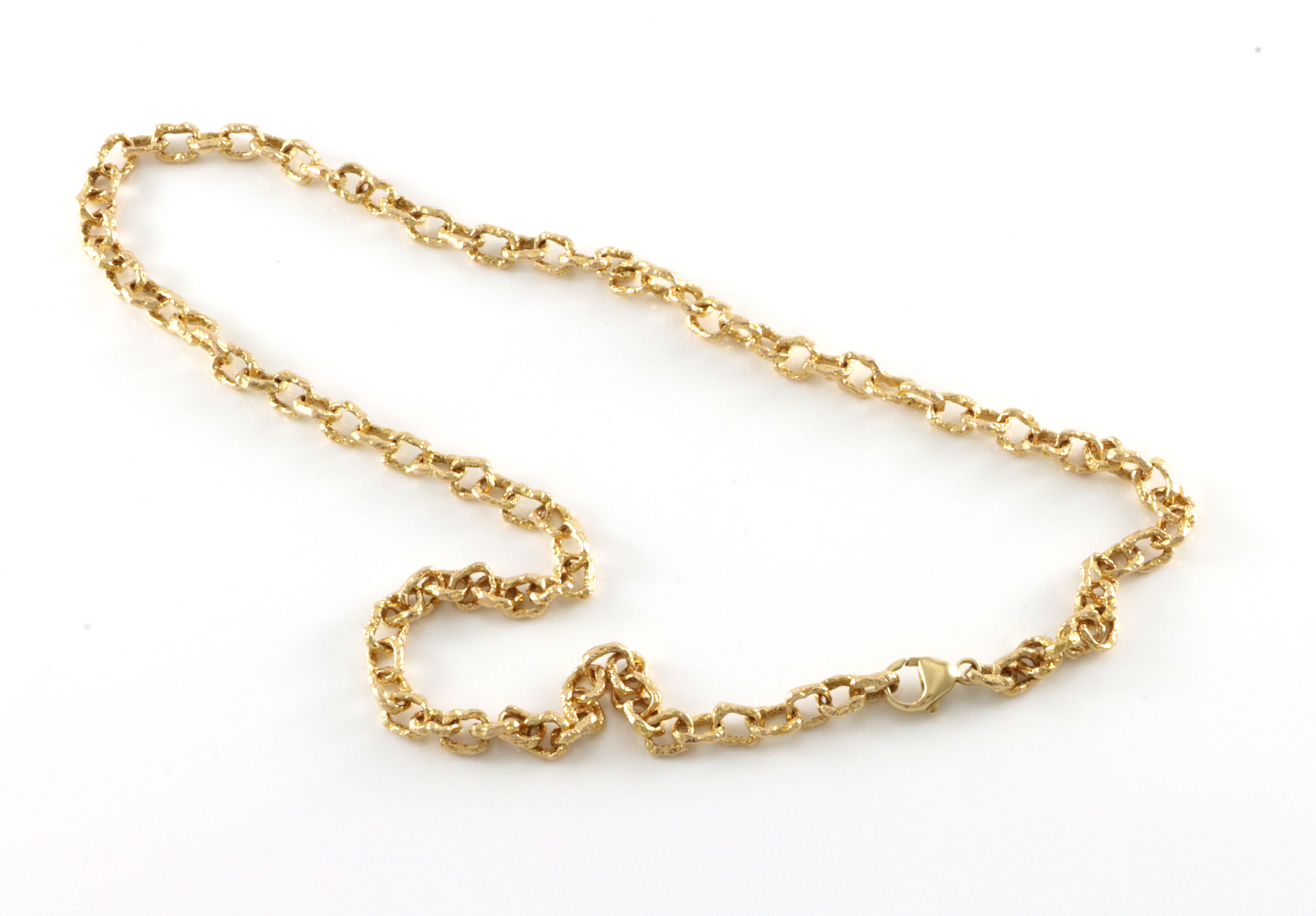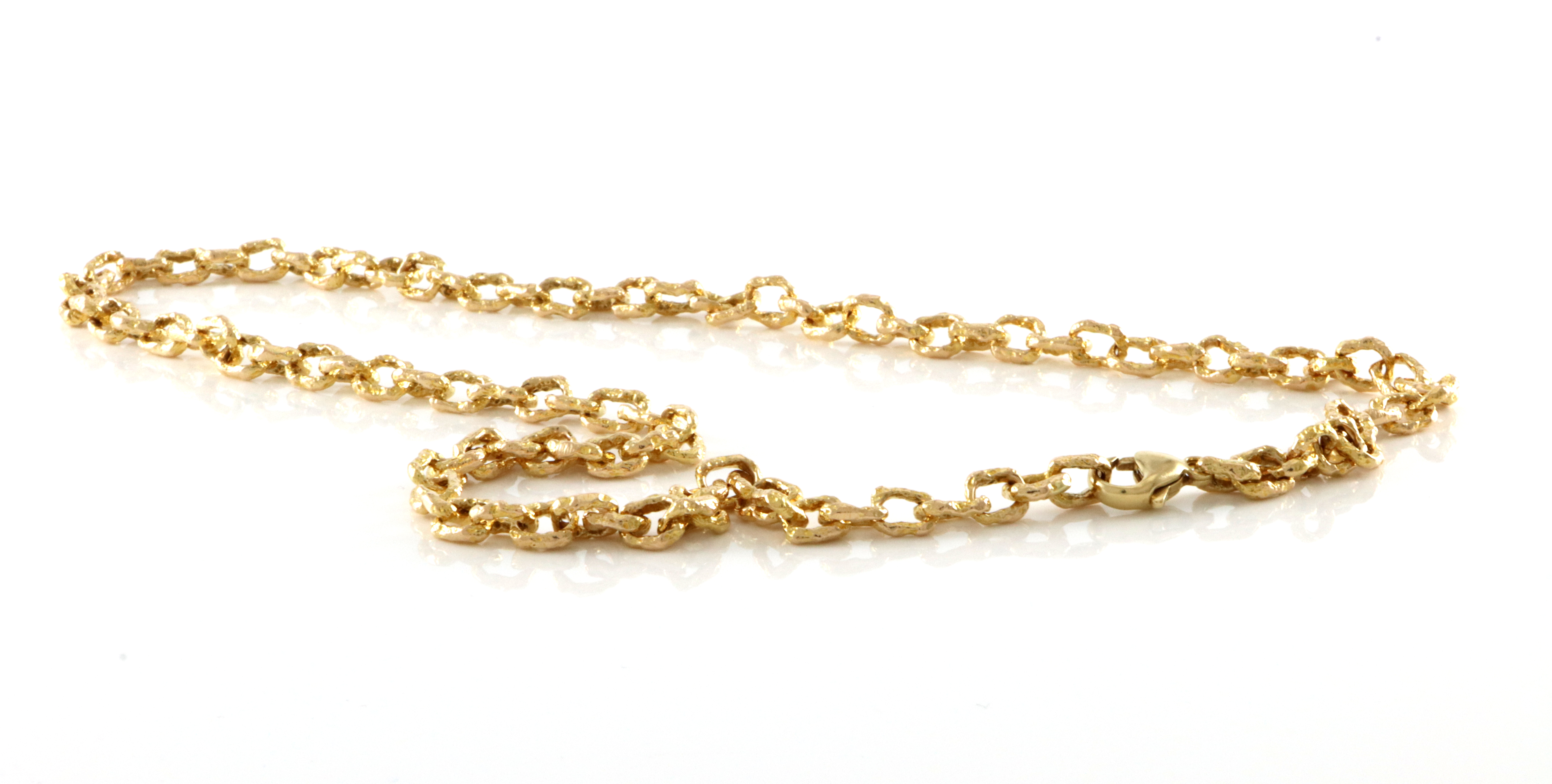 Røff lenke fra Lapponia i 14 K gull. Trolig design fra Björn Weckström Denne er uten stempler og grunnen til det er nok at låsen er skiftet. Vi har også tilhørende armlenke og stemplet sitter på låsen. Armlenken er produsert i 1984 og det er trolig halslenken også. Bredde: 5,6 mm Lengde: 49 cm Vekt: 35,1 gram I god stand