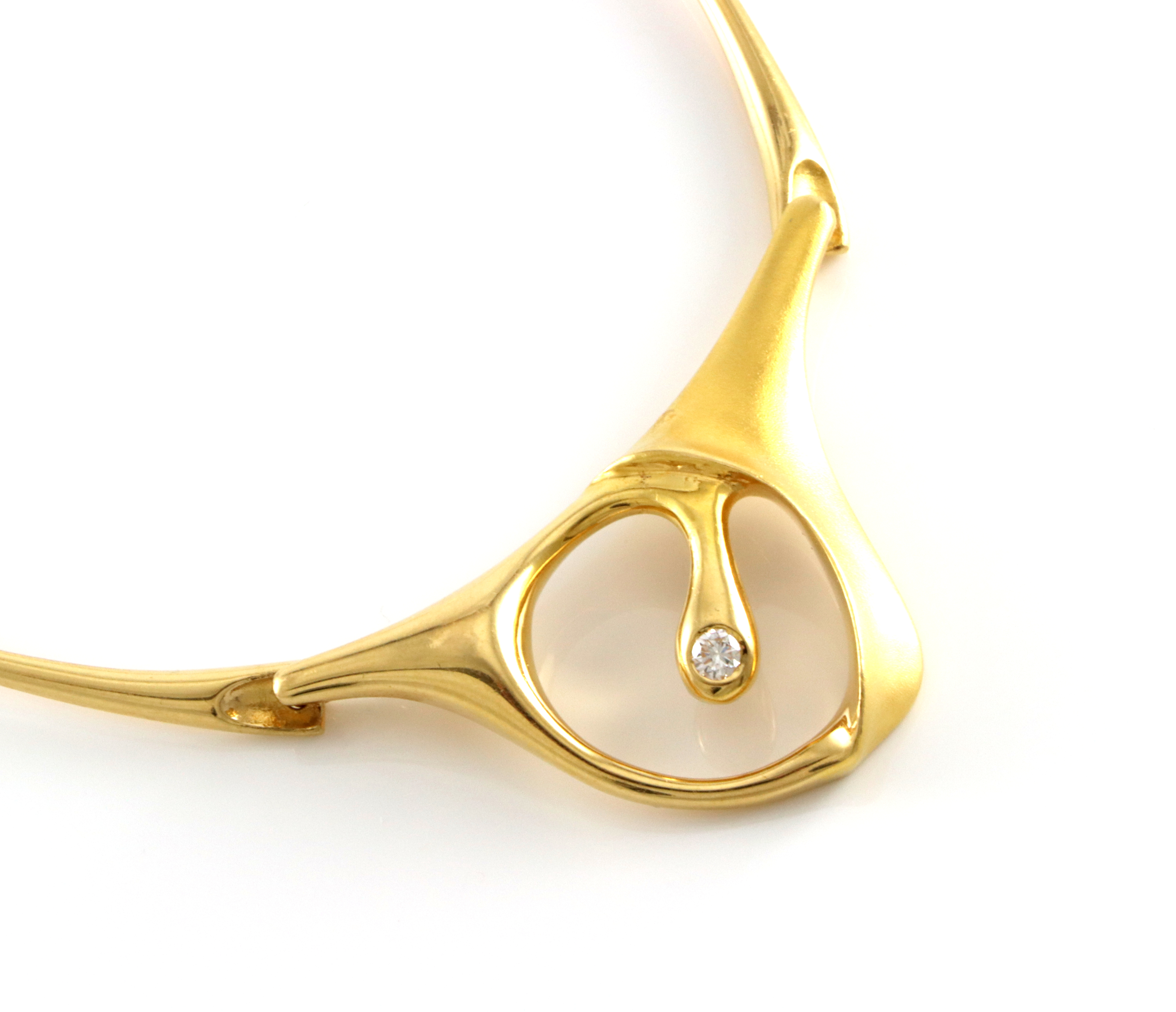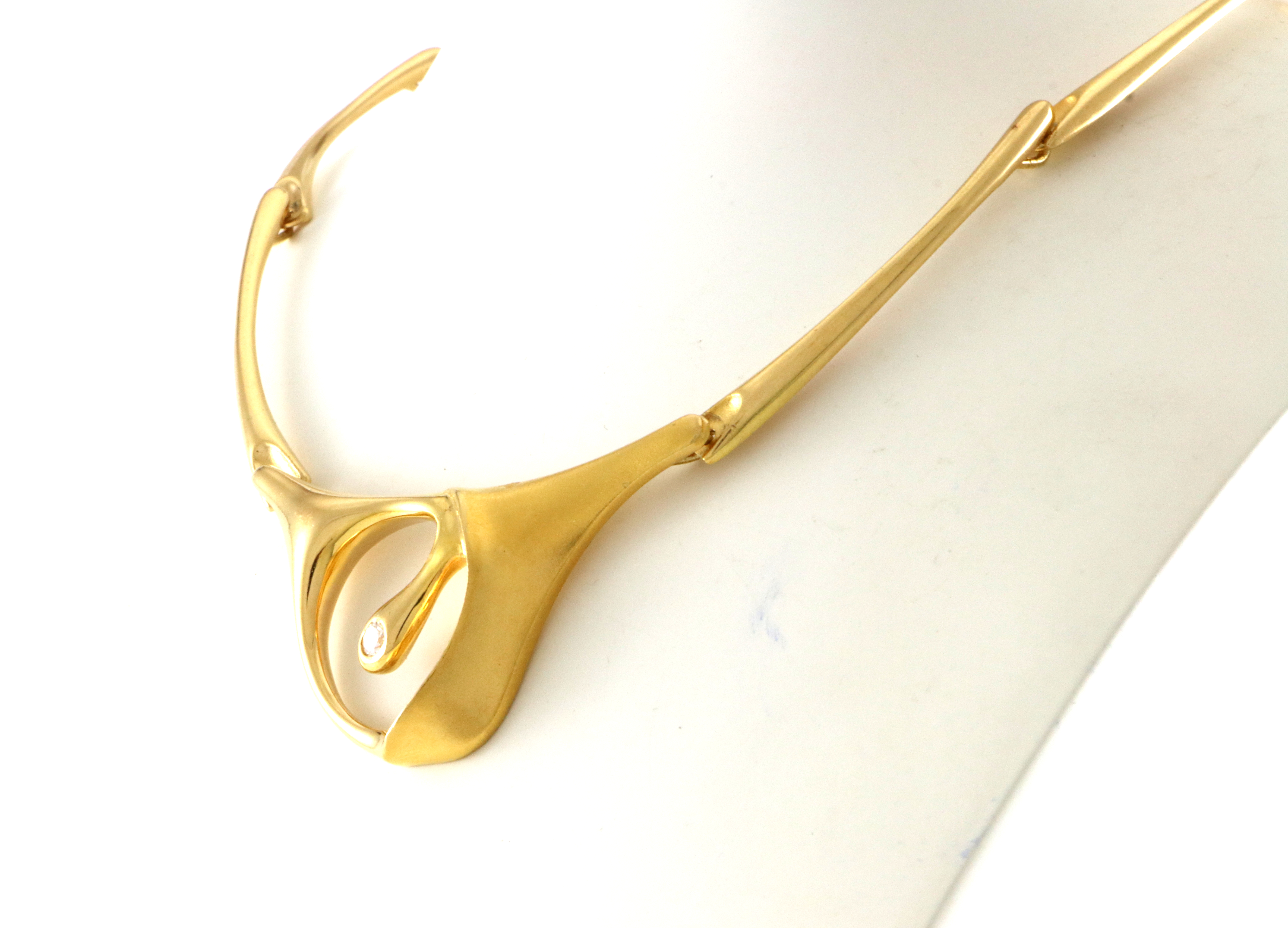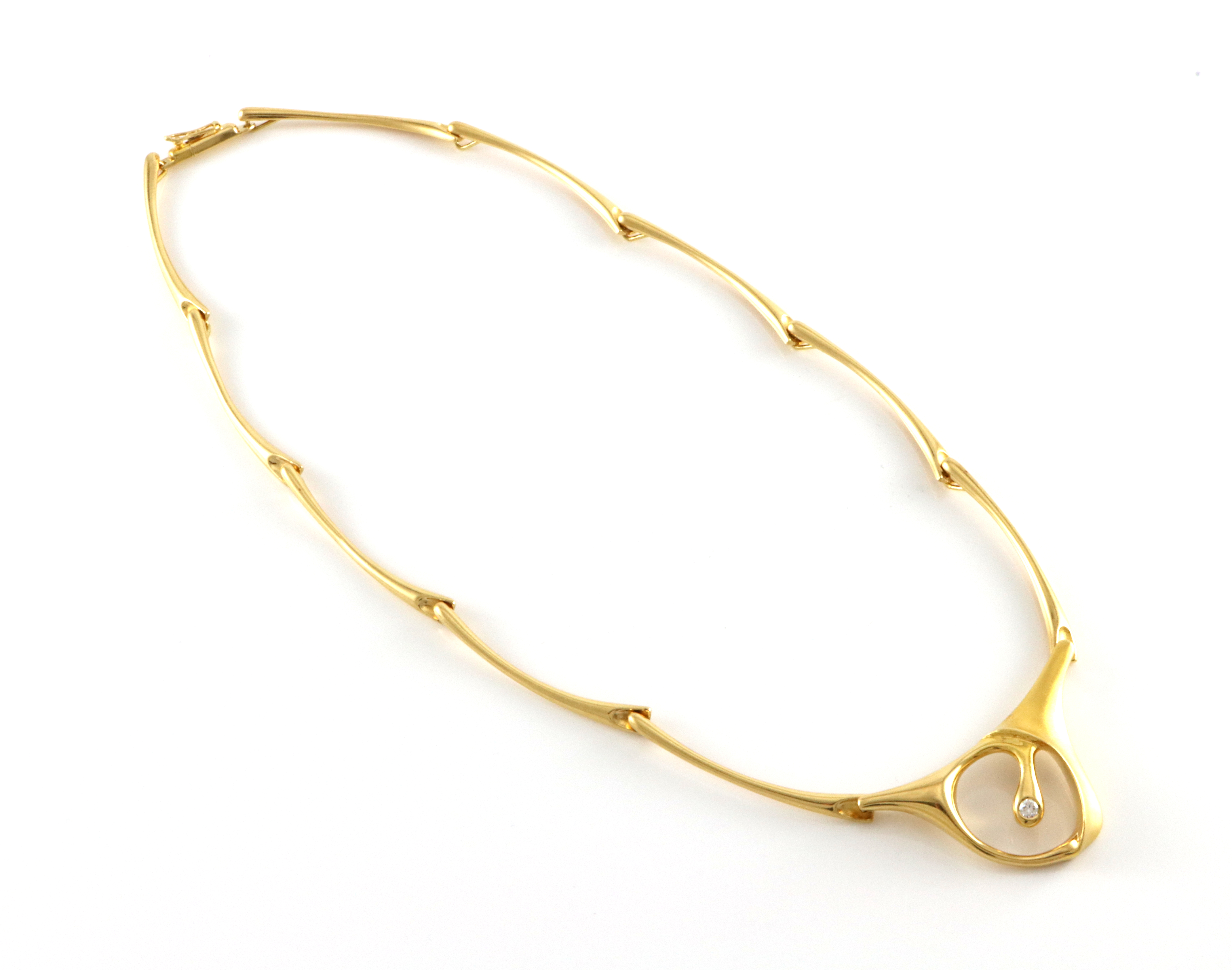 Litt usikker på hvem som har designet dette. Det kan godt være Poul Havgaard 1992 Diamant på 0,10 ct (risset inn på baksiden) Str anheng: 45 x 23 mm Lengde: 44 cm Vekt: 32,6 gram Kasselås med sikkerhetshempe Fremstår tilnærmet ubrukt