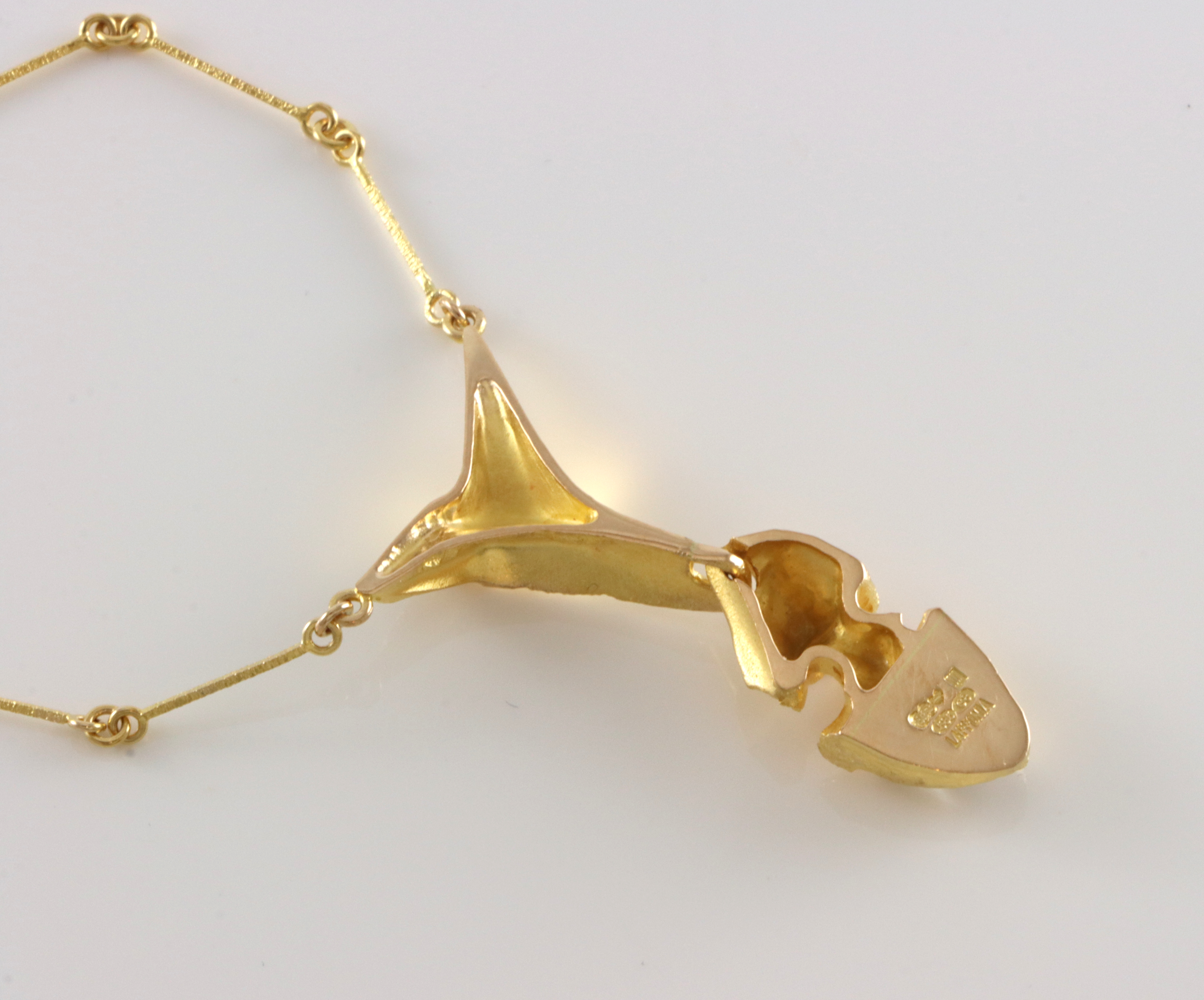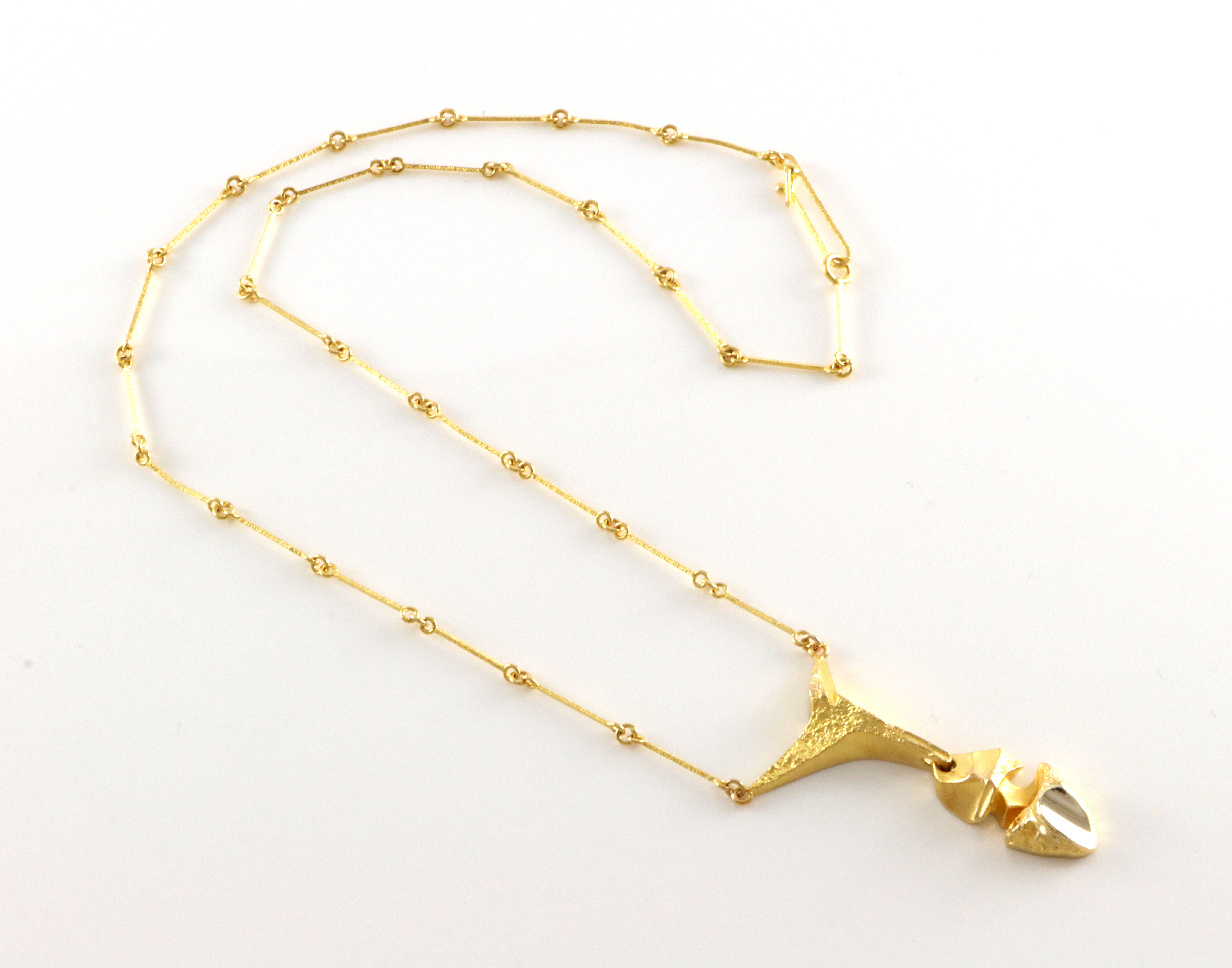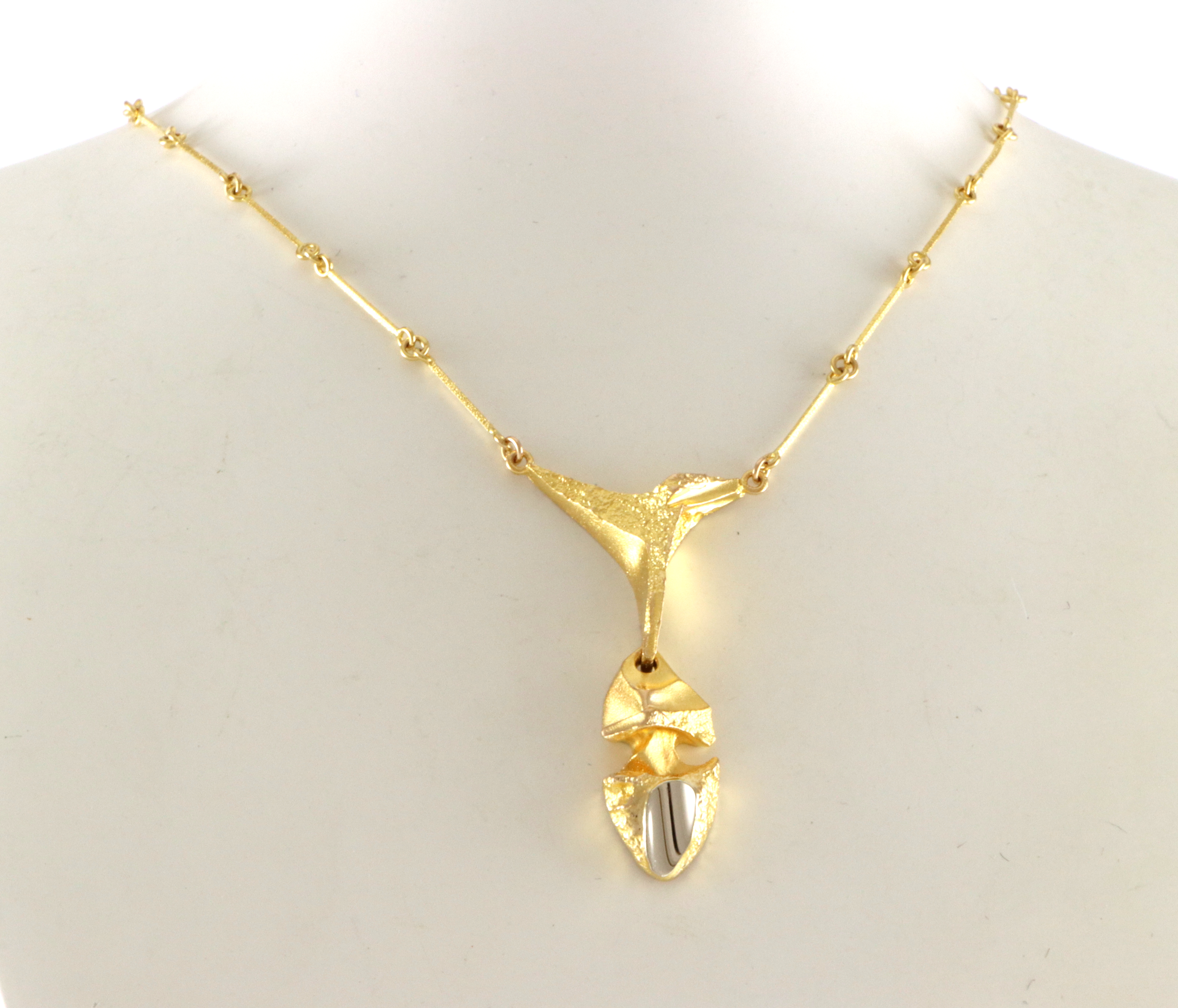 Flott halssmykke fra Björn Weckström. 14 K gult gull. Platina er lagt på en del av anhenget Str anheng: 41 x 22 mm Lengde: 44 cm Vekt: 8,5 gram Fremstår tilnærmet ubrukt