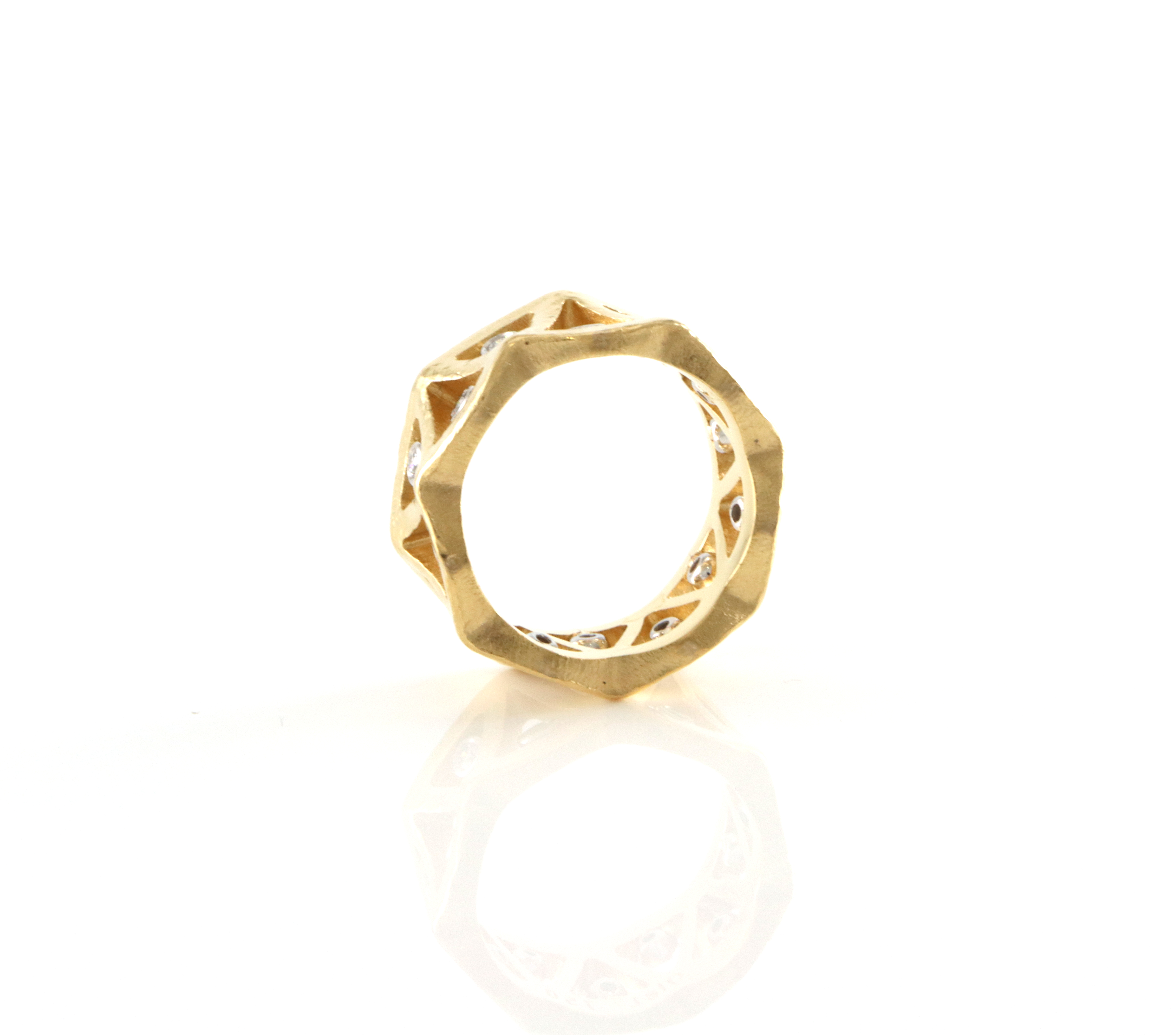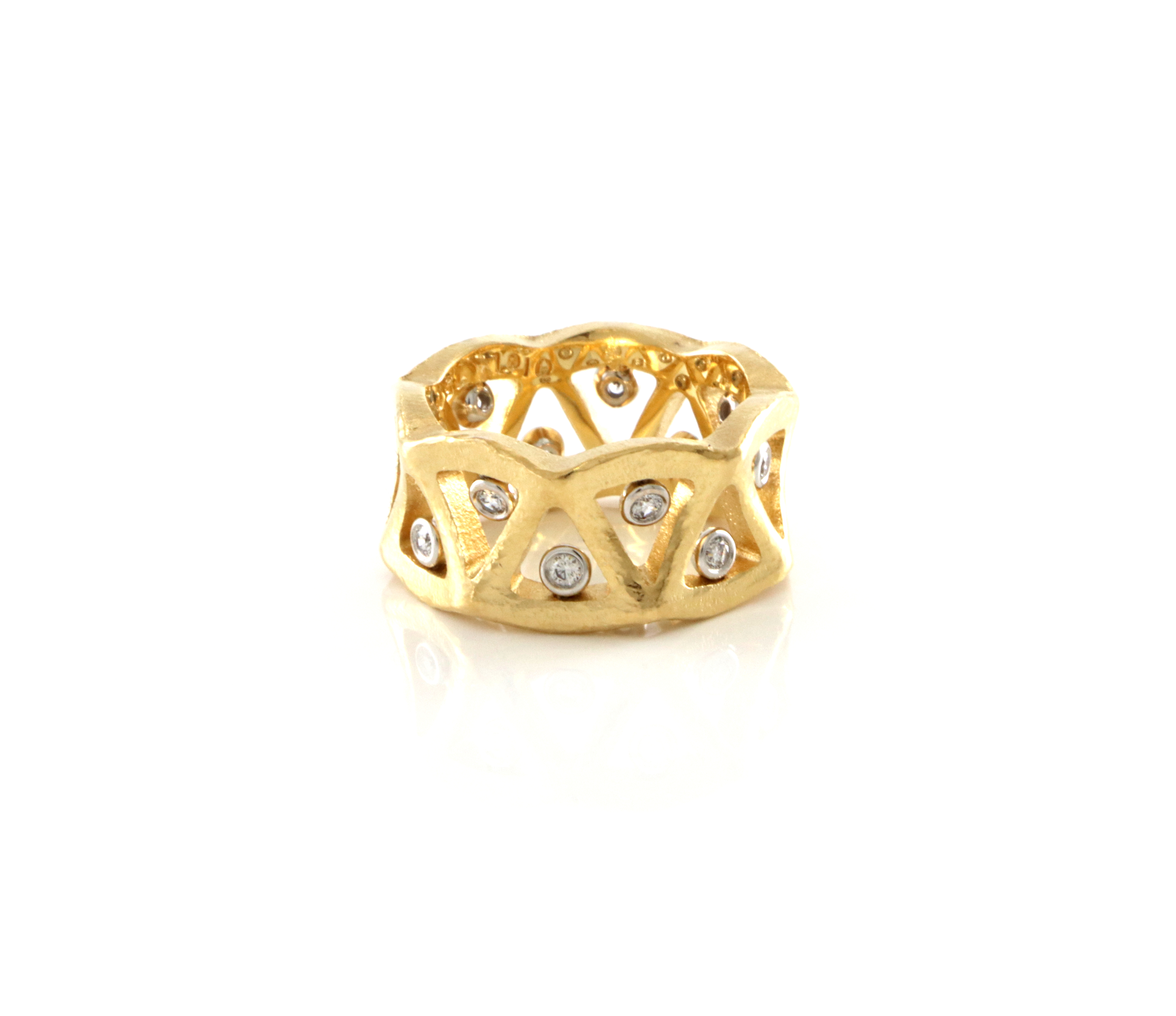 Svært lekker ring fra Ole Lynggaard "Prisme" 18 K gult børstet gull med diamanter på tot 0,28 ct Bredde: 10 mm Ringstr: 54 (NB bred skinne) Vekt: 12,8 gram