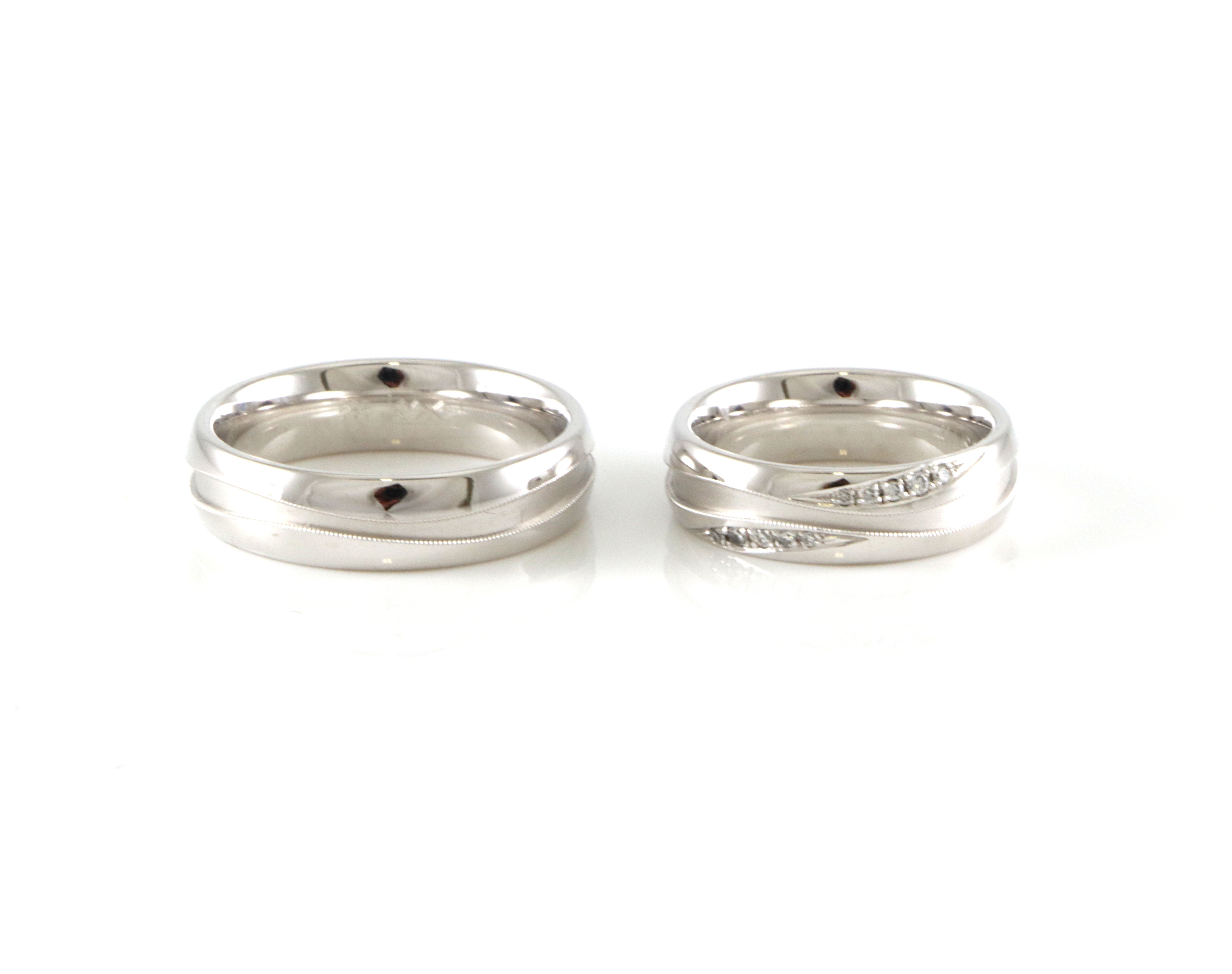 Den minste ringen har små diamanter på tot 0,092 ct Bredde: 6 mm Ringstr: 64 og 54 Vekt: 18 gram (to ringer) Ubrukte