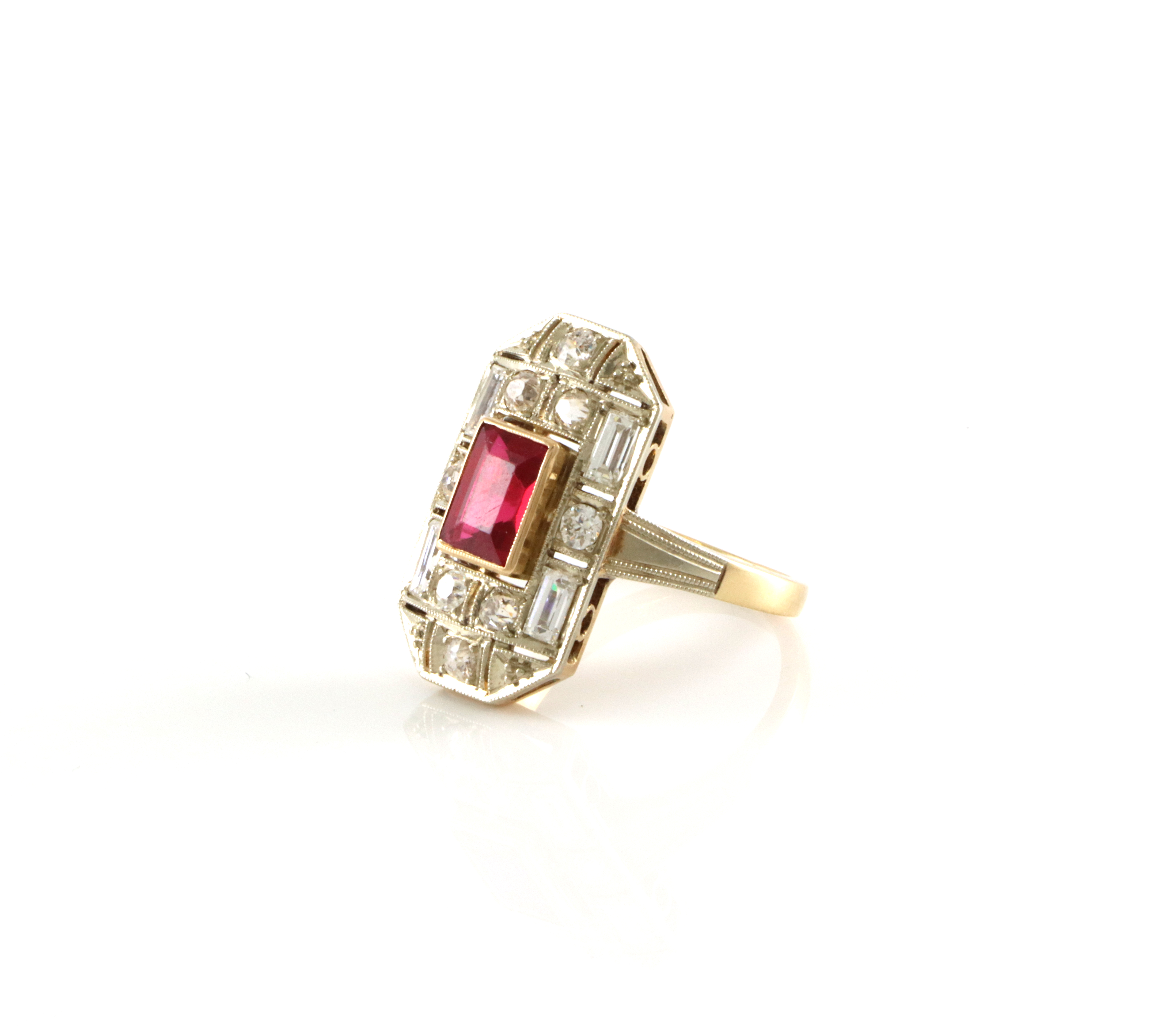 Fantastisk vakker Art Deco ring med diamanter på tot 1,20 ct og en syntetisk korund. Tekniske data hentet ut fra takstbrevet: Ring i gult- og hvitt gull. Testet til ca 585. Fattet med baguettslipt syntetisk korund 8,0 x 6,0 mm. Fattet med 12 stk old cut og baguetteslipte diamanter tot ca 1,20 ct G-J/S1-P1/Poor-Fair