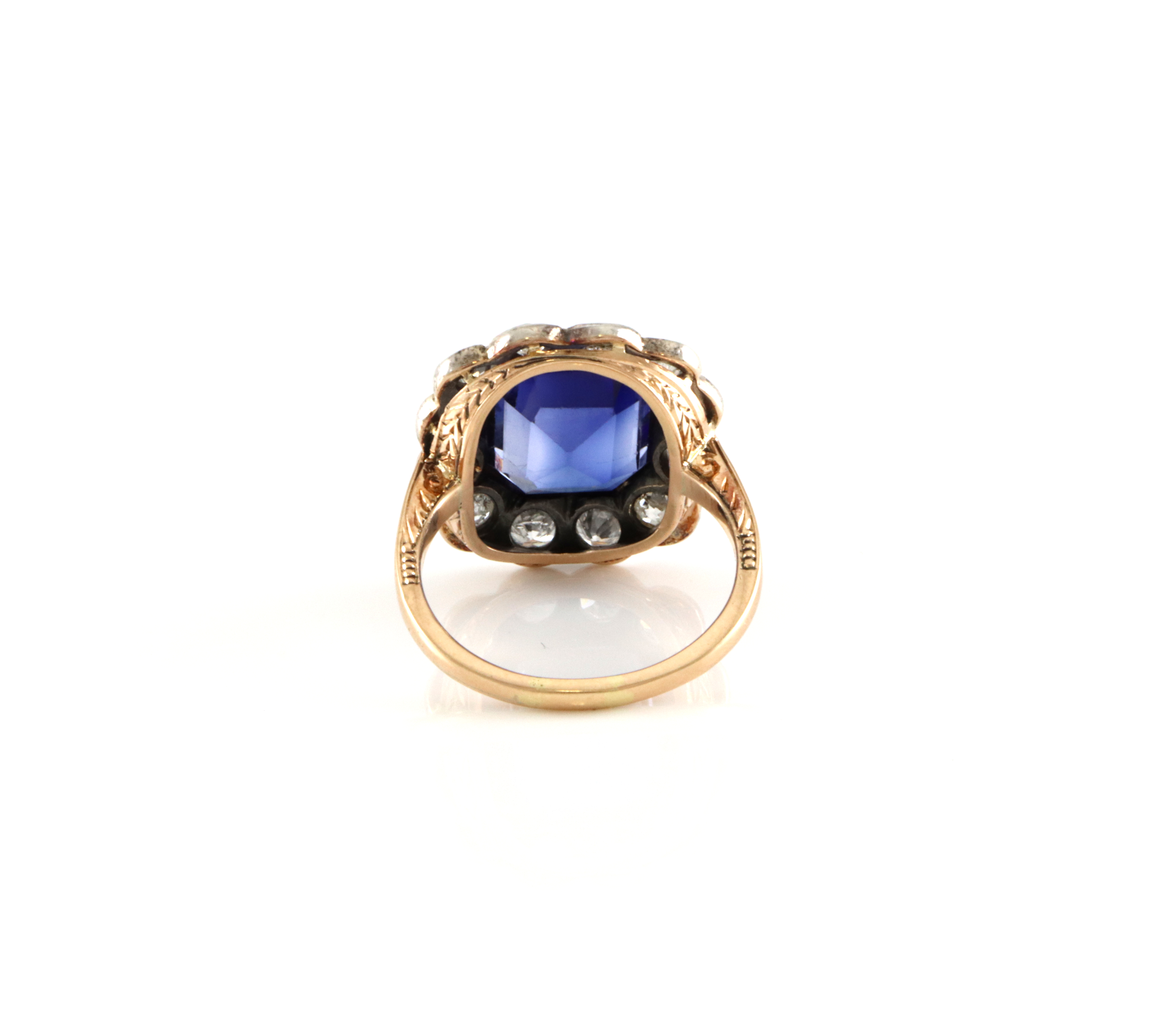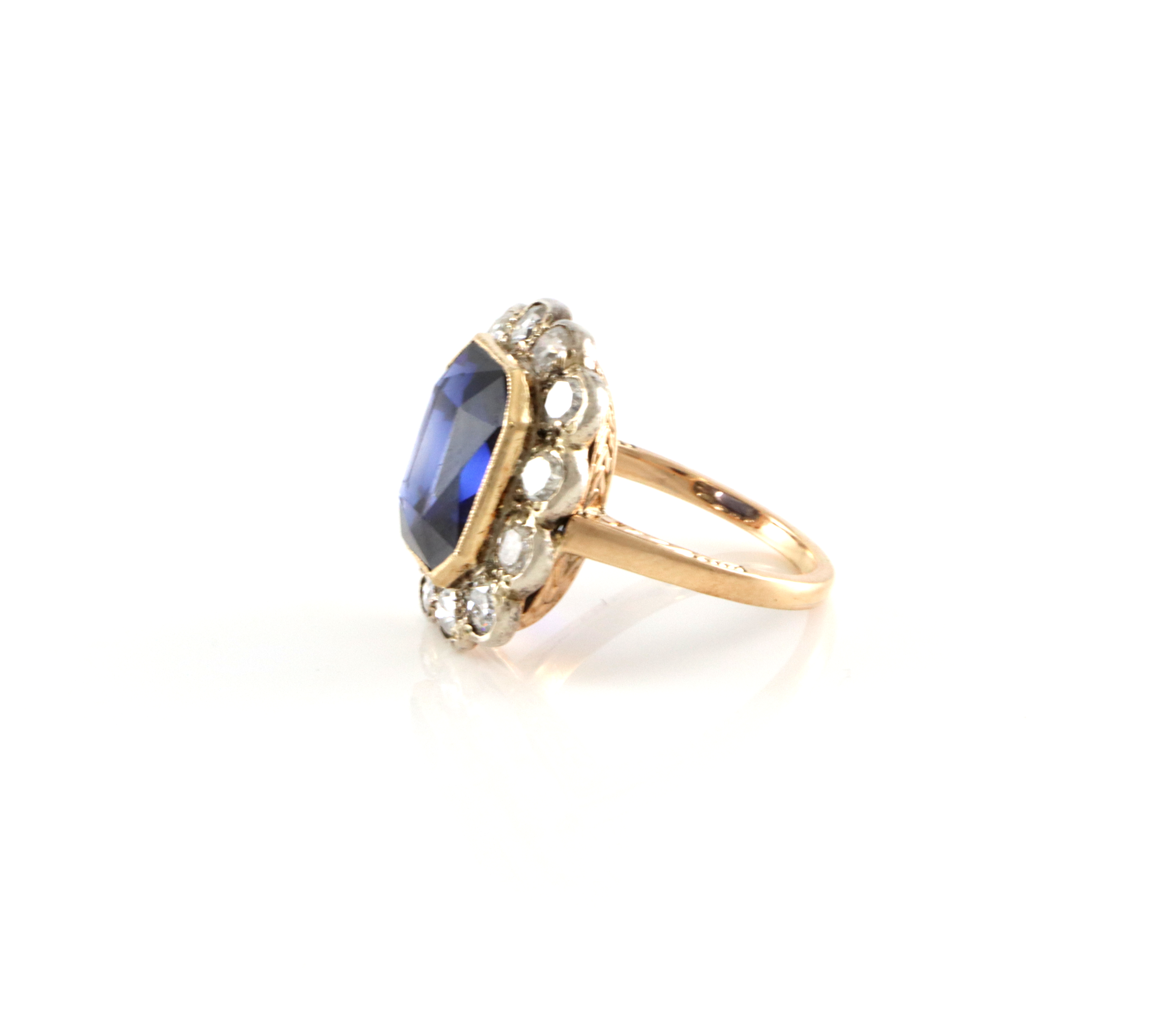 En helt utrolig vakker antikk ring! Med diamanter på ca tot 1,50 ct og syntetisk korund på 12,5 x 11,0 mm Opplysninger hentet ut fra takstbrevet: Ring gult gull/Sølv, håndlaget. Testet til ca 585 og sølv. Fattet med smaragdslipt syntetisk korund 12,5 x 11,0 mm. Fattet med 12 stk old cut diamanter tot ca 1,50 ct G-H/P1-P2/Poor. Vekt 6,2 gram