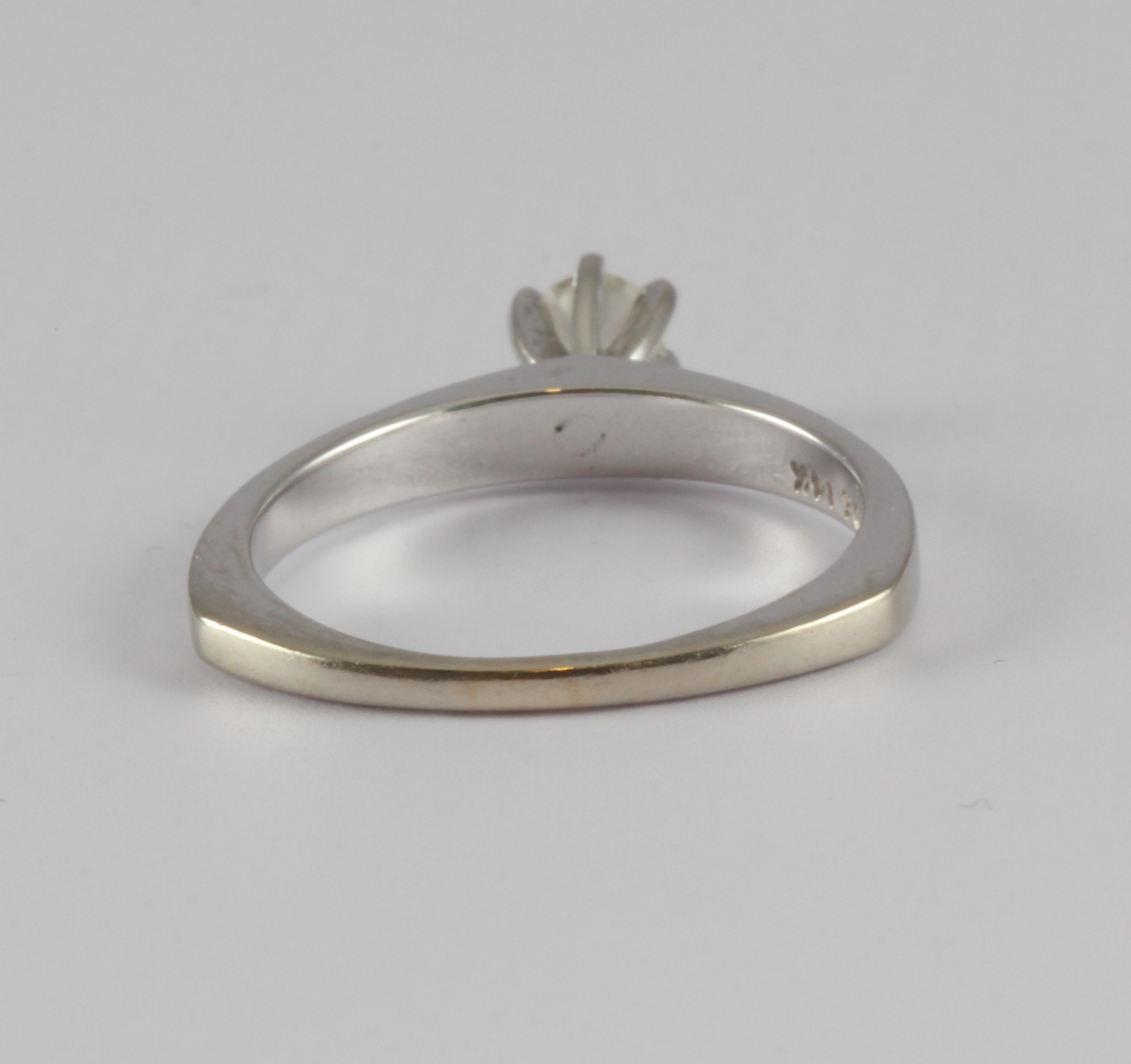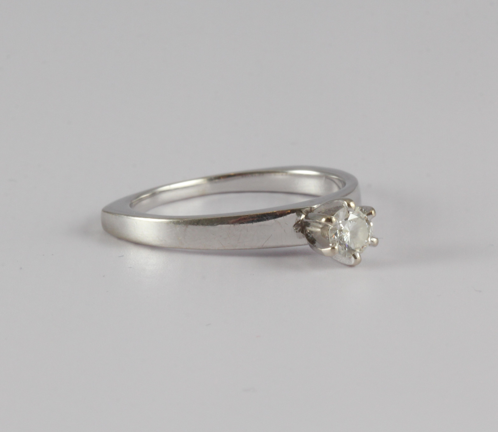 14 karat hvitt gull med diamant på ca 0,15-0,20ct. Høy krone
