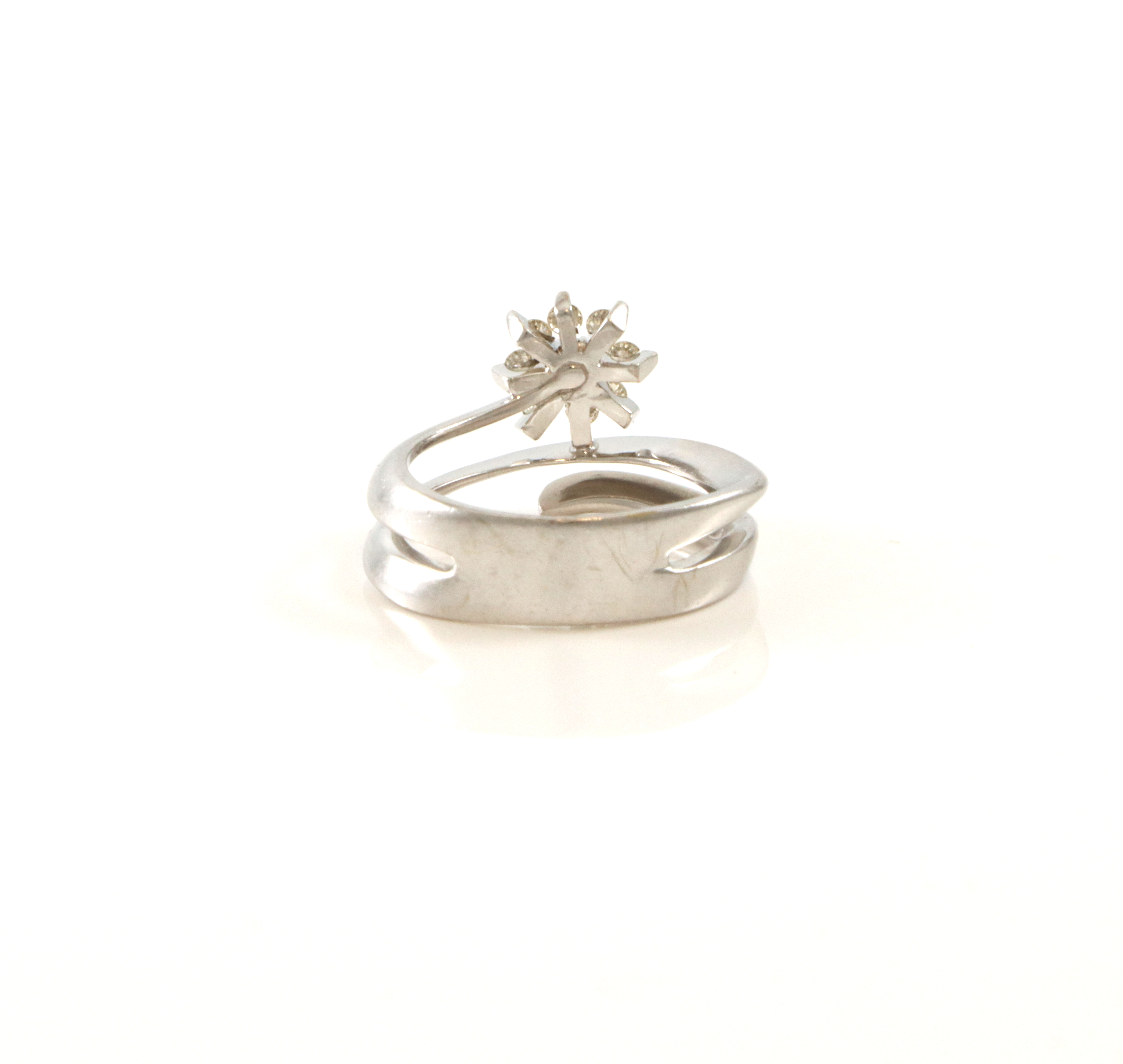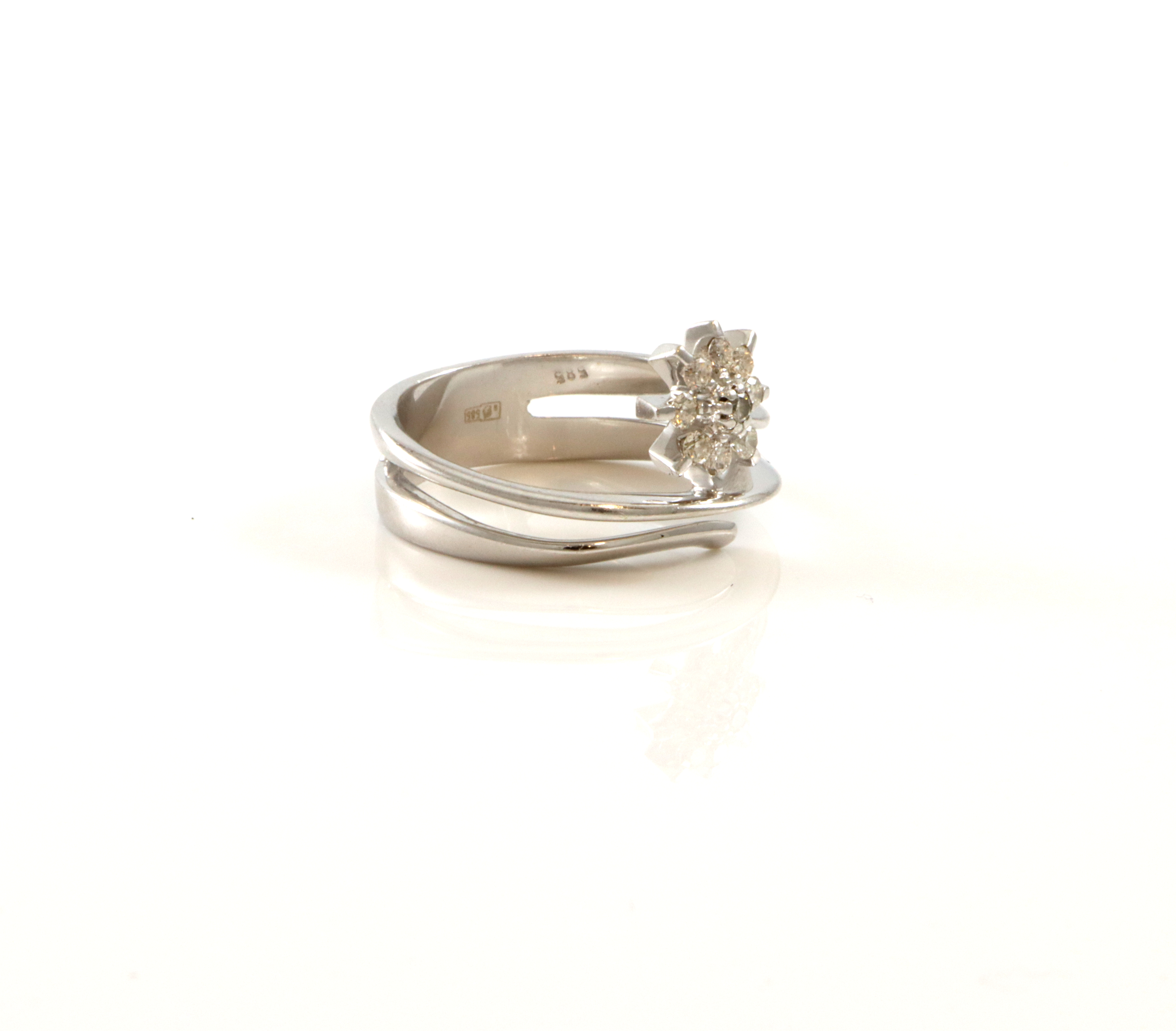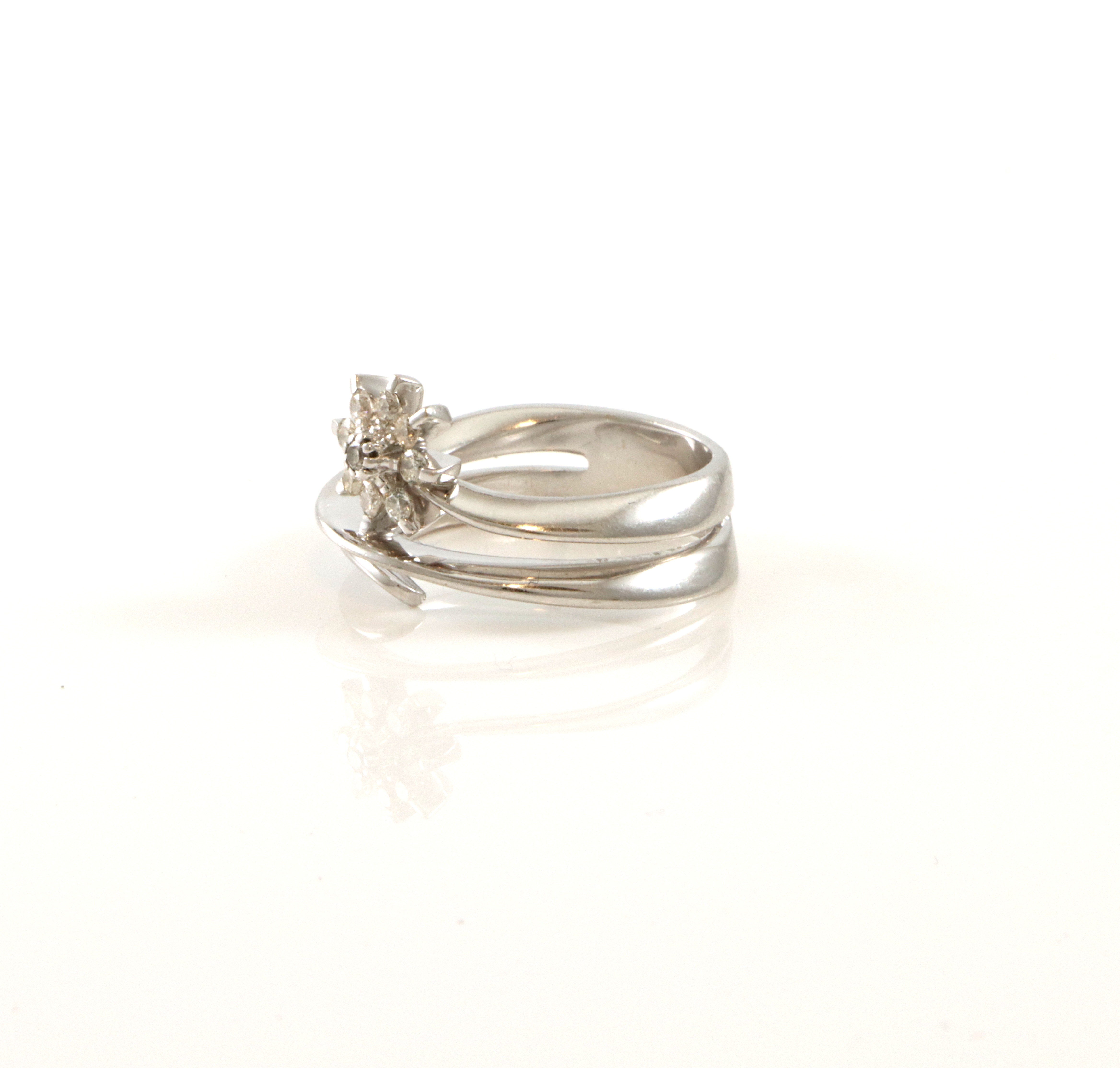 Ringstørrelse: 53 Diameter rosett: 8 mm Bredde ring: 7 mm Vekt: 5,9 gram Svært pent brukt