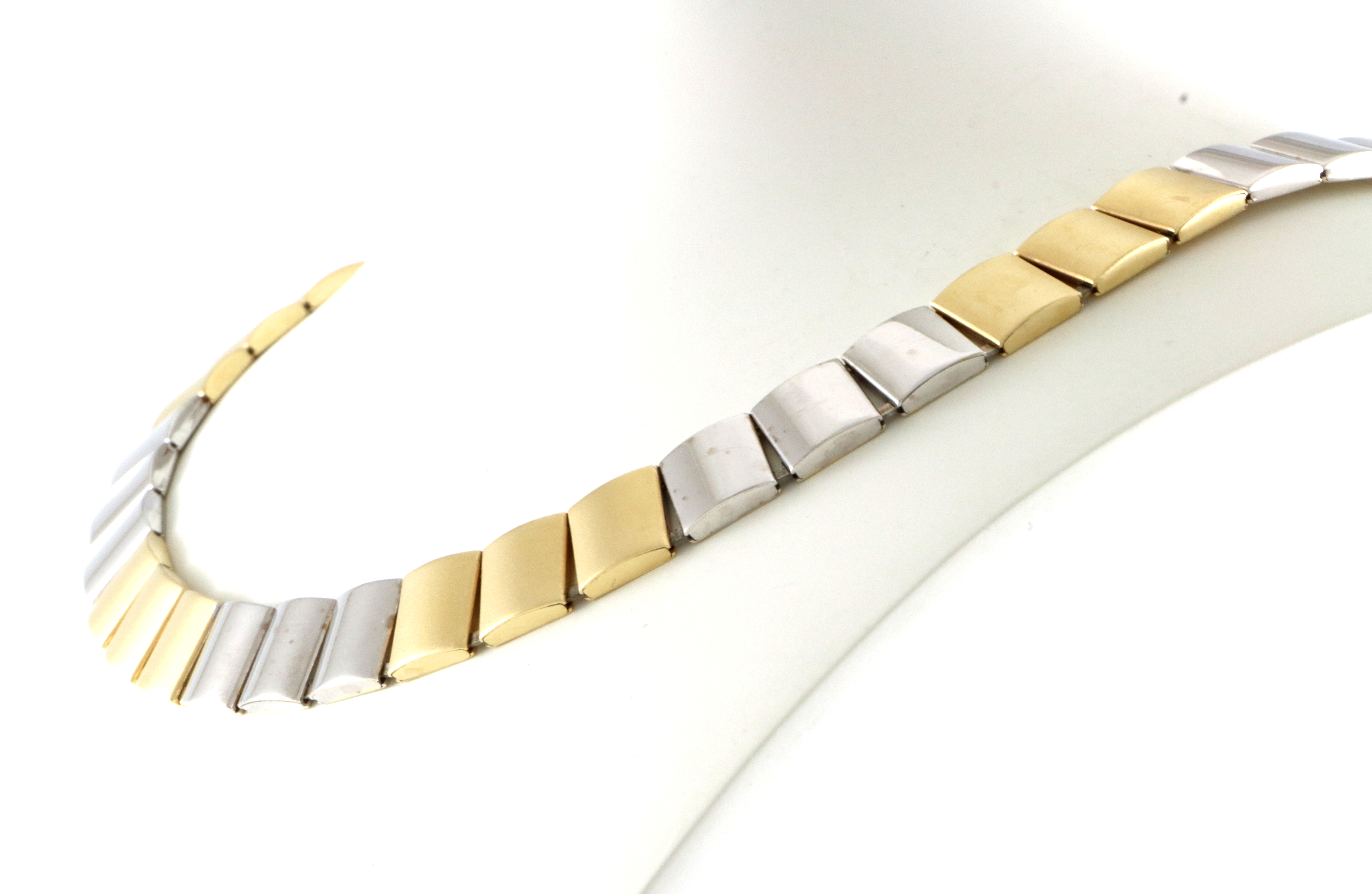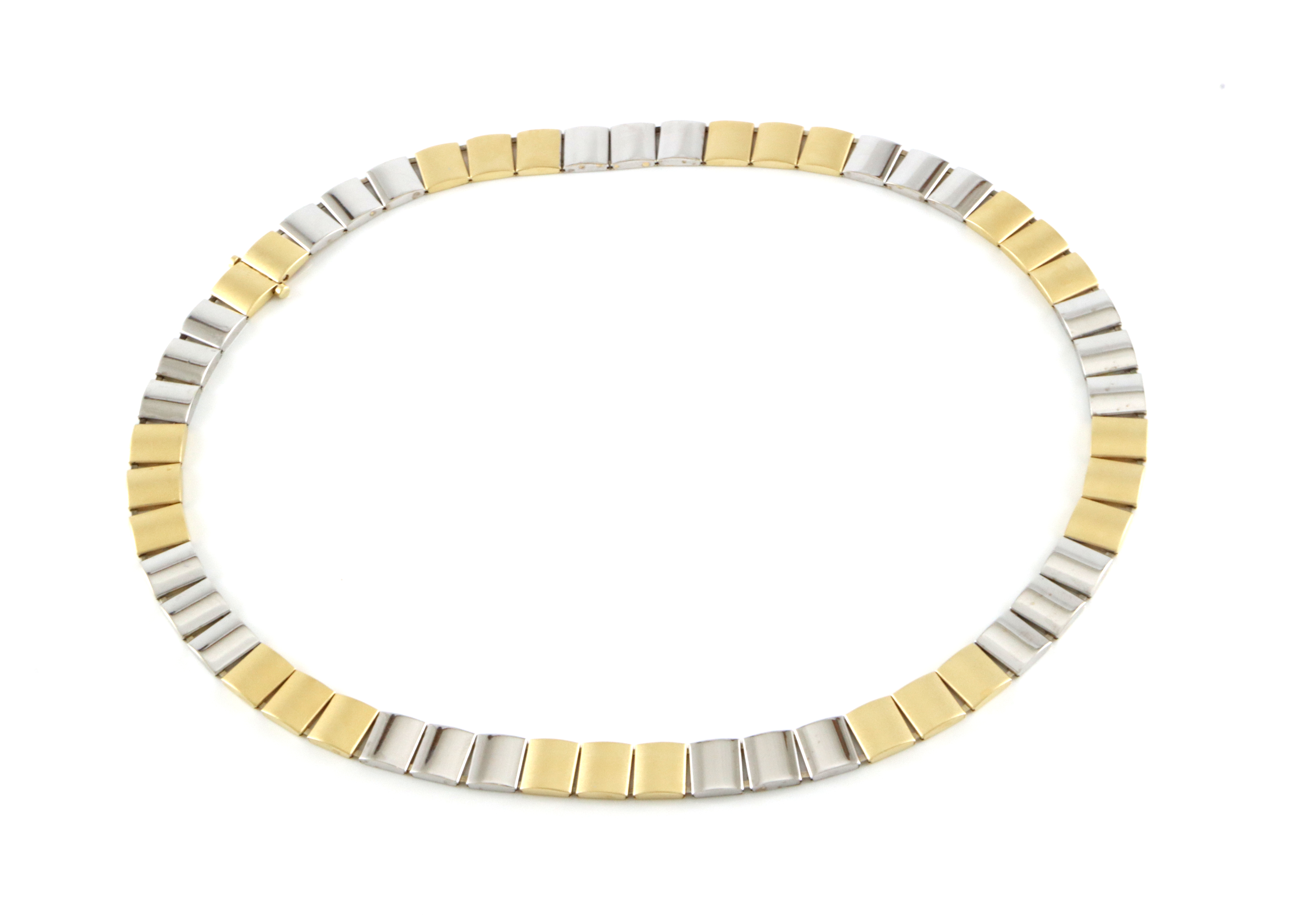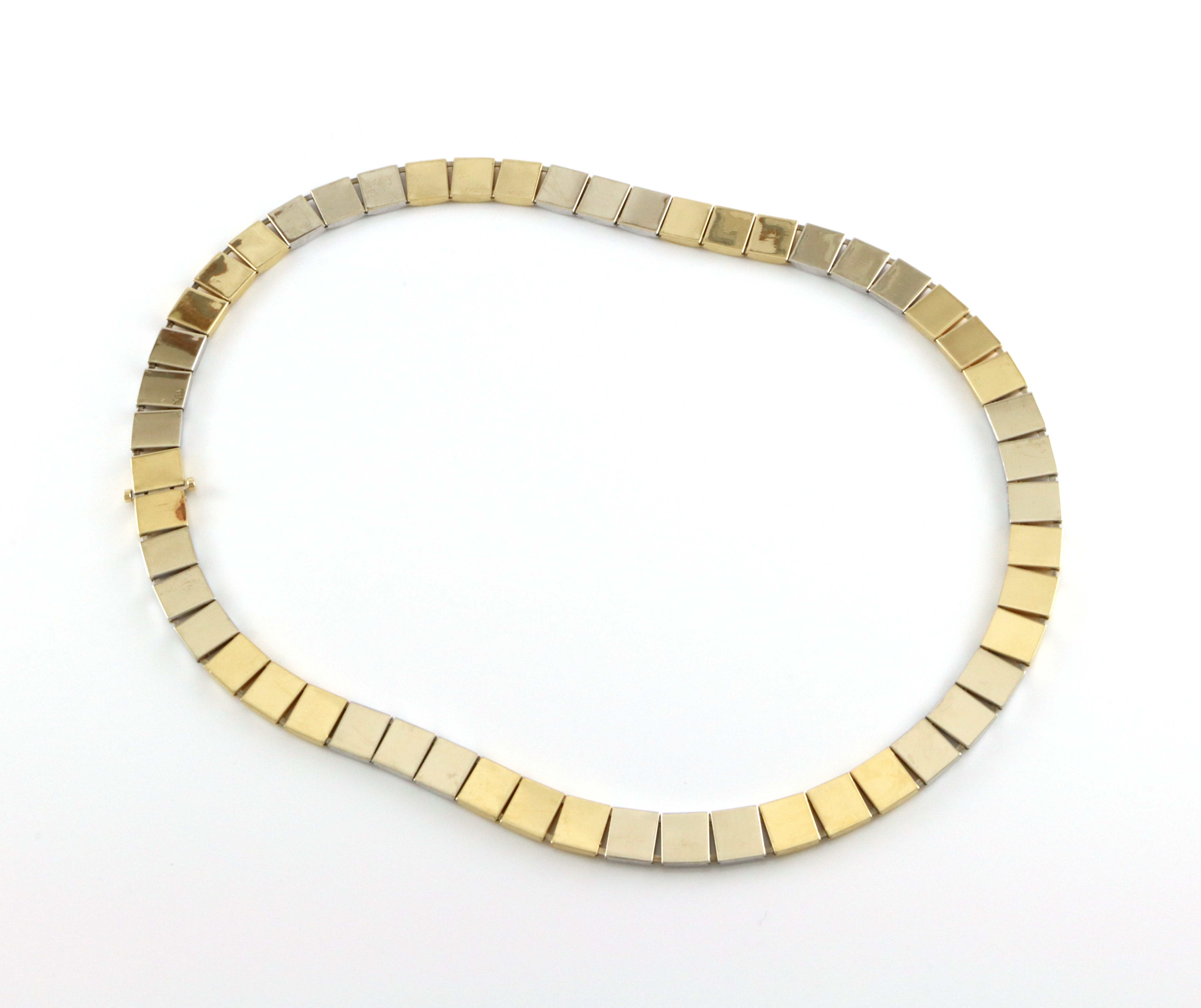 Grislekkert collier som består av firkantete ledd i gult og hvitt gull. Leddene i gult gull er børstet Bredde: 9 mm Lengde: 44 cm Vekt: 37,7 gram Låstype: Kasselås