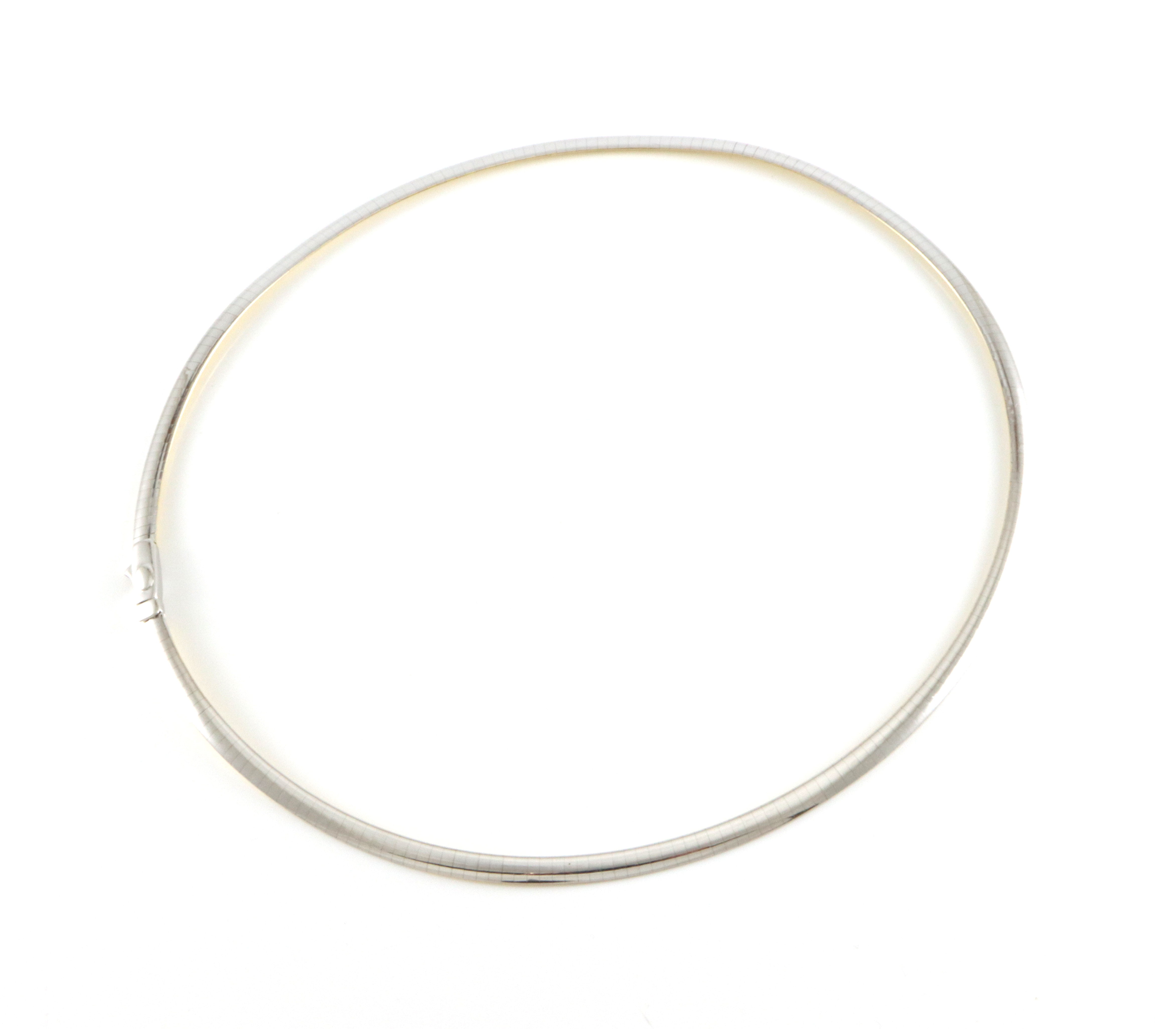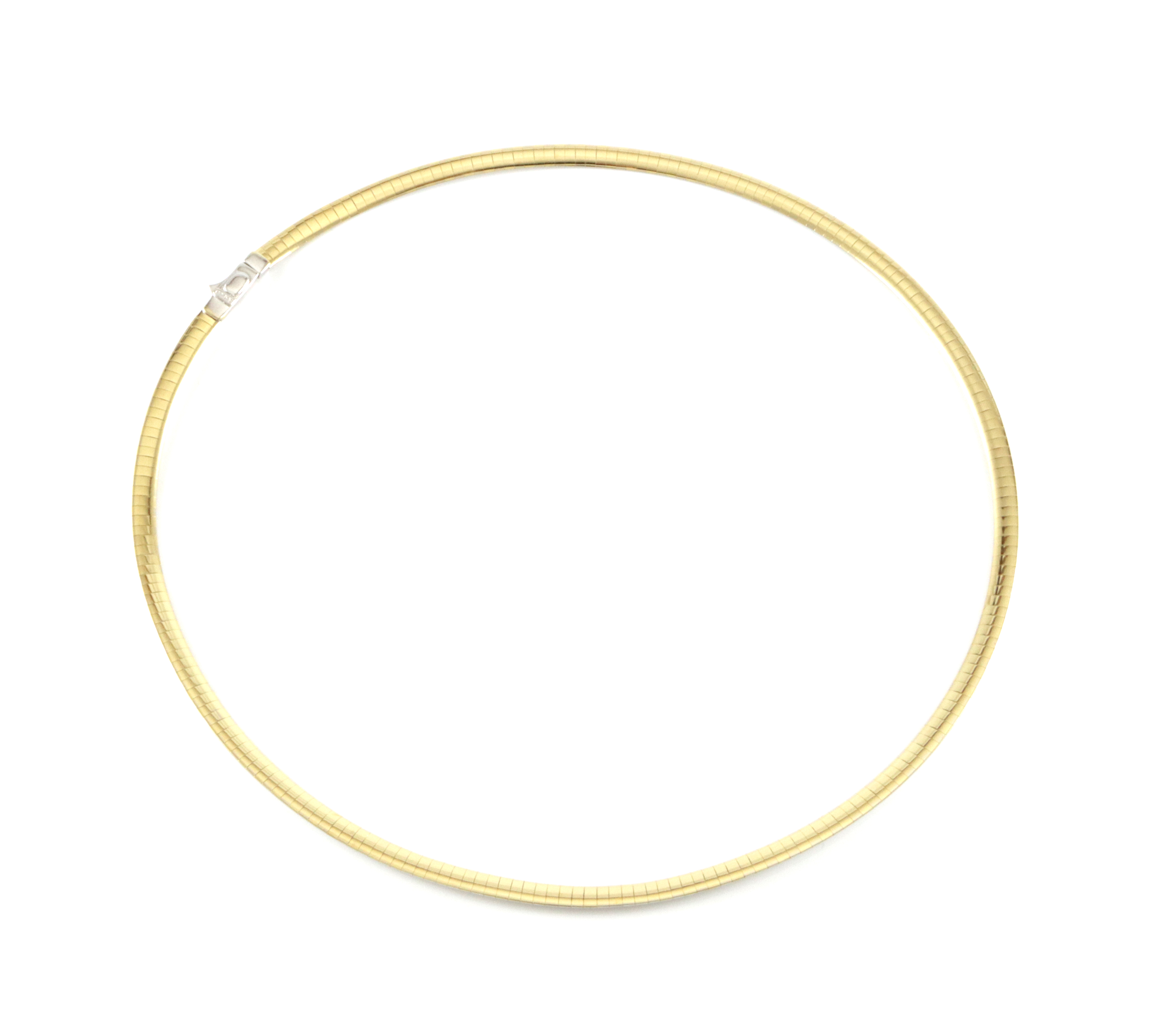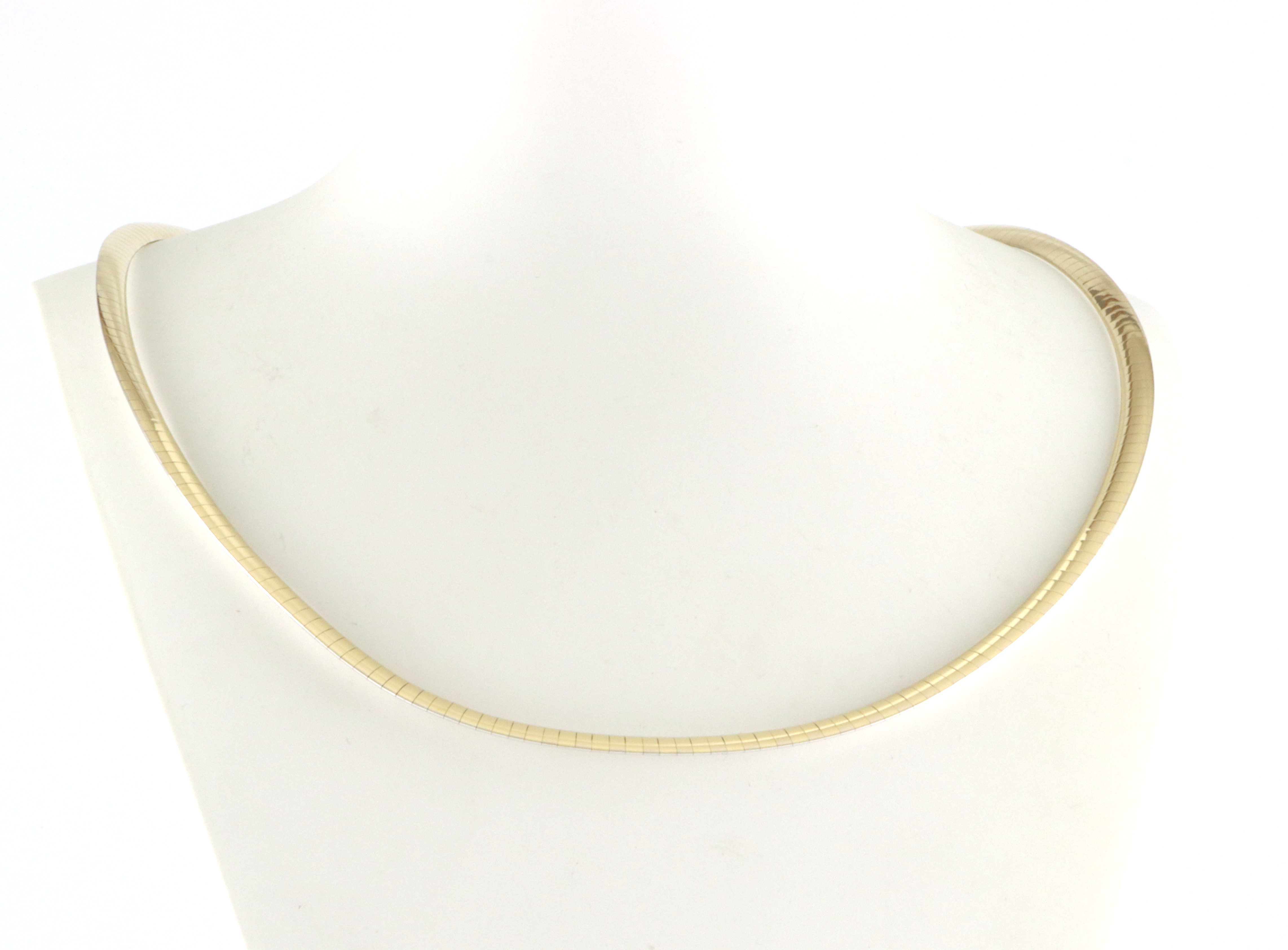 Vendbar collier der den ene siden er gul mens den andre siden er hvitt gull Bredde: 4 mm Lengde: 42 cm Vekt: 20,1 gram Låstype: Kasselås
